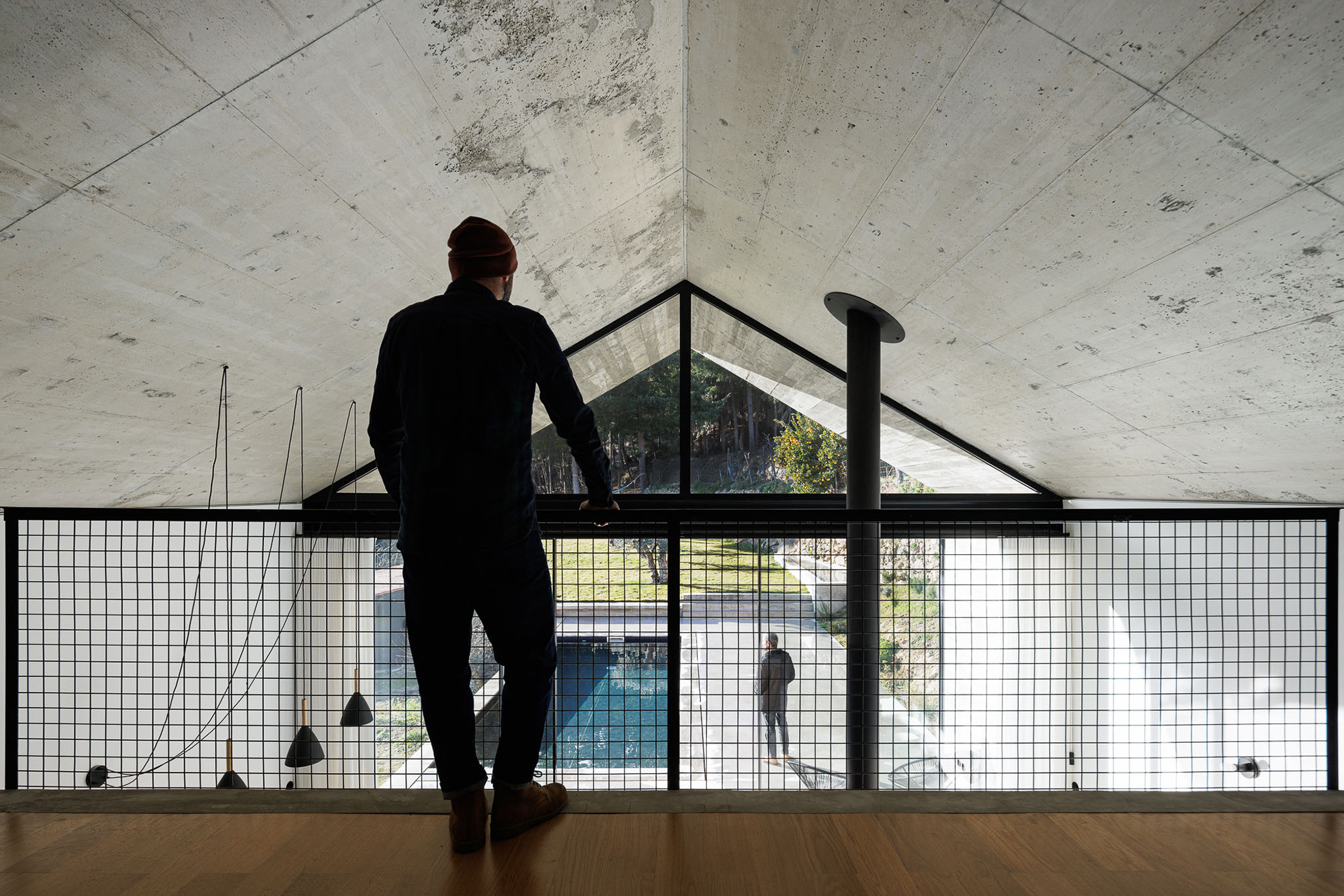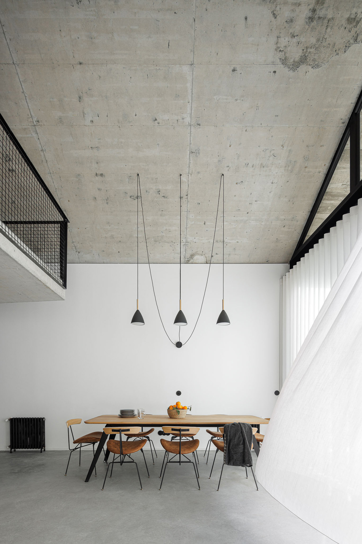 The architects positioned the extension on an existing terrace that now links the old and new structures. While the granite farmhouse contains sanitary and technical facilities along with storage, the concrete volumes house bedrooms, a kitchen, a living room, and a dining area. The open-plan social zone features rough concrete ceilings and smooth concrete flooring. Wooden furniture brings more warmth to the space, along with a suspended fireplace.