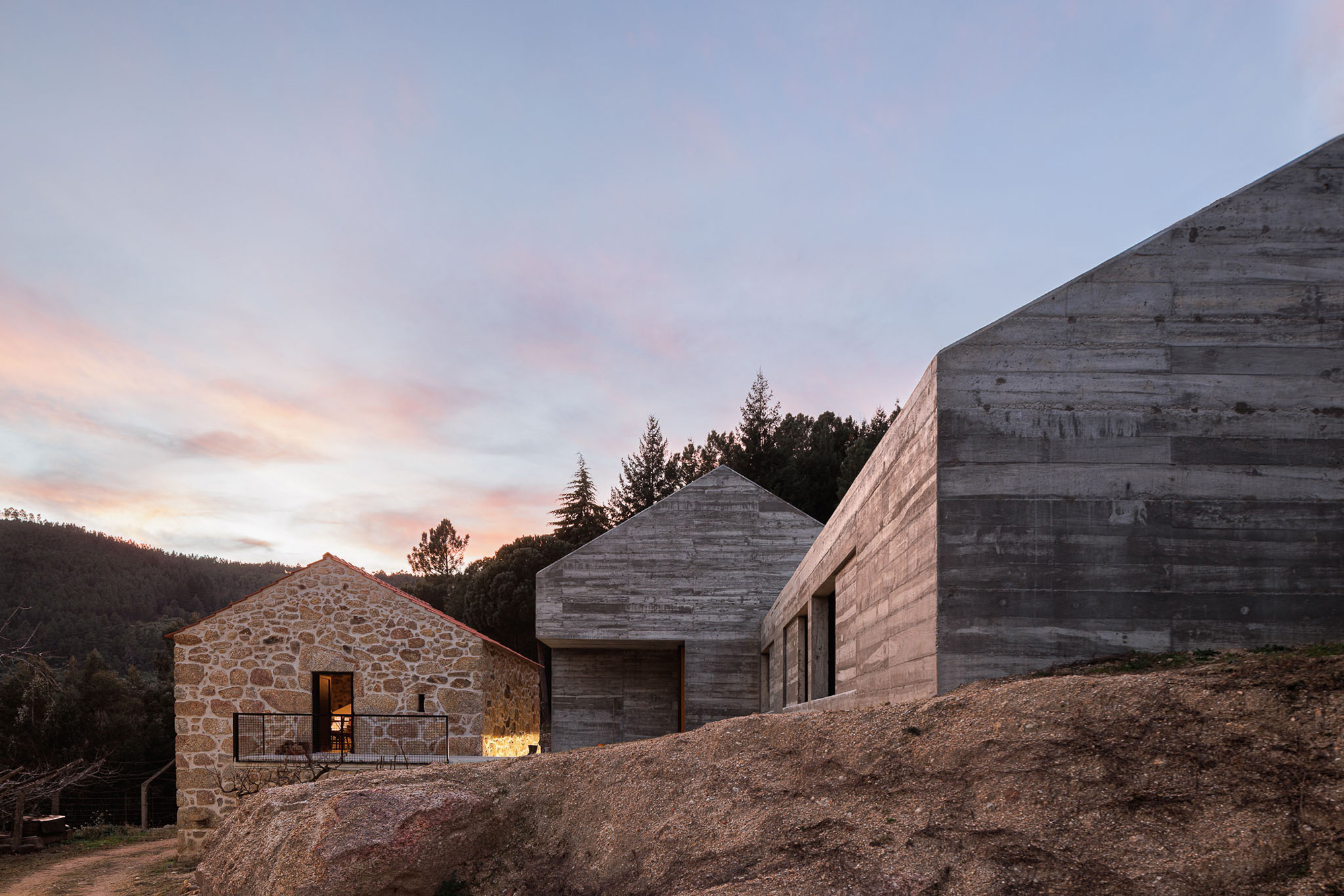 Located Guarda, Portugal, in an area known as Mora, this contemporary extension adds living spaces to an old granite farmhouse, which now can house only utilitarian programs. Architects Filipe Pina and David Bilo collaborated on this project. Named Casa NaMora, the design gives a tongue-in-cheek nod to a word that can be translated either as “in Mora” or as “flirt,” with the two new volumes placed in a direct relationship with the original farmhouse. Similarly to the original building, the two connected volumes have gabled roofs and simple, archetypal forms reminiscent of traditional barns. However, they boast board-formed concrete walls with a rough texture.
