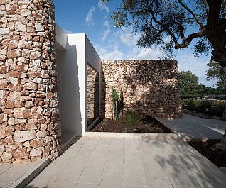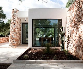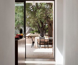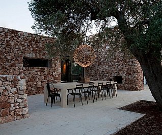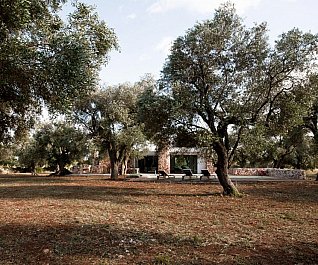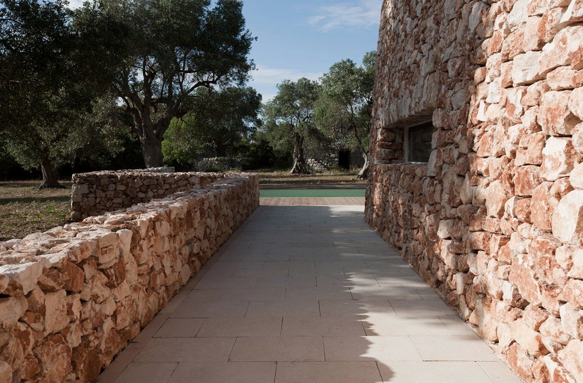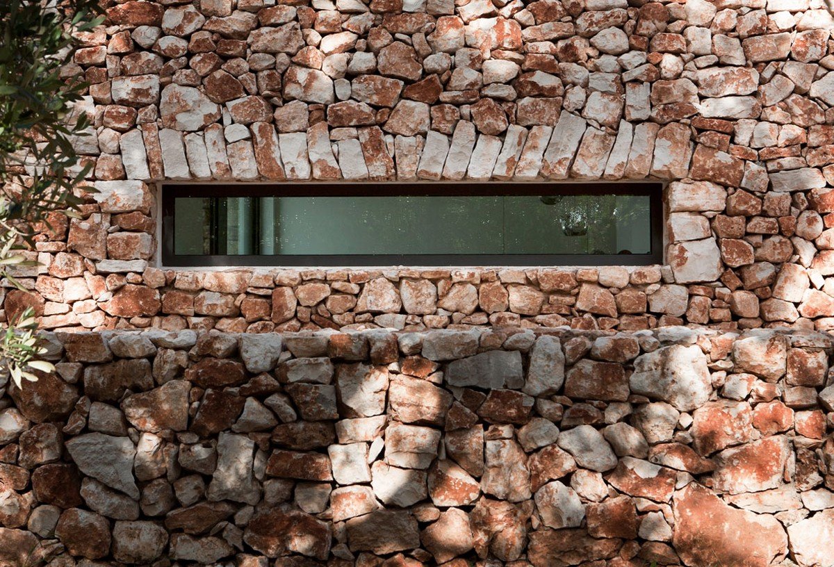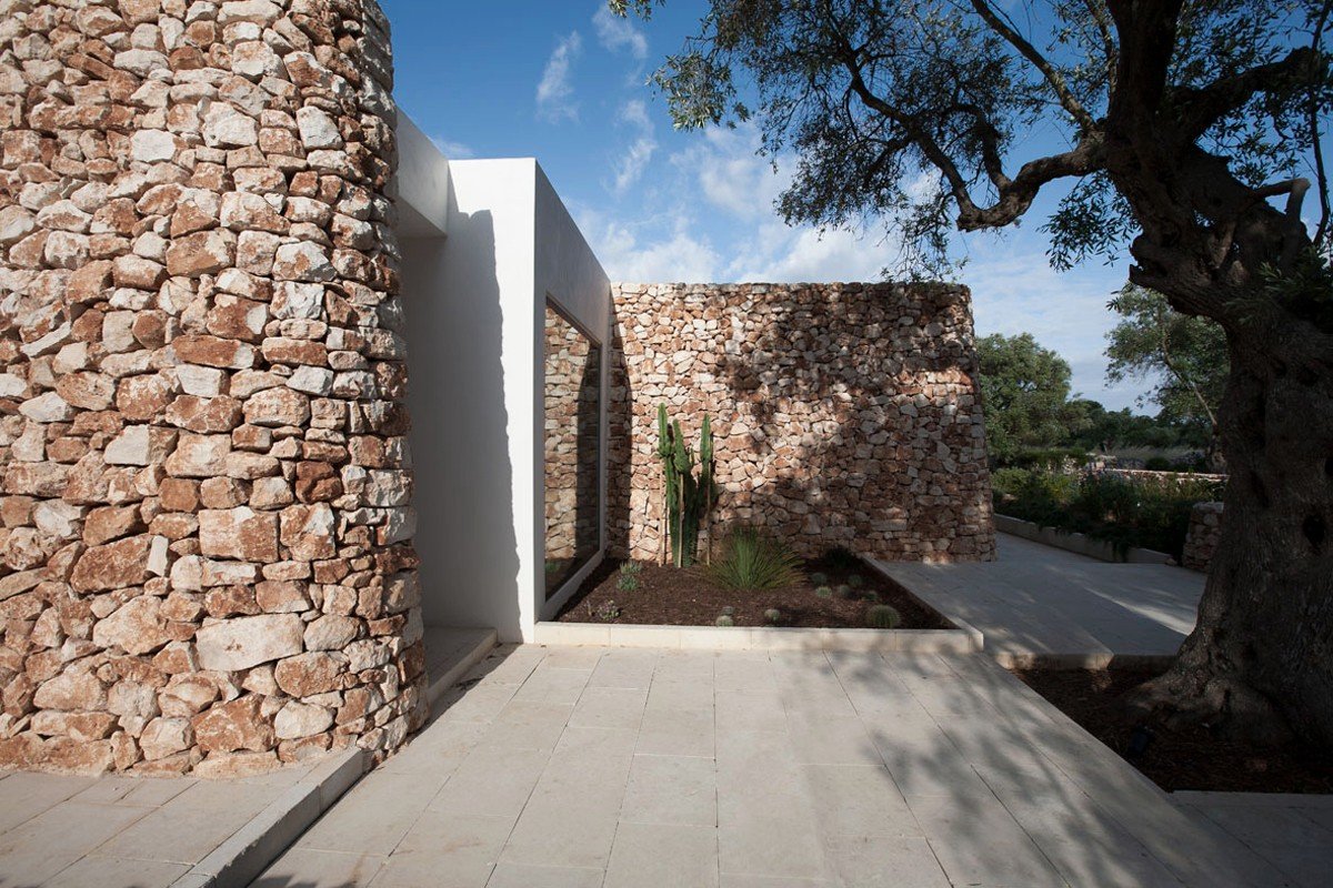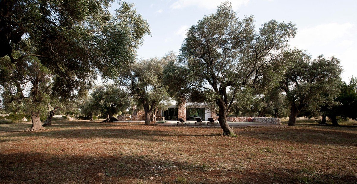 Casa nel bosco di ulivi – meaning “house in the olive grove” – sounds like a divine place, and the truth is not far from this impression created by Luca Zanaroli Architects. Located in Morciano di Leuca, Puglia, Italy, this residence of masonry construction is surrounded by olive trees, and embraces its arboreal friends. The house is supported by walls built up from stones that have been extracted from the site. To preserve the natural look, the stones are deliberately left dirty, and even give the pillars of stone an outfit that mimics the bark of the olive trees. In contrast, white lime plaster walls demarcate the living spaces as well as the exterior dining space and pool. For this rustic, outdoor dining area, a spherical chandelier hangs entangled in a tree, providing a softly lit ambience. The delicacy of these furnishing details tempers the weathered look of the house’s exterior materiality. Inside the house, a rectangular skylight stretches over the earthen kitchen counter while wooden shelves and their wares line the walls. However, it is the bathroom that captures the essence of the space; orthogonal planes form an elegant composition of white and brown, stucco and smooth, tall and long. The use of simple but generous gifts from nature makes this home a space of good, down-to-earth living.