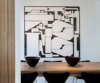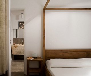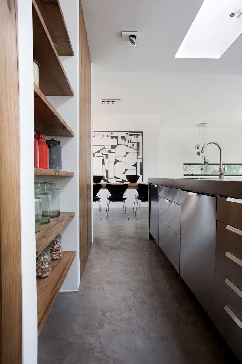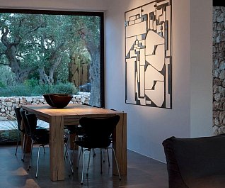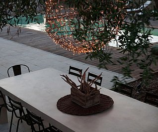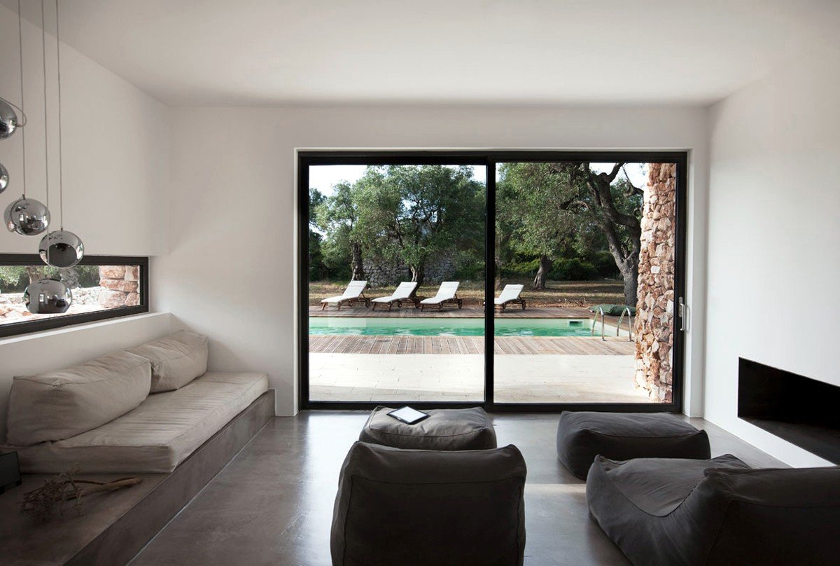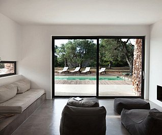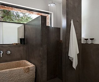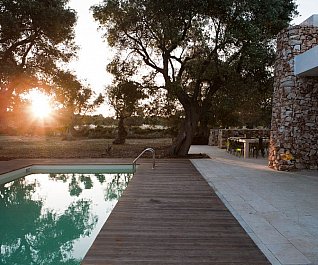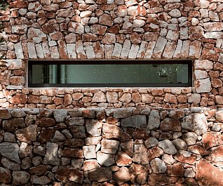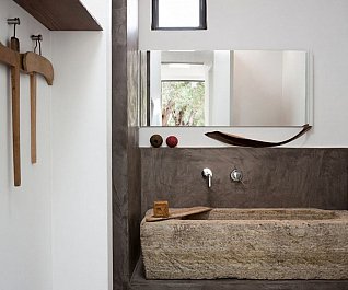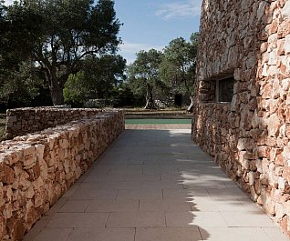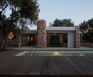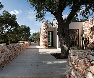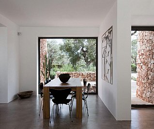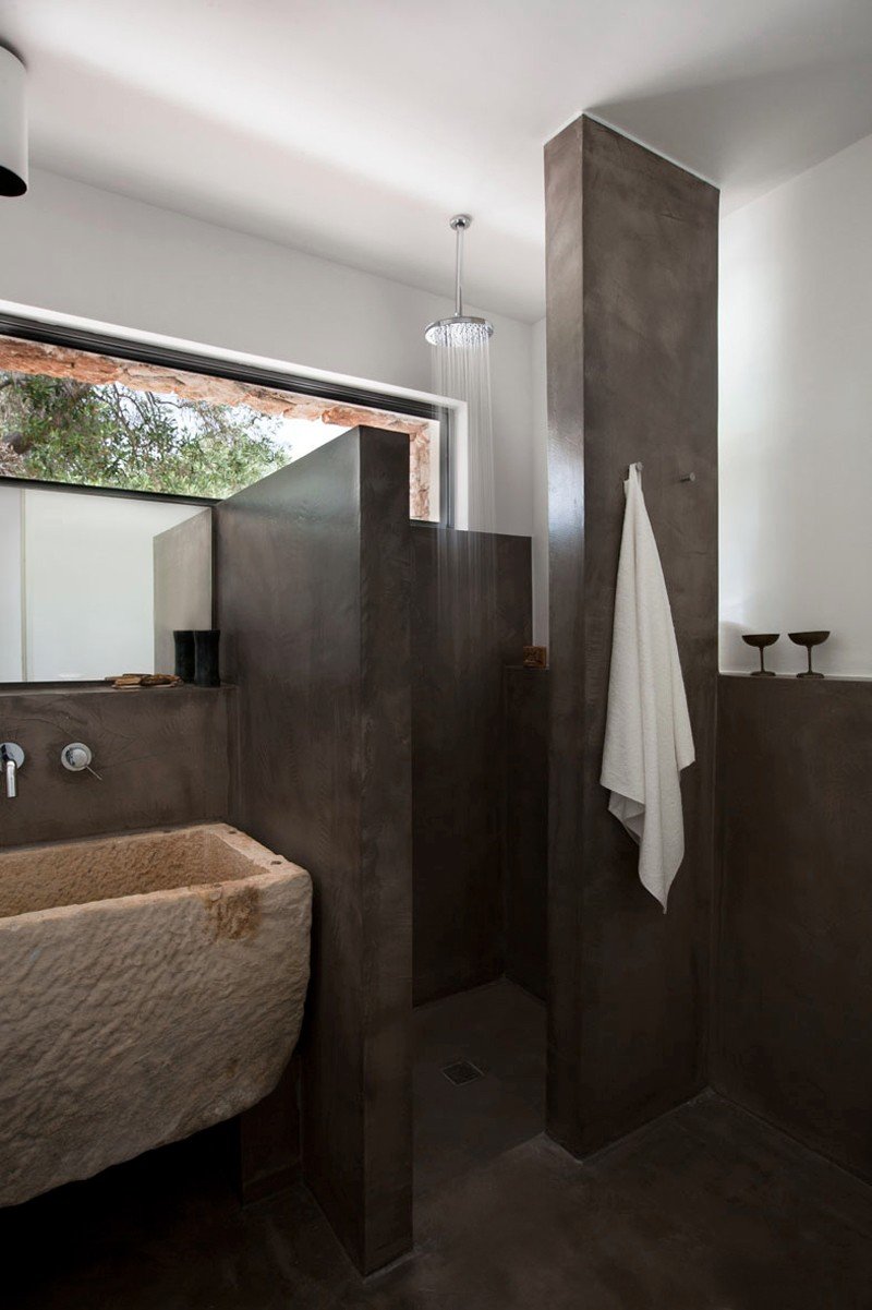 Casa nel bosco di ulivi – meaning “house in the olive grove” – sounds like a divine place, and the truth is not far from this impression created by Luca Zanaroli Architects. Located in Morciano di Leuca, Puglia, Italy, this residence of masonry construction is surrounded by olive trees, and embraces its arboreal friends. The house is supported by walls built up from stones that have been extracted from the site. To preserve the natural look, the stones are deliberately left dirty, and even give the pillars of stone an outfit that mimics the bark of the olive trees. In contrast, white lime plaster walls demarcate the living spaces as well as the exterior dining space and pool. For this rustic, outdoor dining area, a spherical chandelier hangs entangled in a tree, providing a softly lit ambience. The delicacy of these furnishing details tempers the weathered look of the house’s exterior materiality. Inside the house, a rectangular skylight stretches over the earthen kitchen counter while wooden shelves and their wares line the walls. However, it is the bathroom that captures the essence of the space; orthogonal planes form an elegant composition of white and brown, stucco and smooth, tall and long. The use of simple but generous gifts from nature makes this home a space of good, down-to-earth living.