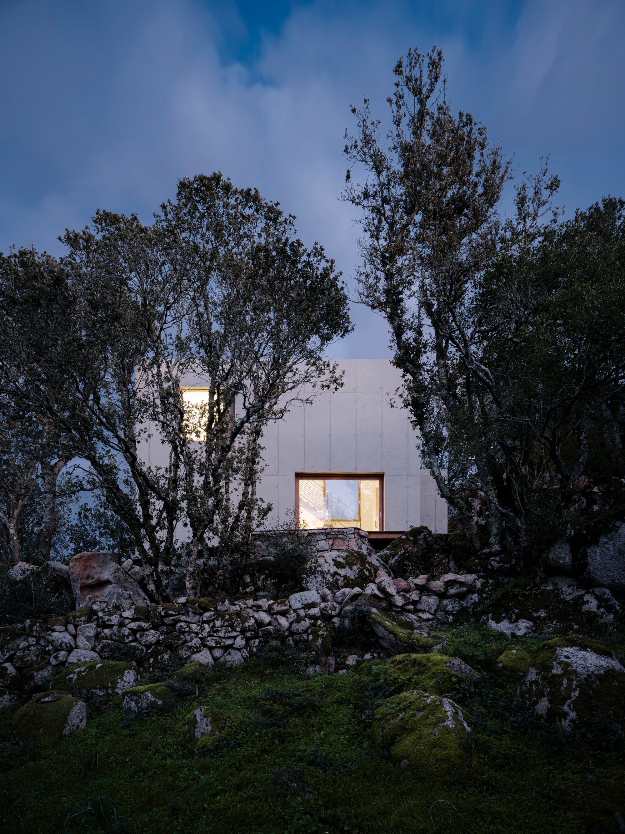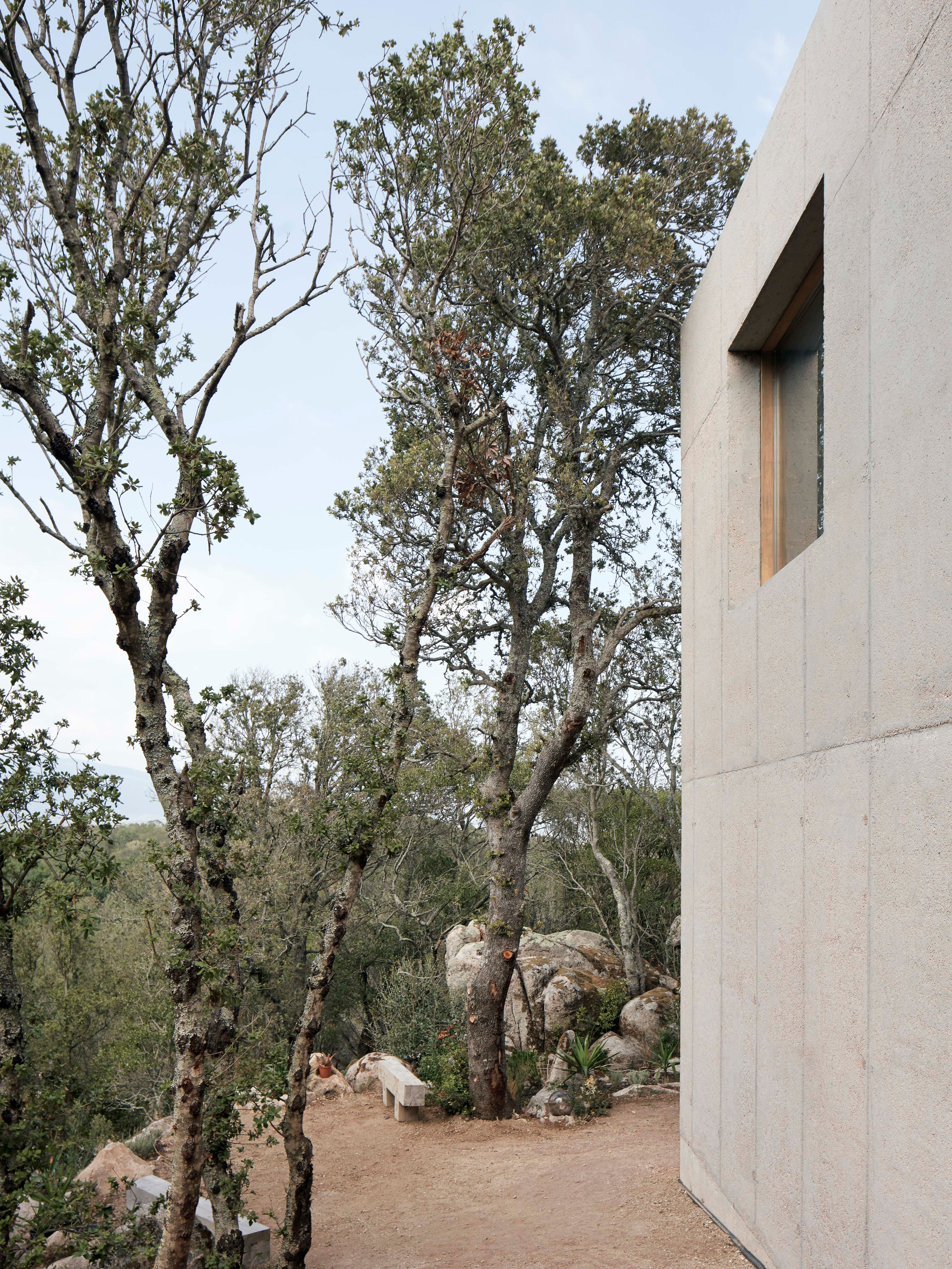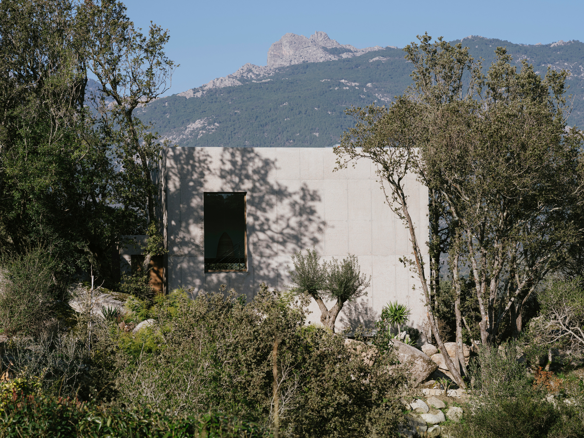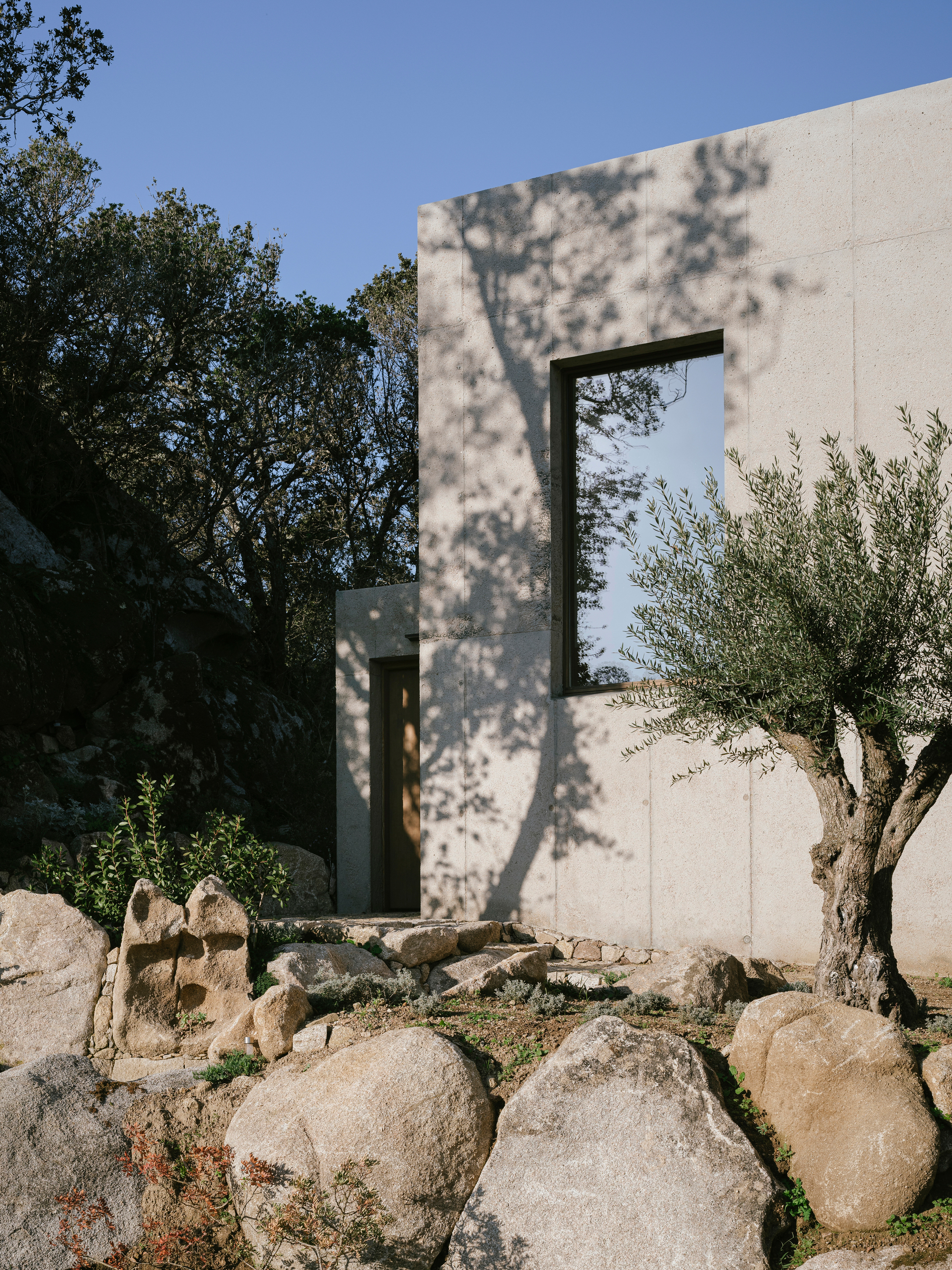A minimalist concrete house nestled in a rocky landscape on the island of Corsica.