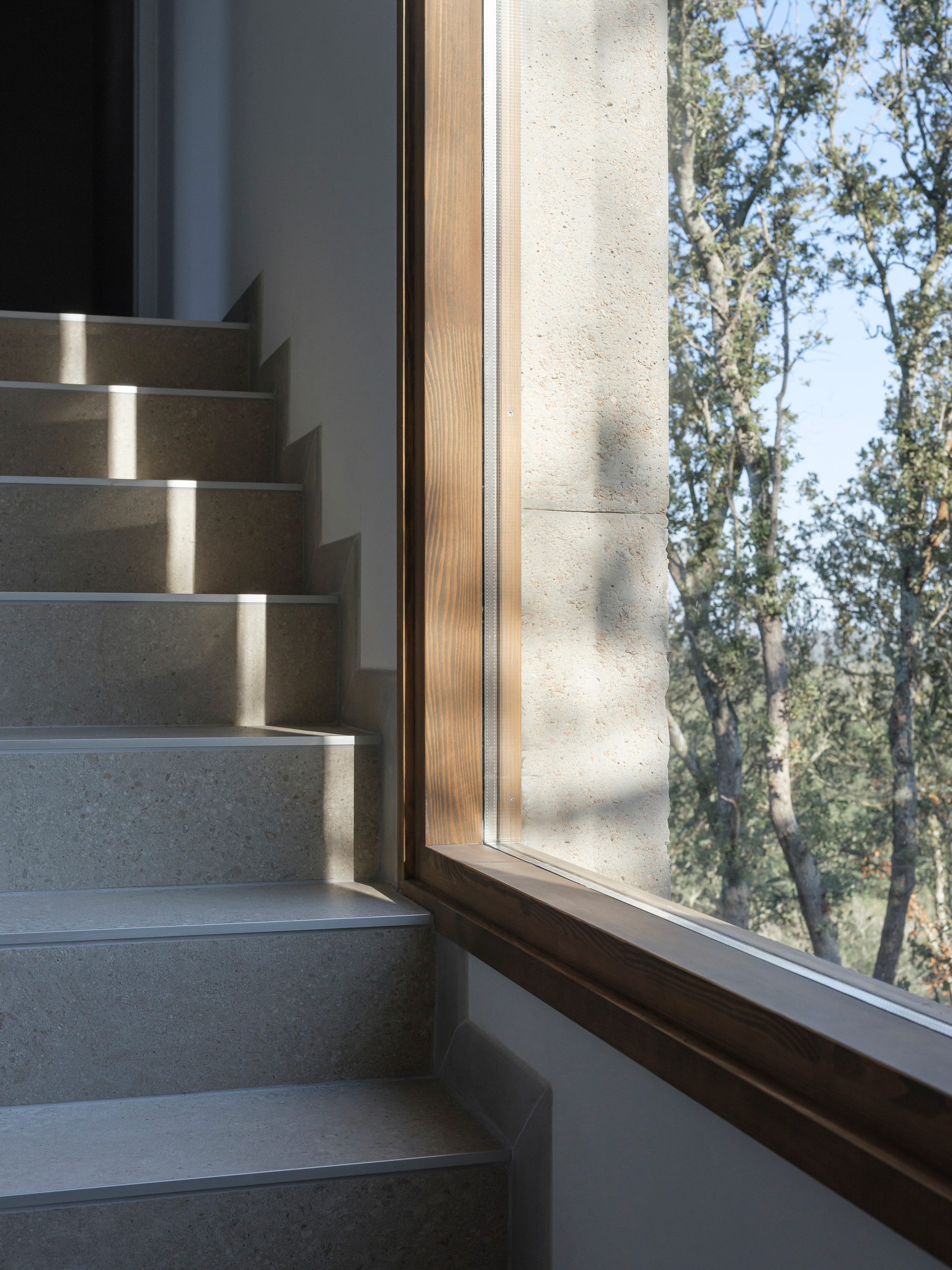 Located in the outskirts of the Sotta village on the island of Corsica, Casa R nestles into a natural landscape with ease thanks to a minimalist design. French architecture firm Orma Architettura designed the concrete house with a simple rectangular form inserted in between existing rock formations on a sloping area with a huge vertical drop. Furthermore, the house has a compact footprint and rises vertically to minimize its impact on the site. At the same time, the vertical orientation makes the most of the views towards L’uomo di Cagna mountain range. The exterior walls boast a sandblasted finish and a brighter gray hue as well as a subtle texture.