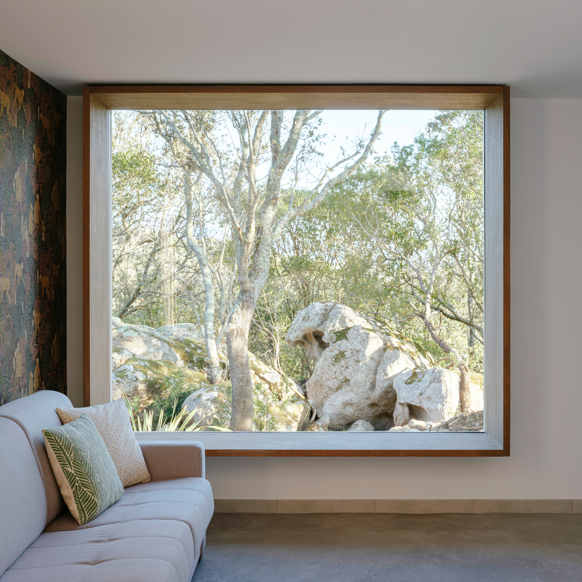 Inside, the studio preserved the minimalist aesthetic but used wood for the window frames to bring more warmth to the living spaces. The height of the rooms varies along with the size of the windows; in some rooms, the openings effectively become partially glazed walls, while in others they frame the landscape with large frames. Concrete flooring complements the white walls, the simple furniture in neutral colors, and other wood accents. A sofa with accent pillows offers a cozy place to relax in while admiring the views. In the kitchen, a glass sliding door opens the space to the deck area. Mature trees surround the wood decking and immerse the inhabitants into the island’s beautiful landscape. Photographs© David Giancatarina, Julien Kerdraon.