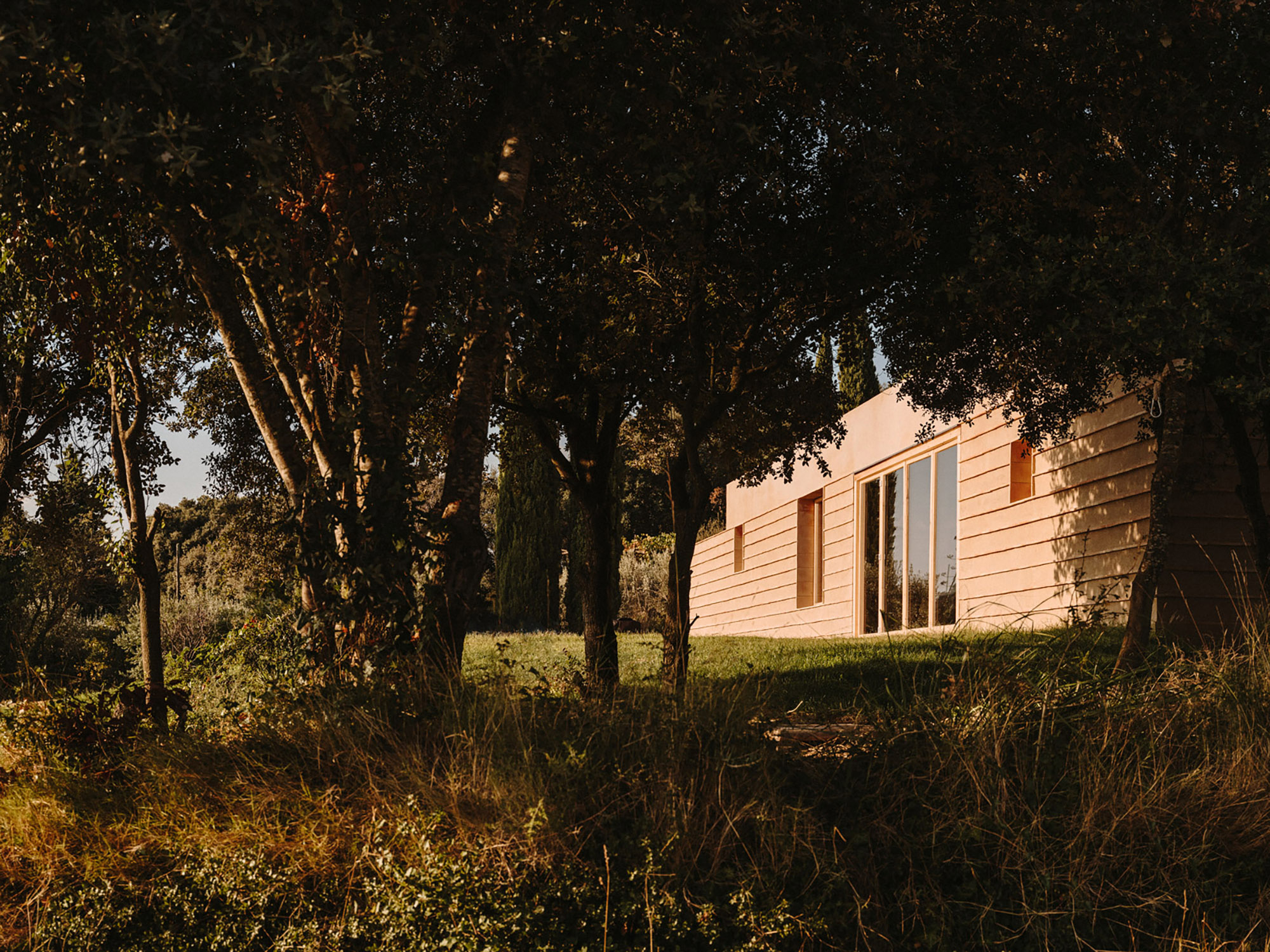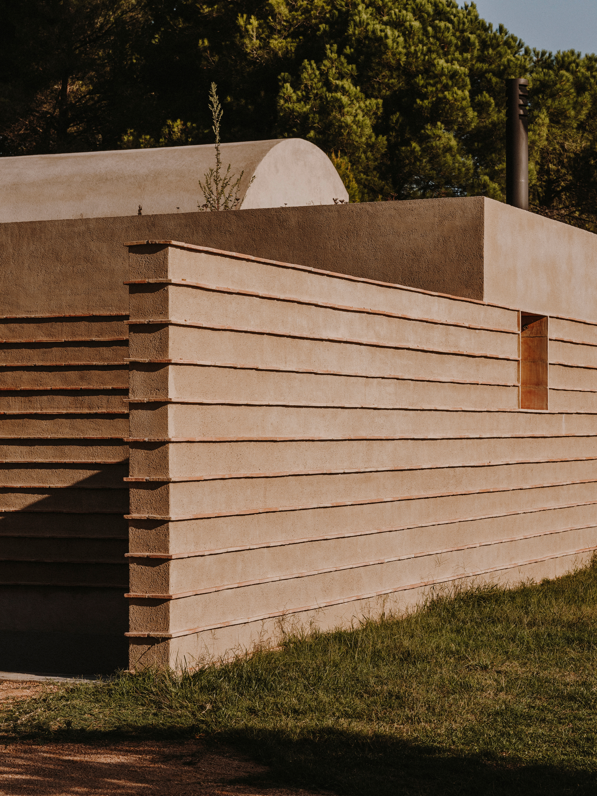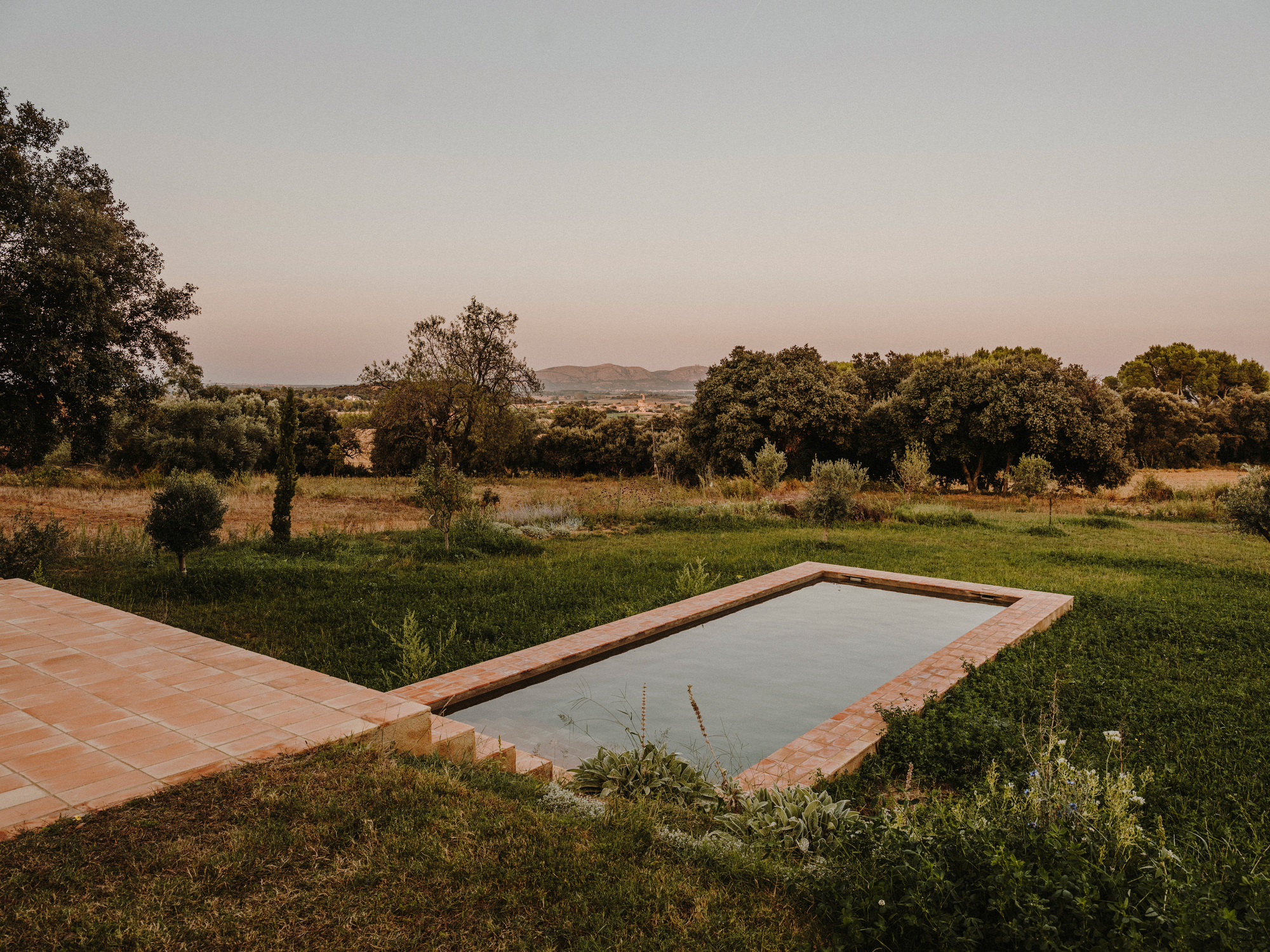 Built in an idyllic landscape in the Baix Empordà county of Catalonia, Spain, Casa Ter celebrates both local traditions and the setting with a contemporary design. Barcelona-based firm Mesura designed the dwelling with two volumes that create three distinct spaces. Apart from using local materials and modern construction techniques that reinterpret tradition, the studio also minimized the house’s impact on the site. The build features a blend of concrete, local river stones, and ceramics from the nearby region of La Bisbal. A warm natural color palette blends the dwelling in the setting further. The three sections of the house each face different views: the sea, the mountains, and the surrounding fields.