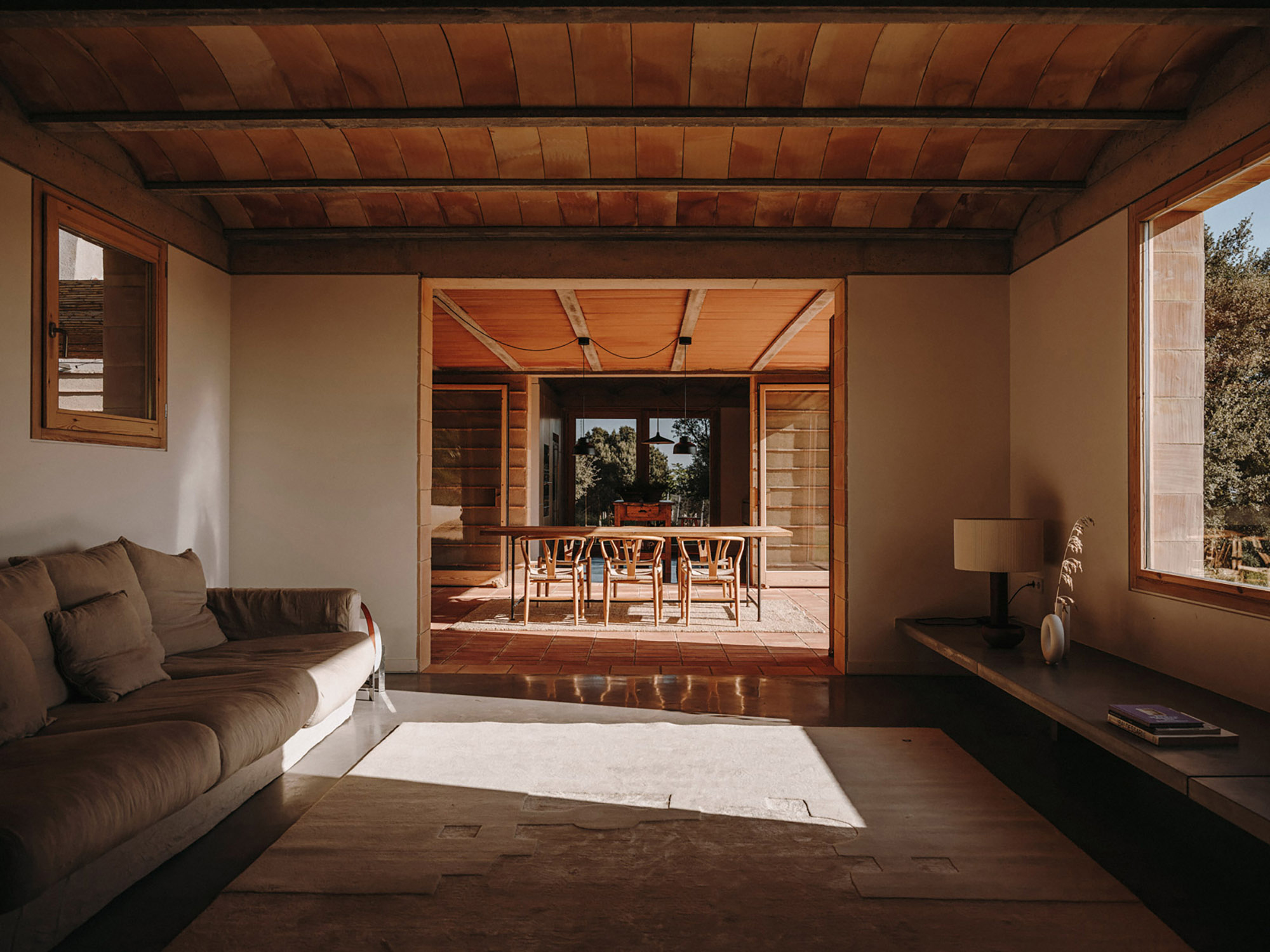 Walking through the entrance, guests reach an enclosed patio created by the L-shaped design. While one volume contains the kitchen and living room along with other social areas, the other functions as a private space with bedrooms and bathrooms. At the meeting point between the two volumes, there’s a part indoor and part outdoor porch. The inhabitants can use the glass sliding doors to open this area to nature. Located on the second floor, the master bedroom boasts a Catalan vaulted ceiling. This room is the only one in the entire house that offers panoramic views of the landscape. The architects also designed steps with ceramic tiles that link the porch and dining area to the swimming pool. Throughout the house, the studio kept the same material palette: polished concrete flooring, ceramics, stone, and wood. Photographs© Salva López.