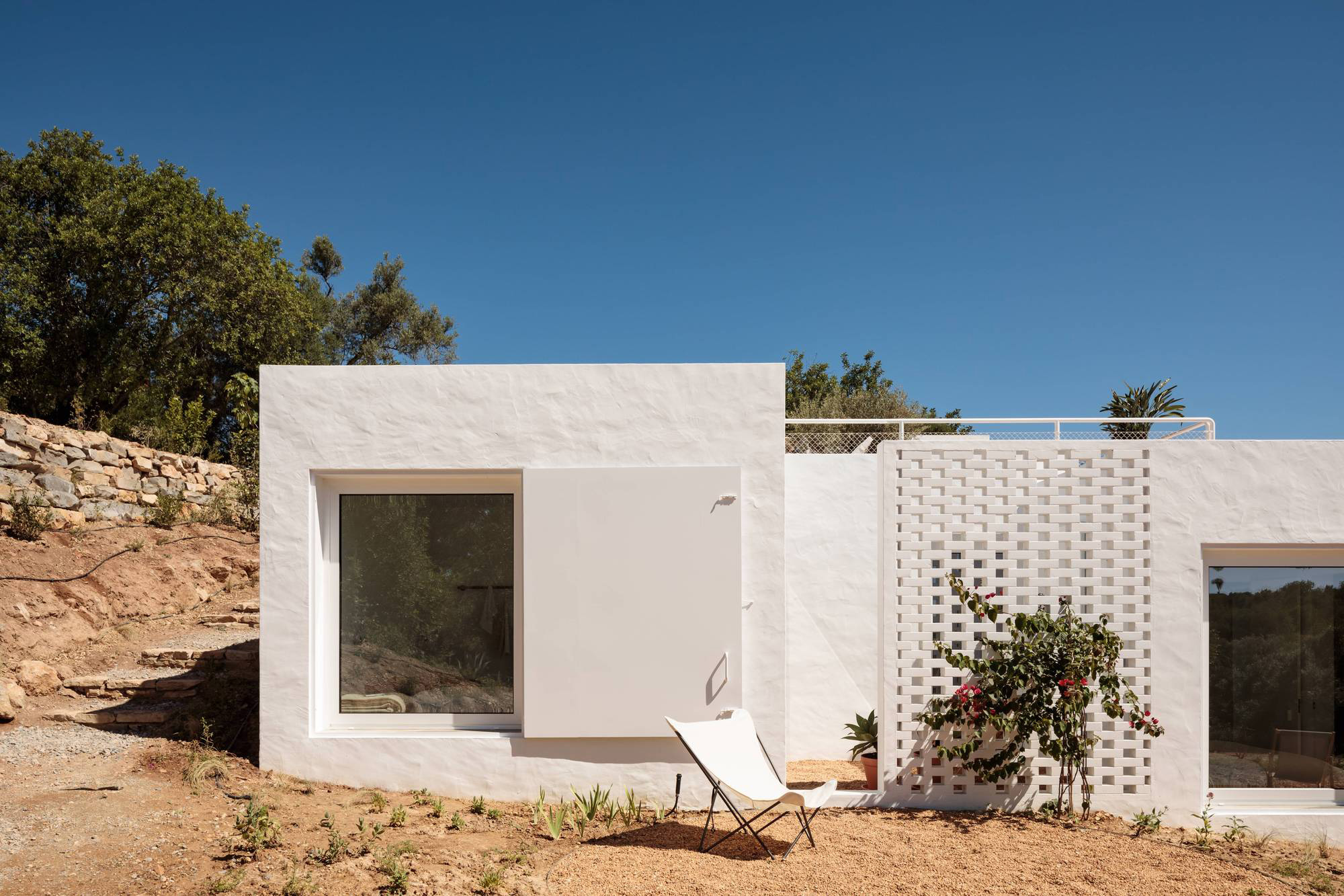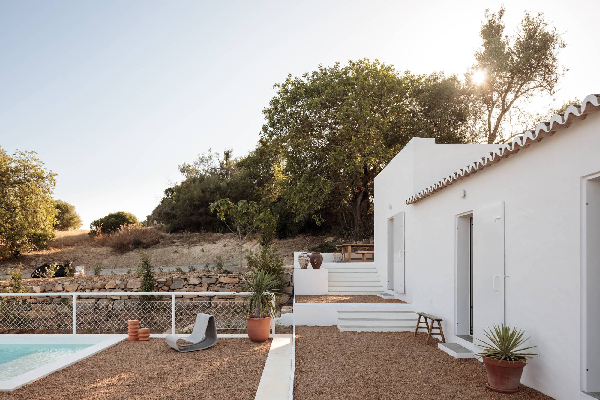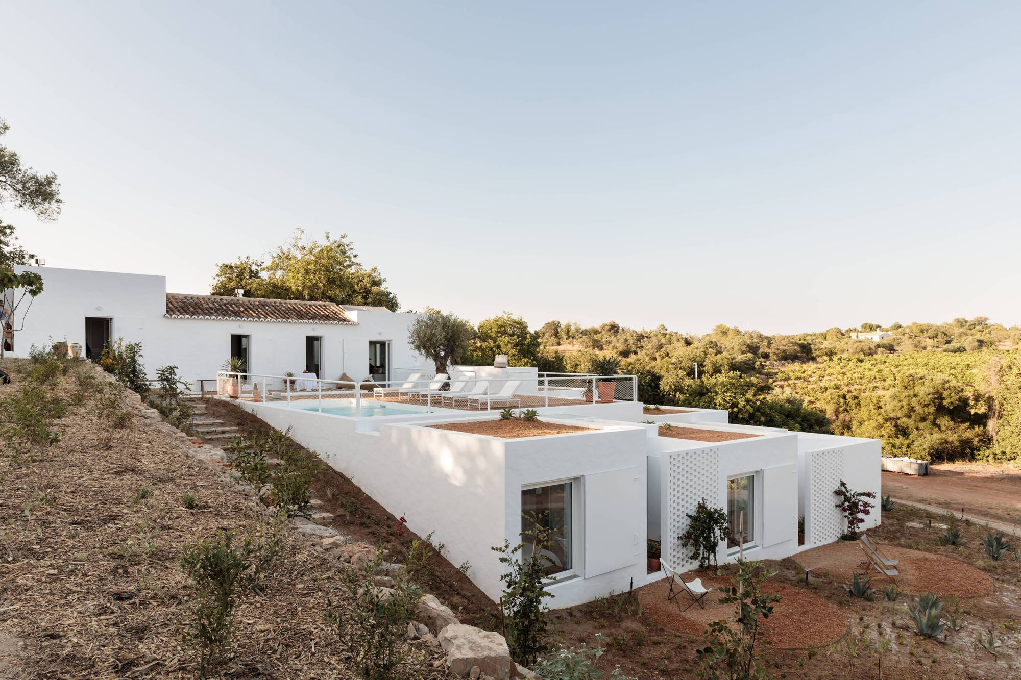 Set in the Estiramantens village in Algarve, Casa Um is a contemporary retreat that welcomes guests into a pastoral landscape. Architecture firm Atelier Rua redesigned and also expanded the former farmhouse, transforming the 19th century building into a modern and cozy hideaway. The house references traditional Portuguese architecture and re-imagines vernacular designs from the Algarve region. The minimalist retreat features several volumes arranged on two levels that follow the slope of the site. In the upper area, there communal areas open to views of the hills as well as the coastline in the distance. On the lower part of the site, the newly built bedrooms provide more privacy.