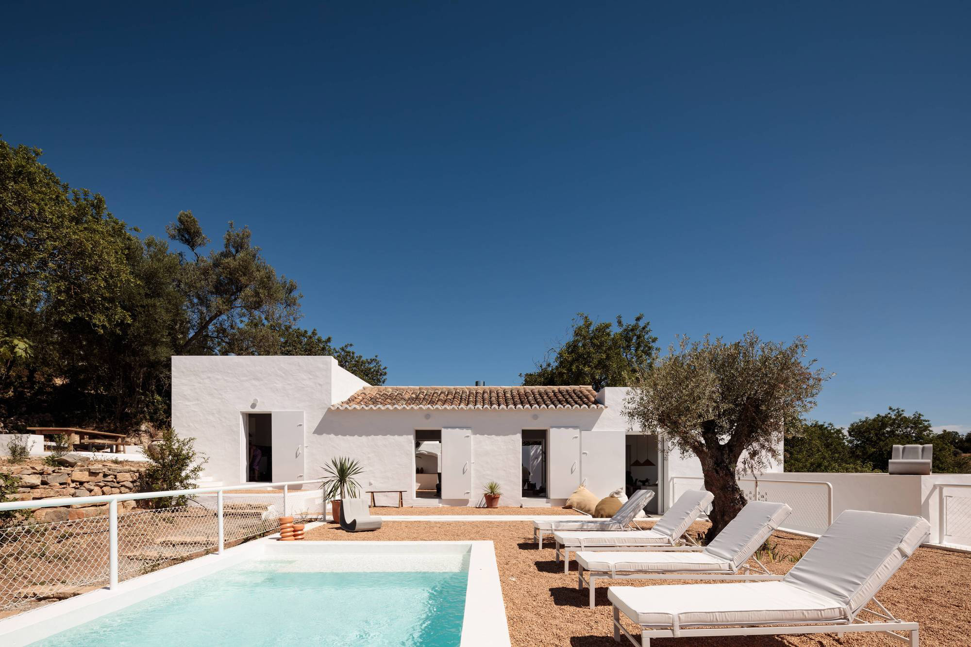 The architects converted the original farmhouse into a modern living room and kitchen. They also transformed the old barn into an interior patio with an original bread oven and a garden. At the rear, the old sheep stables now house a dining room with a wine cellar. This space opens to the heated swimming pool and to the surrounding orange, olive, and almond trees. From the dining room, guests can access the four bedrooms through a set of stairs. Each bedroom has its own bathroom as well as a private patio with hammocks.