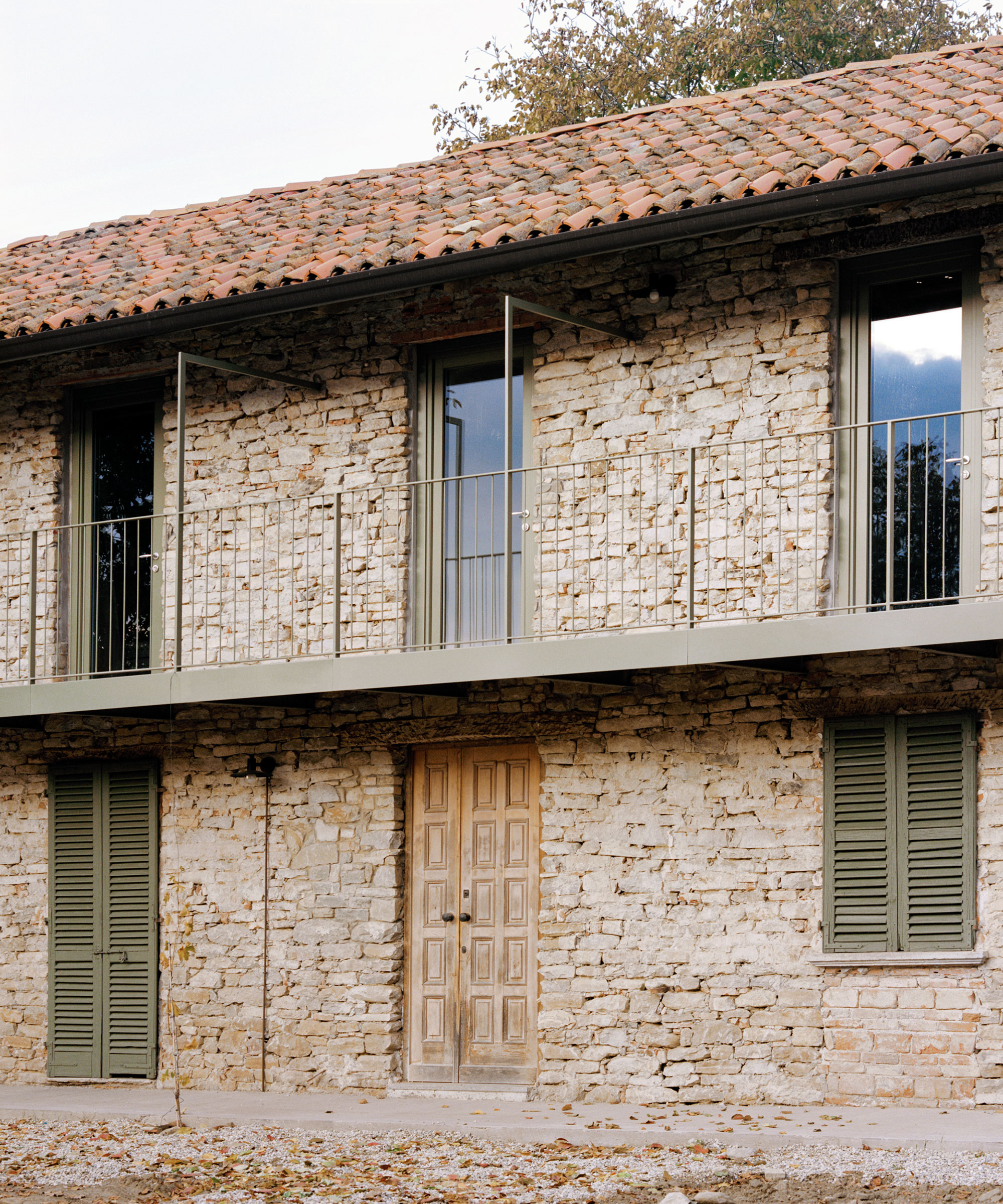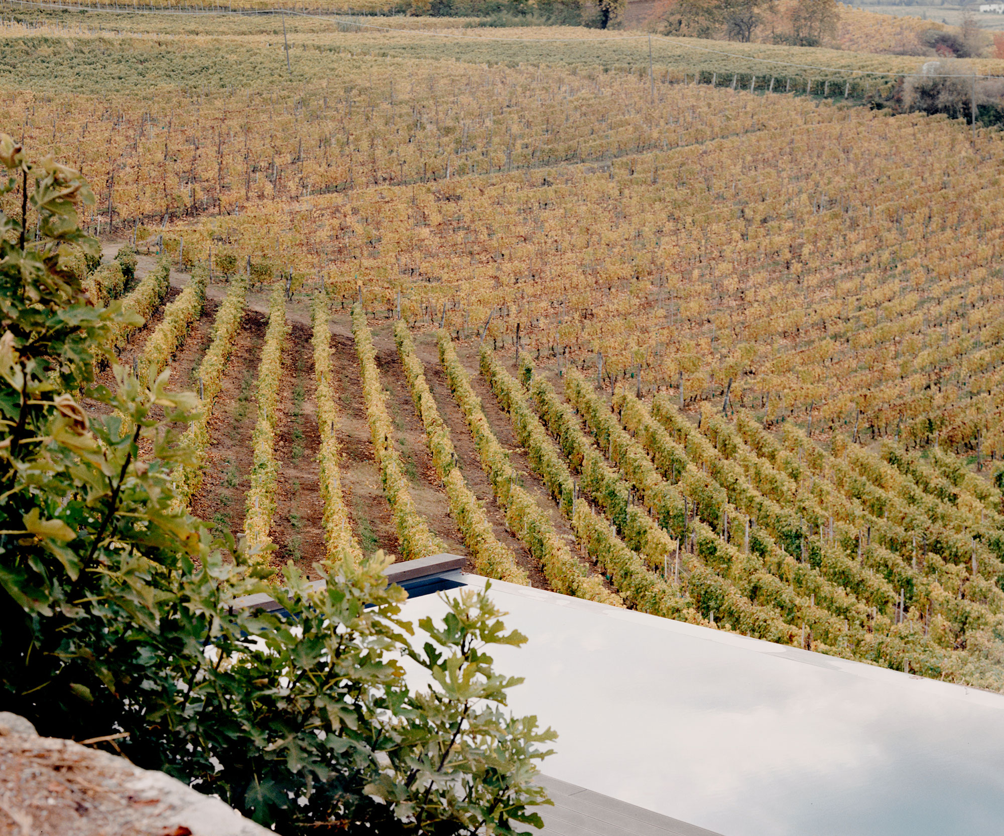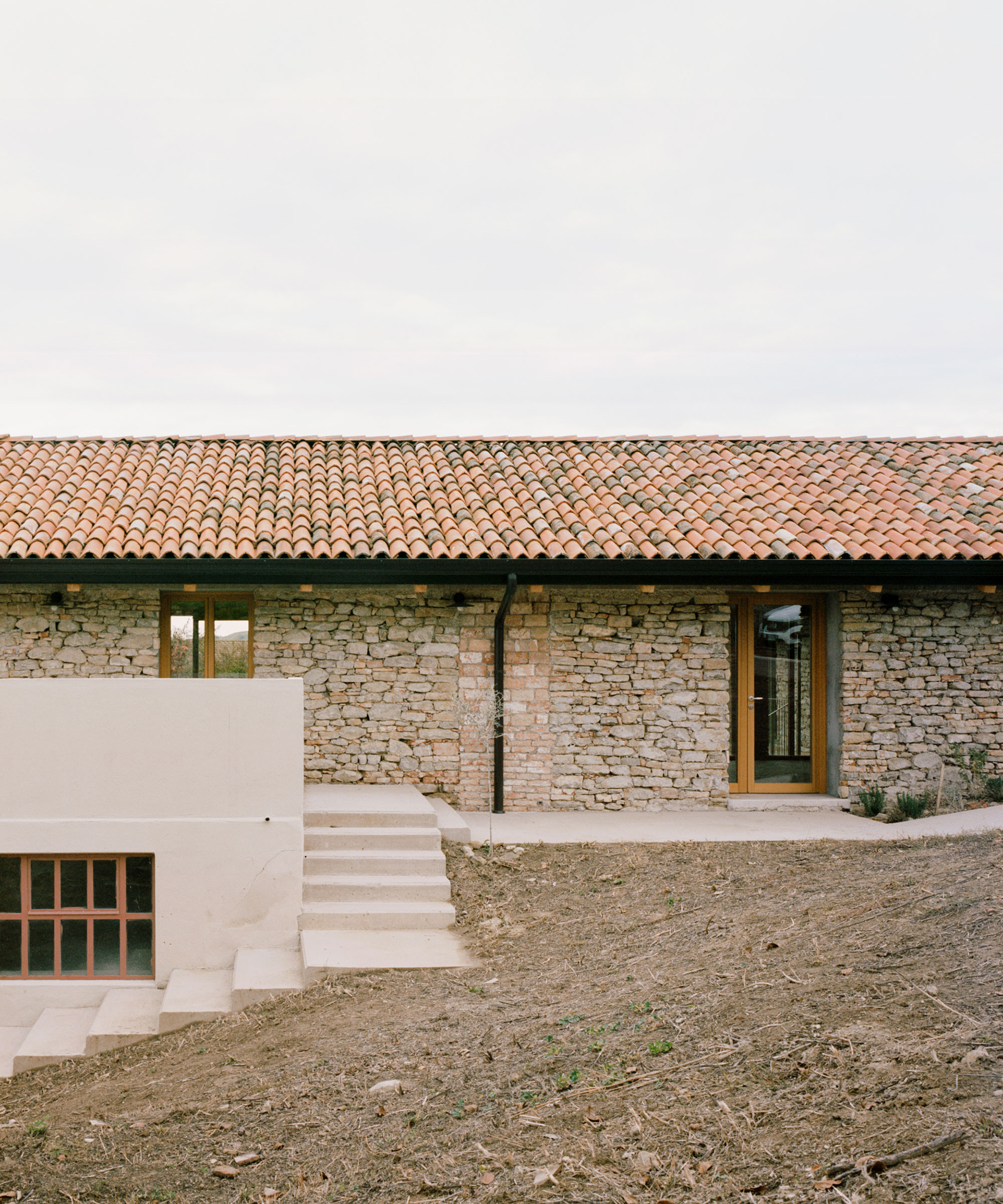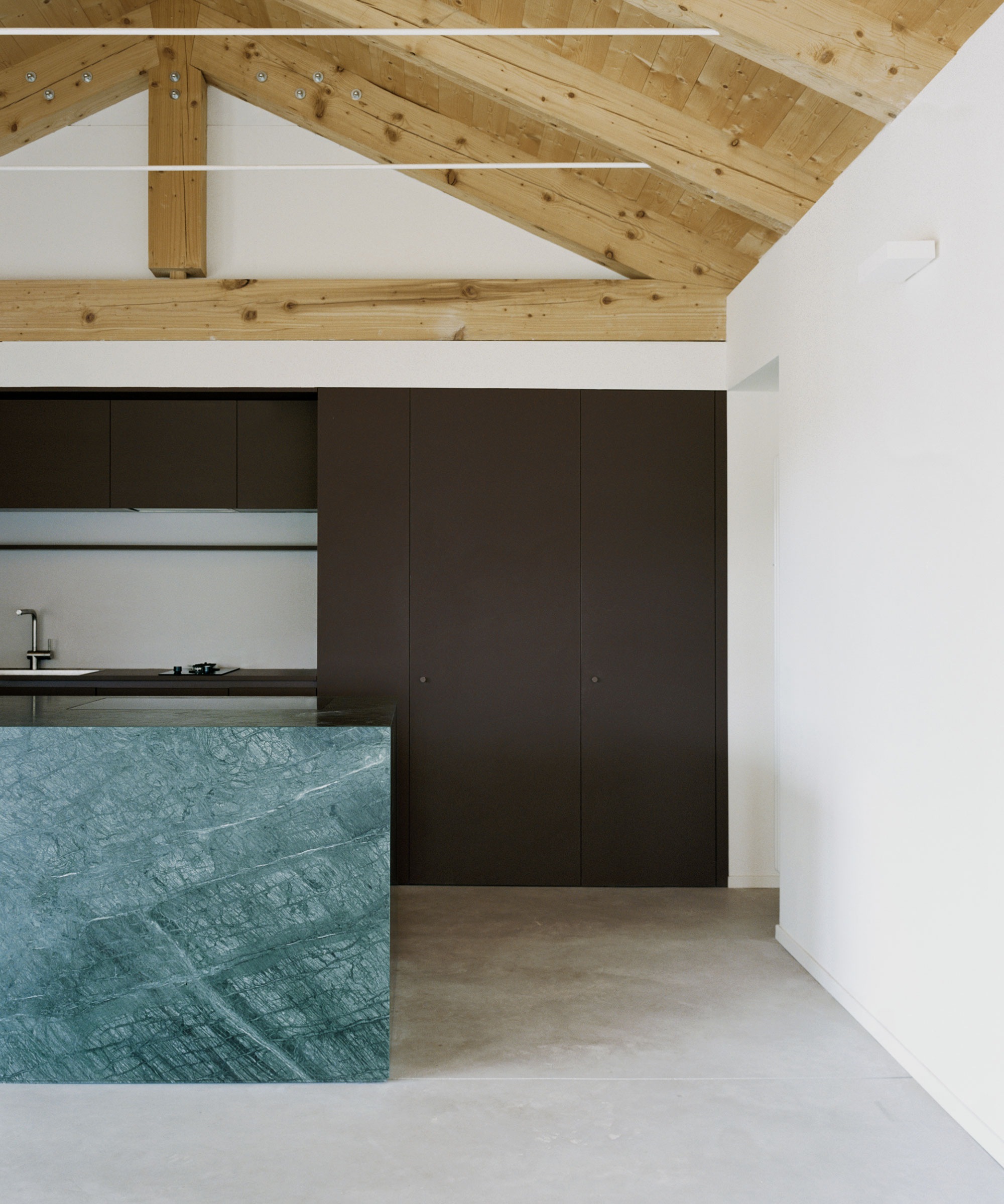 The studio used locally sourced materials to complete the project, using a design language that pays homage to the local setting and traditions. At the same time, the house boasts contemporary spaces and details. The kitchen features a green marble island, while the internal floors, made of exposed concrete, complement the colors and textures of the solid stone. Outside, an infinity pool reflects the shifts in the landscape, from the colors of the vineyards as they change over the seasons to the sky. Photography © Simone Bossi.