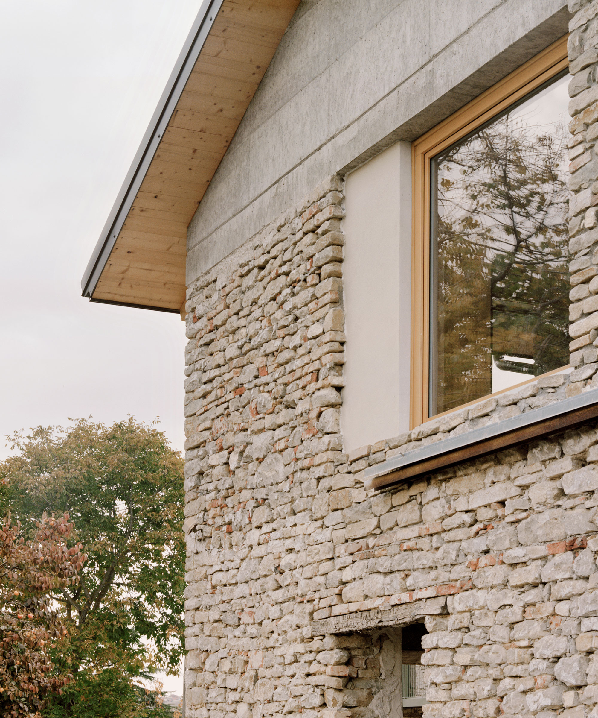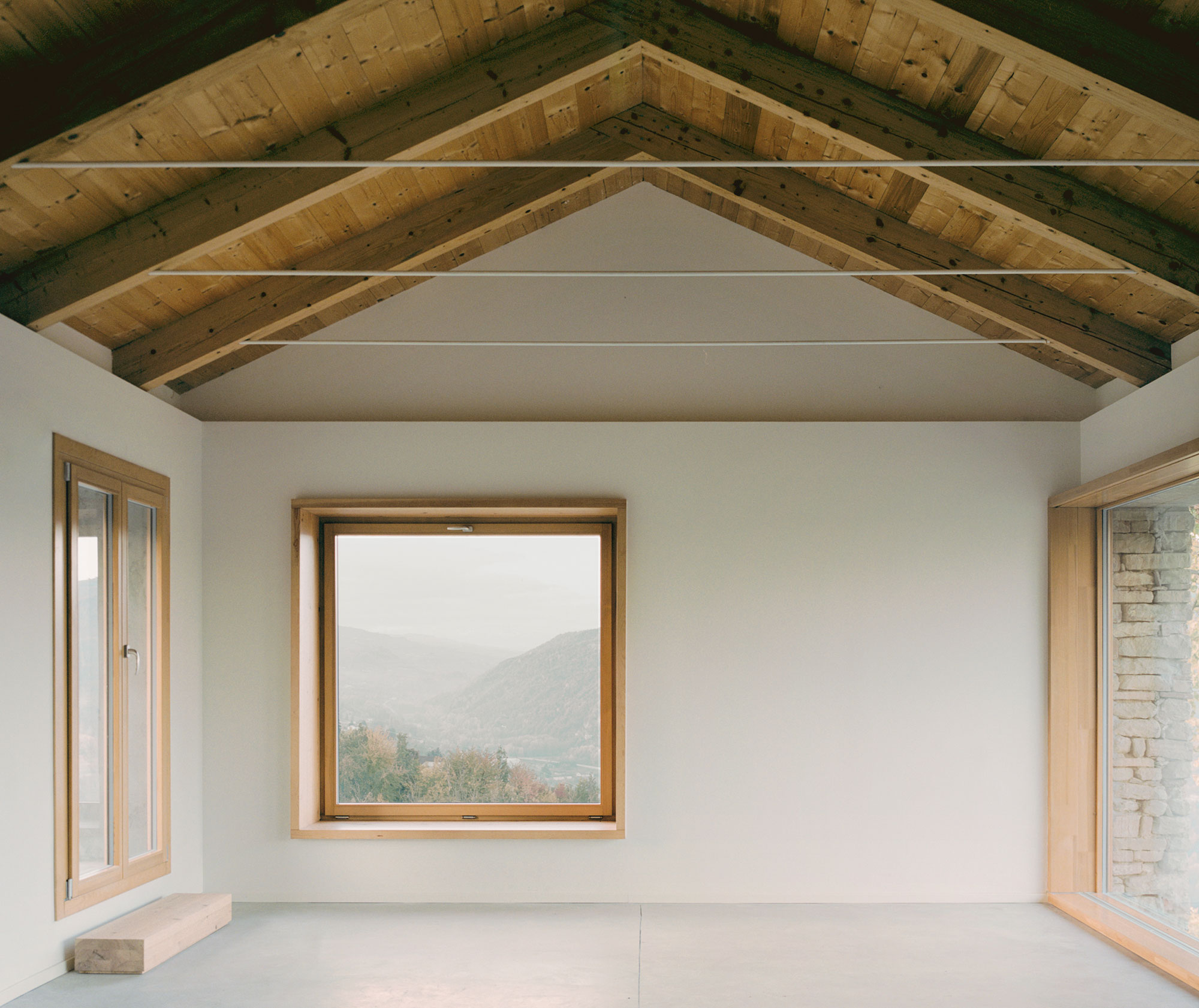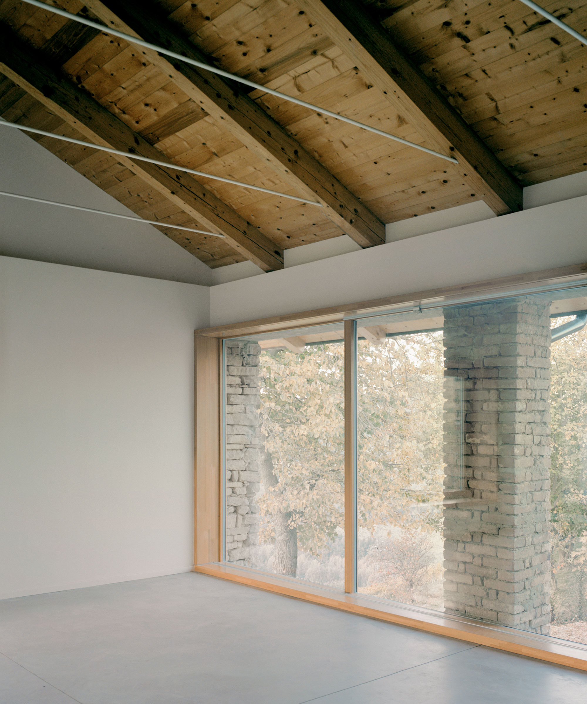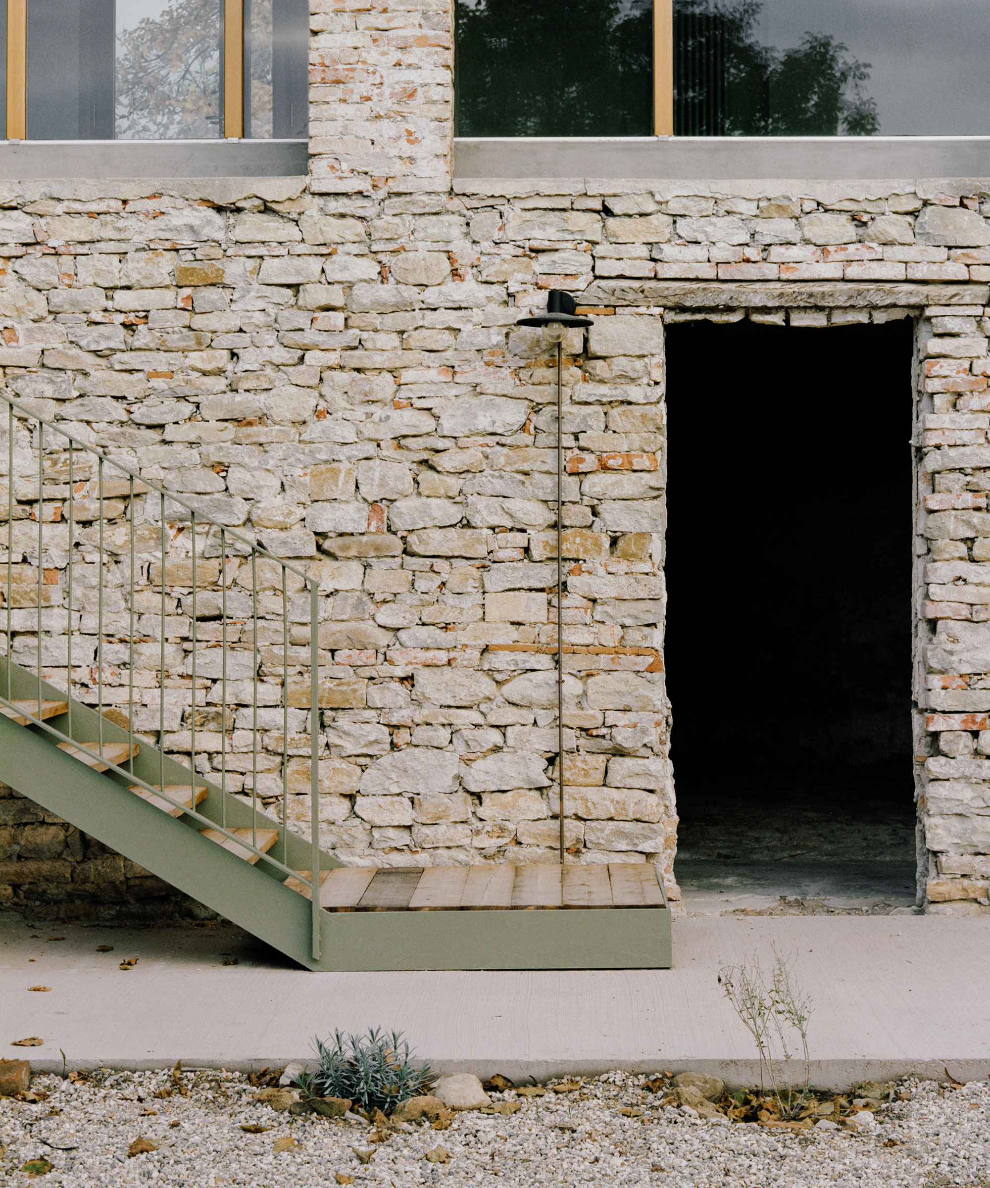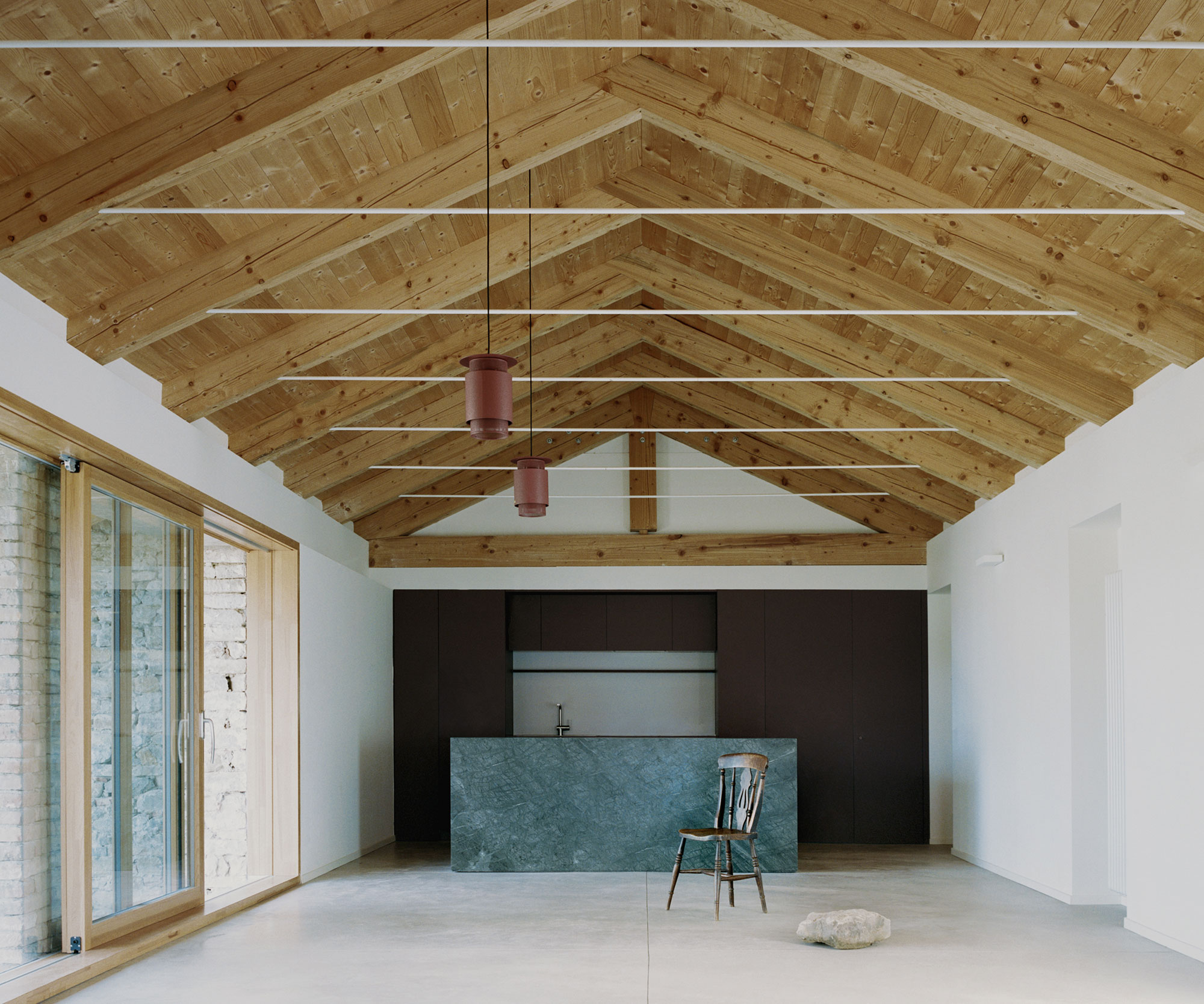 The house has two stories and an L-shaped structure that embraces a courtyard. While one side is older and features storage spaces, the large barn features a stable on the ground floor. An external staircase leads to a new balcony and the redesigned living spaces. On the barn’s upper level, the architects kept the open-plan space but designed a series of welcoming, social spaces. Among them, the kitchen and dining area as well as a lounge space. An impressive, 15-meter long window frames the rural landscape and leaves the old brick pillars exposed.