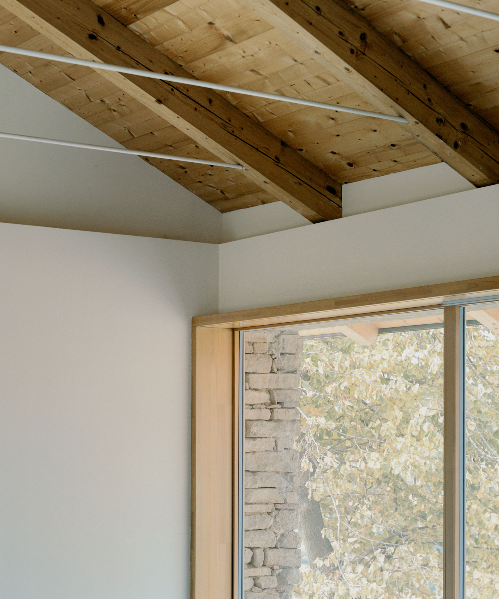 An old farmhouse converted into a warm living space that opens to views of vineyards.
