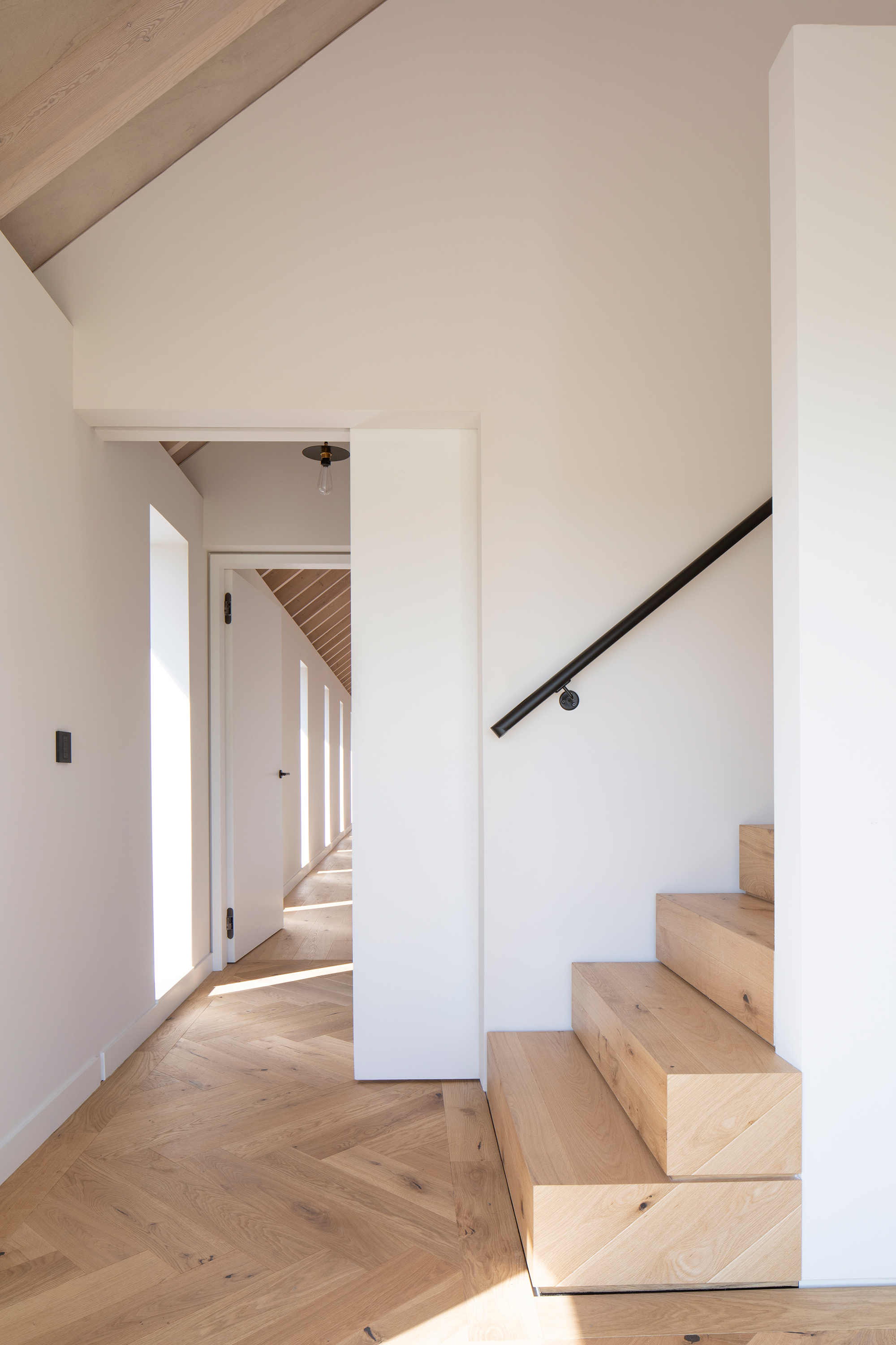Throughout the house, the architects used generous glazing to create a constant dialogue between the interiors and the surrounding farmland. For example, a glazed corner in the reading room immerses the residents into the rural site. Furthermore, all of the ground level bedrooms open to the courtyard via sliding or french doors. The studio used 90% of the original bricks from the dilapidated farmstead buildings throughout the house. The over 4000 locally cast bricks now cover the floors in a classic herringbone pattern. Apart from adding visual warmth and linking the new house to its site, the brick flooring also acts as a thermal store for heat. Other sustainable features include triple glazing, insulated metal cladding, and a rainwater collection system. Photographs © Dapple Photography.