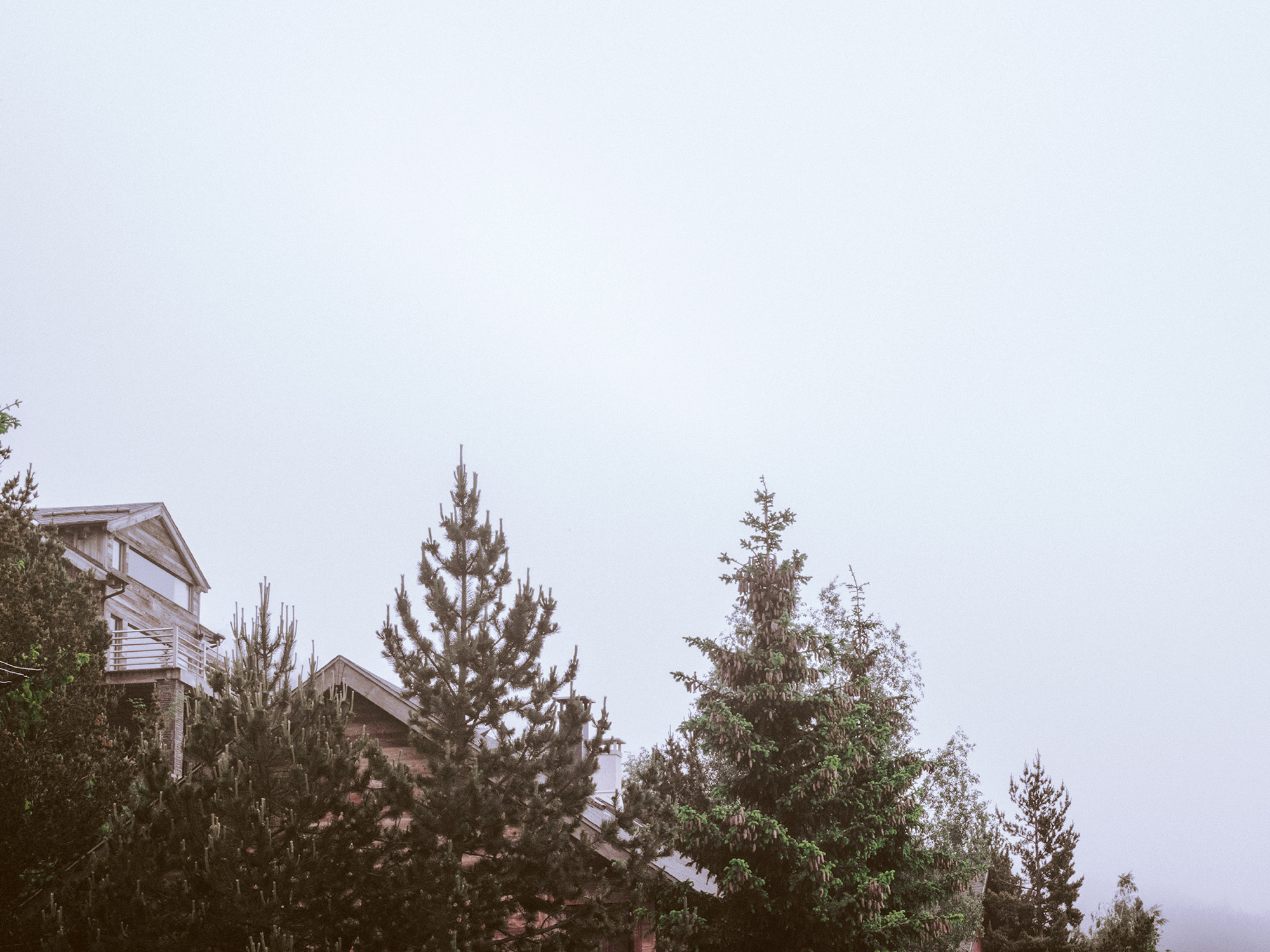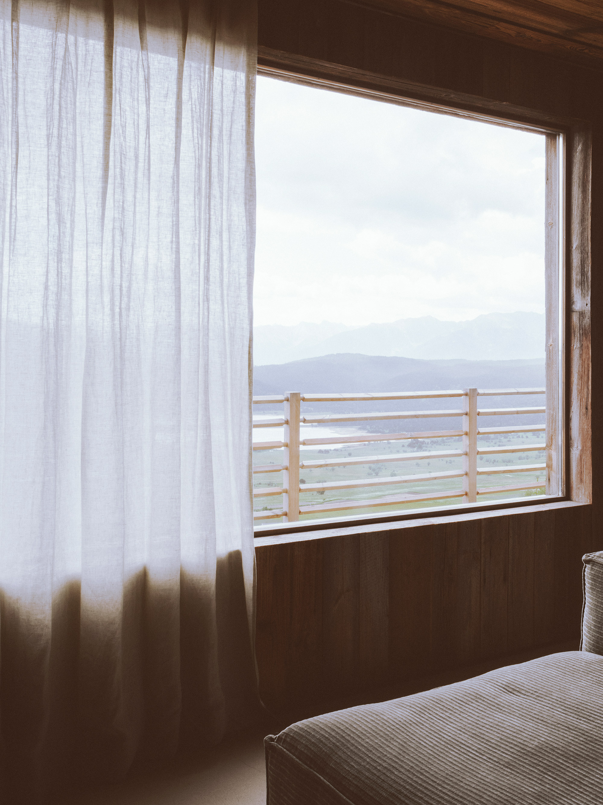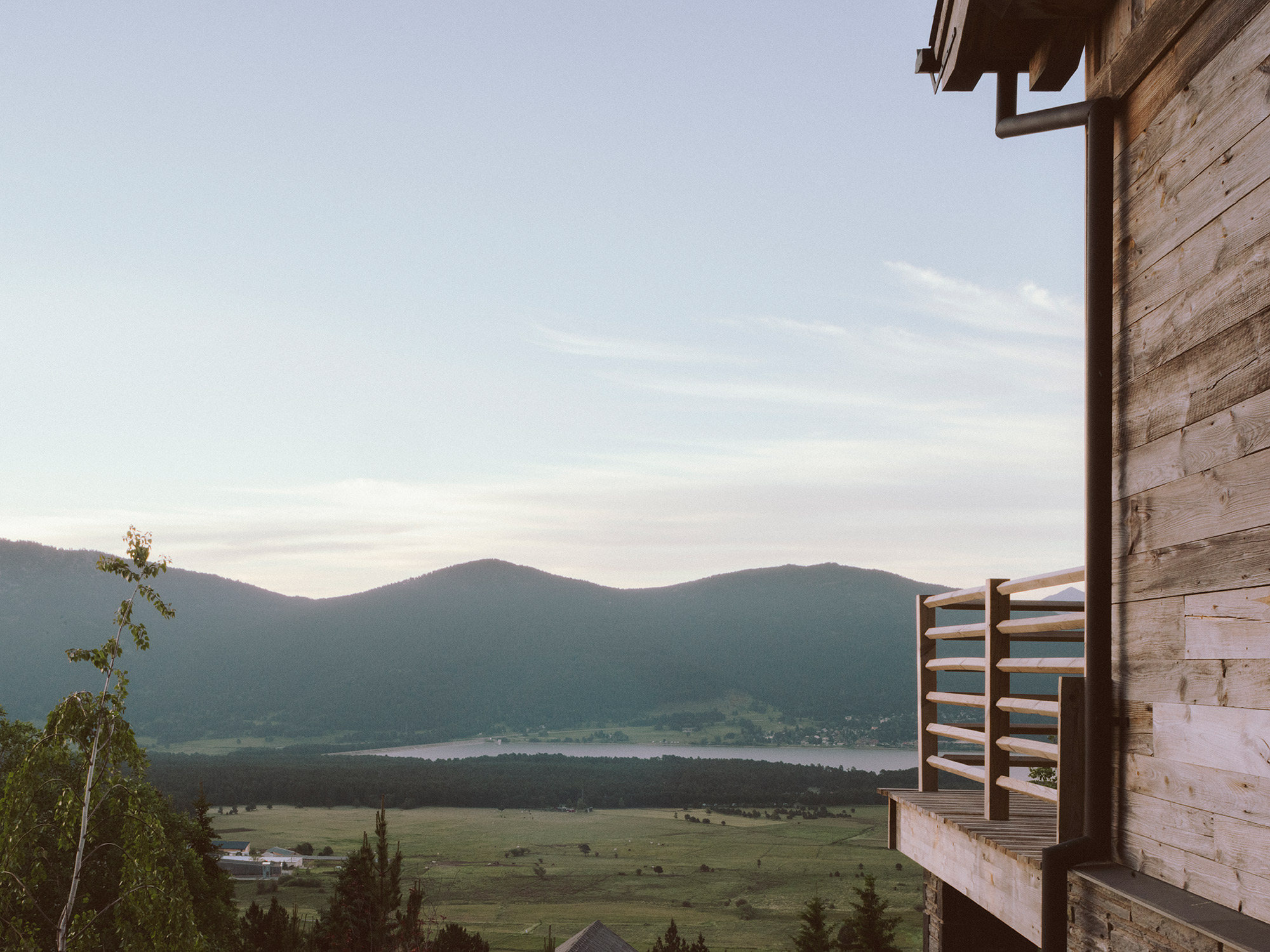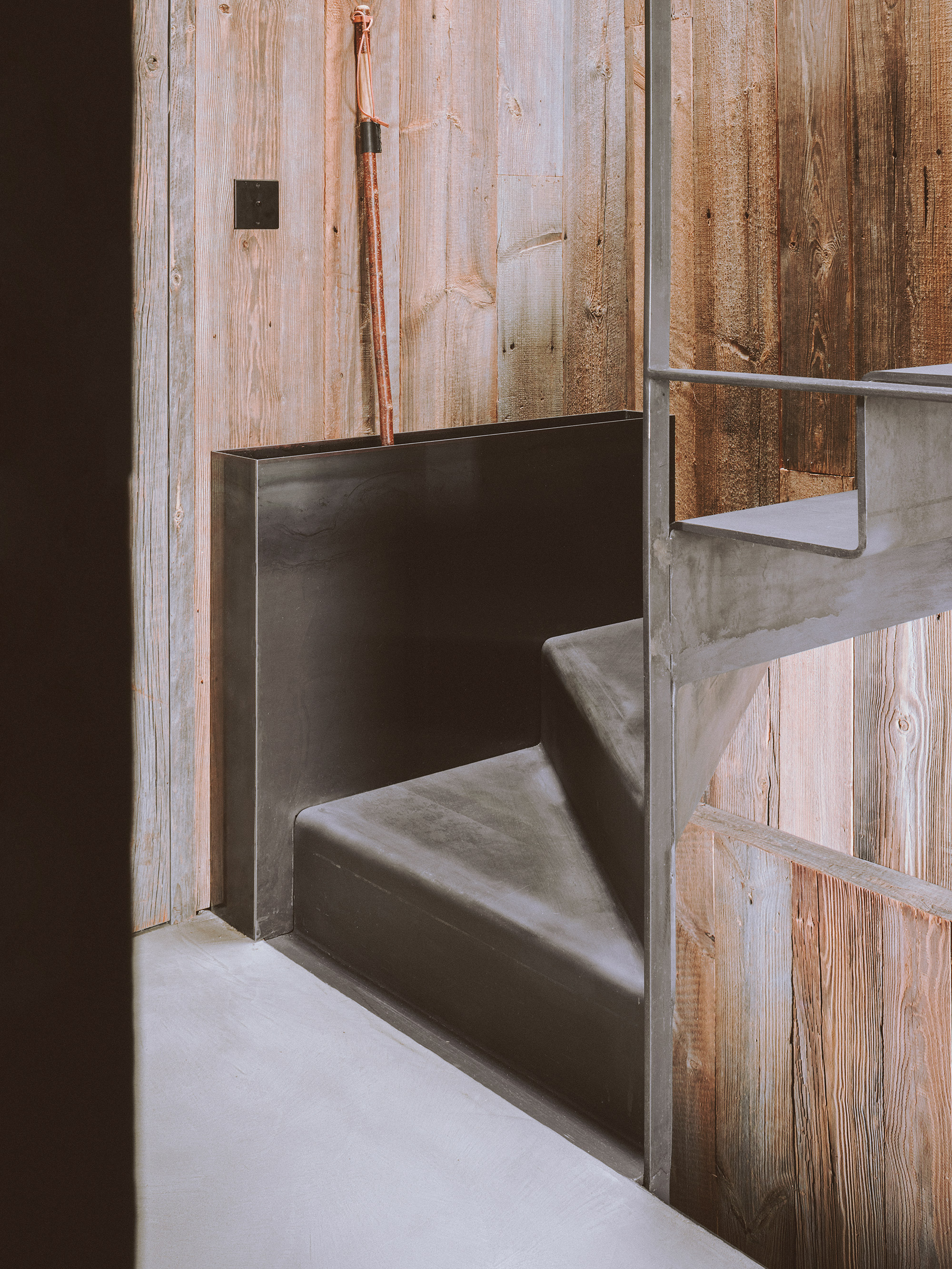 Both the master bedroom and the downstairs lounge space boast panoramic windows that frame spectacular views. The huge openings also drench the interiors in natural light. Throughout the living spaces, rustic touches reminiscent of traditional mountain cabins complement industrial accents. For example, the living room features a black steel fireplace. Concrete flooring runs through the kitchen area, with both concrete and steel used for the solid wood staircase. Solid stone completes the material selection. However, natural timber is the main star of the palette.