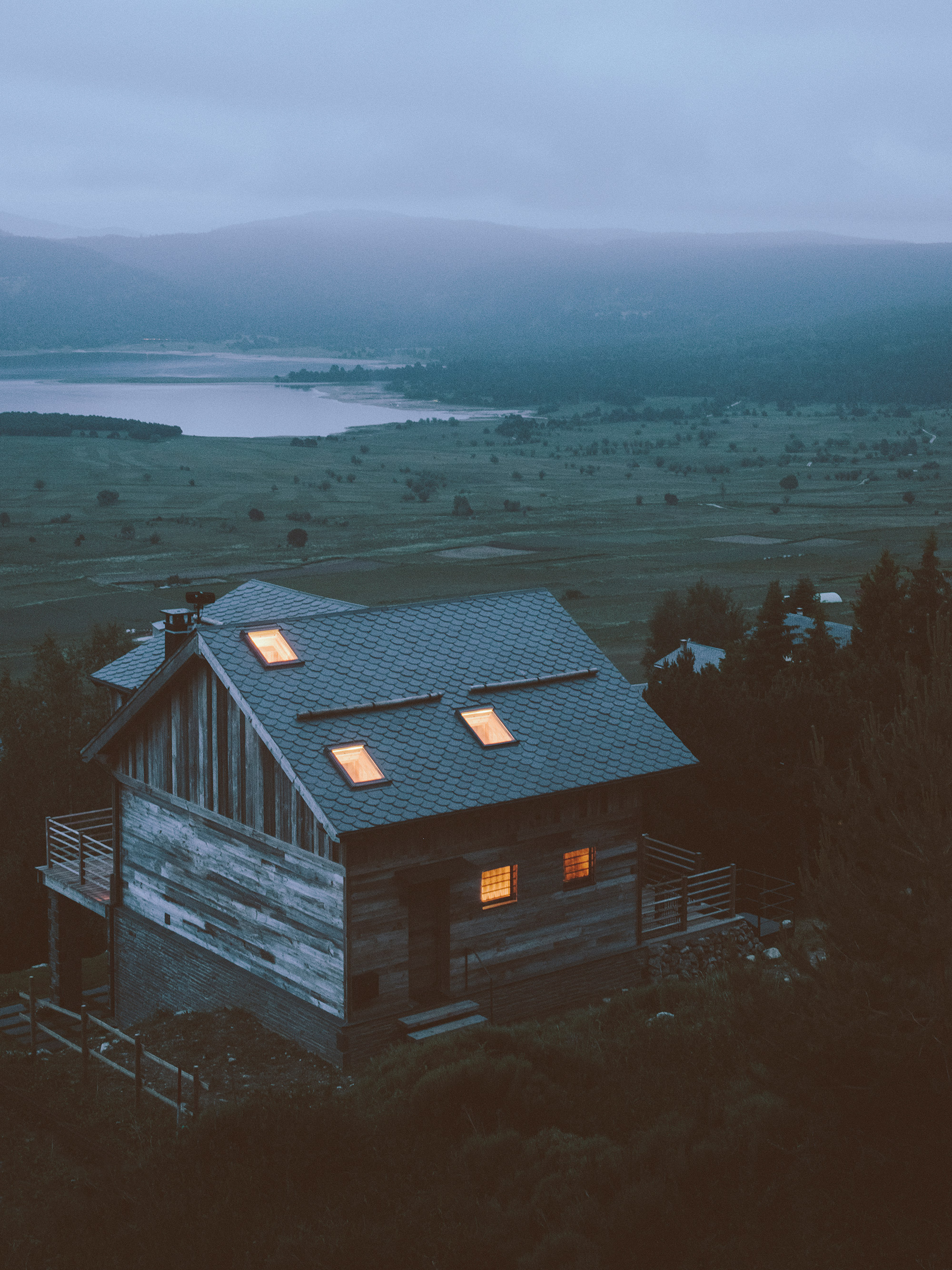 A wooden cabin designed with industrial accents and huge windows that overlook mountain and lake views.