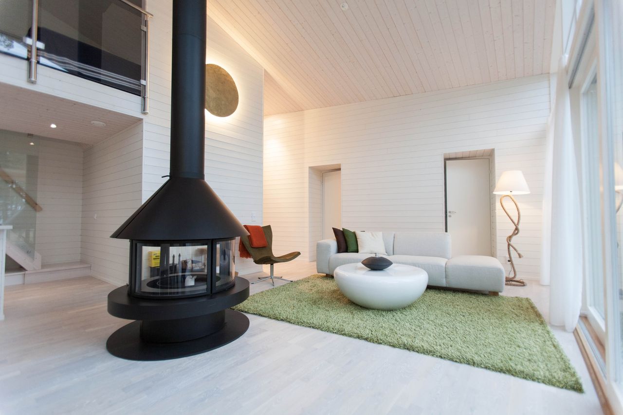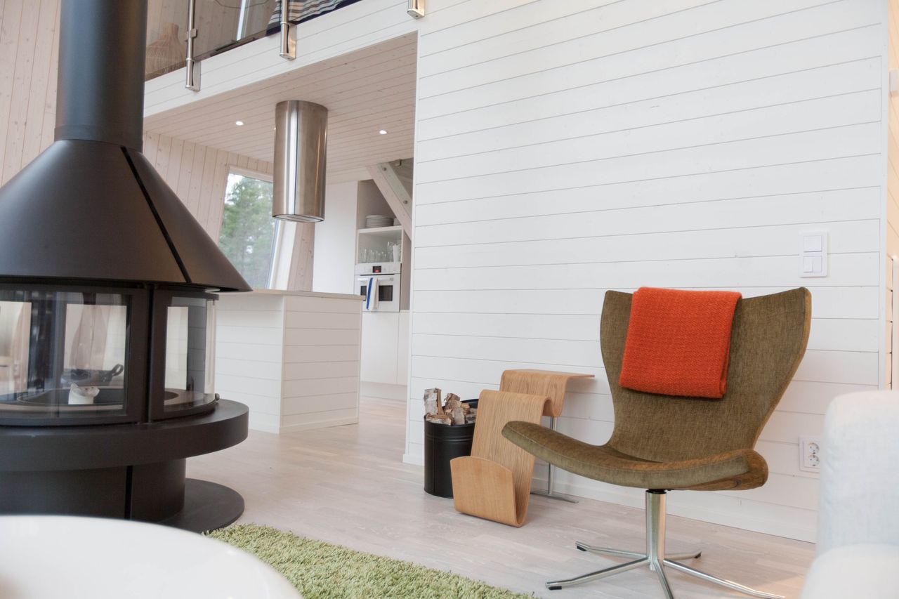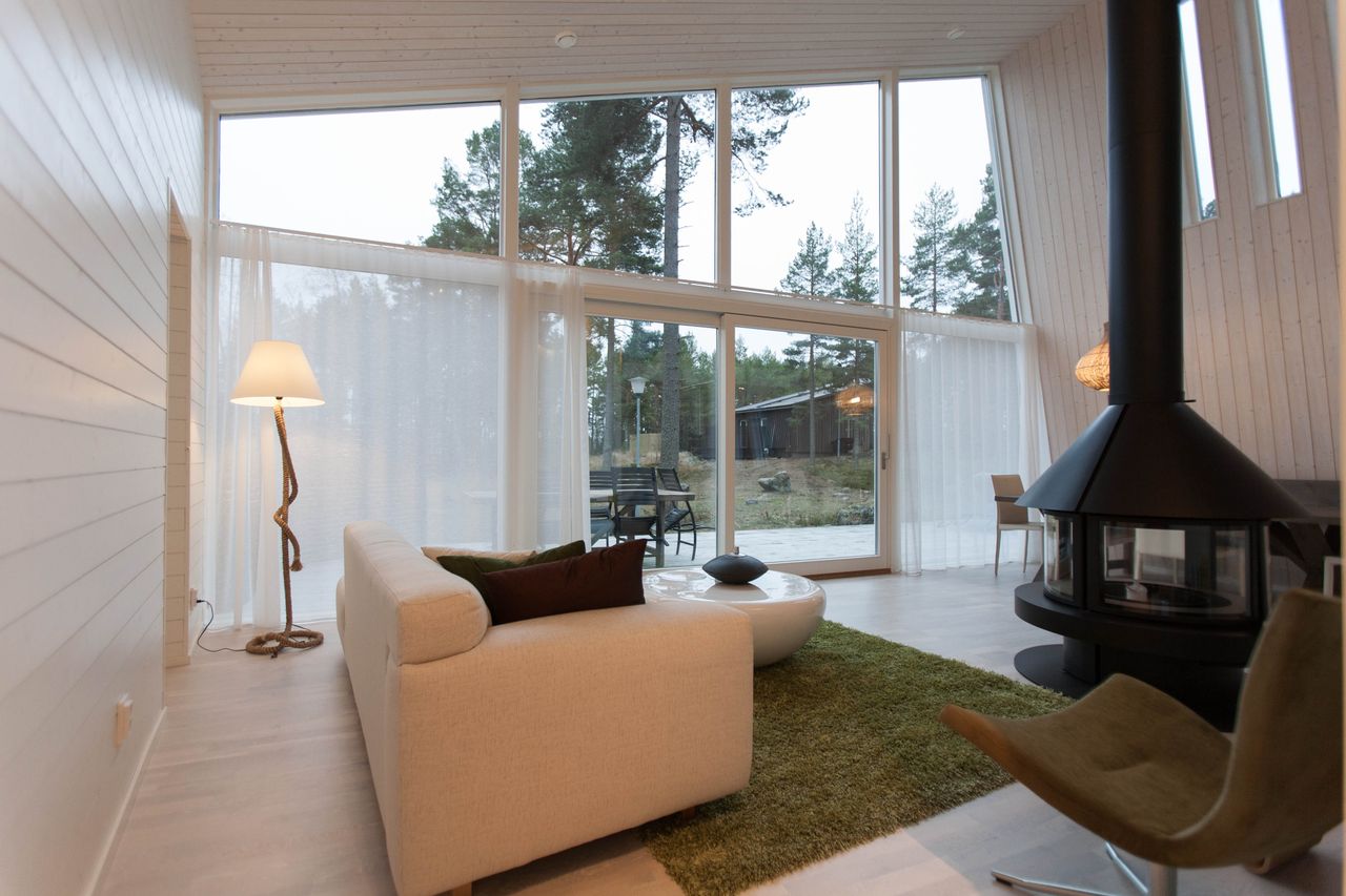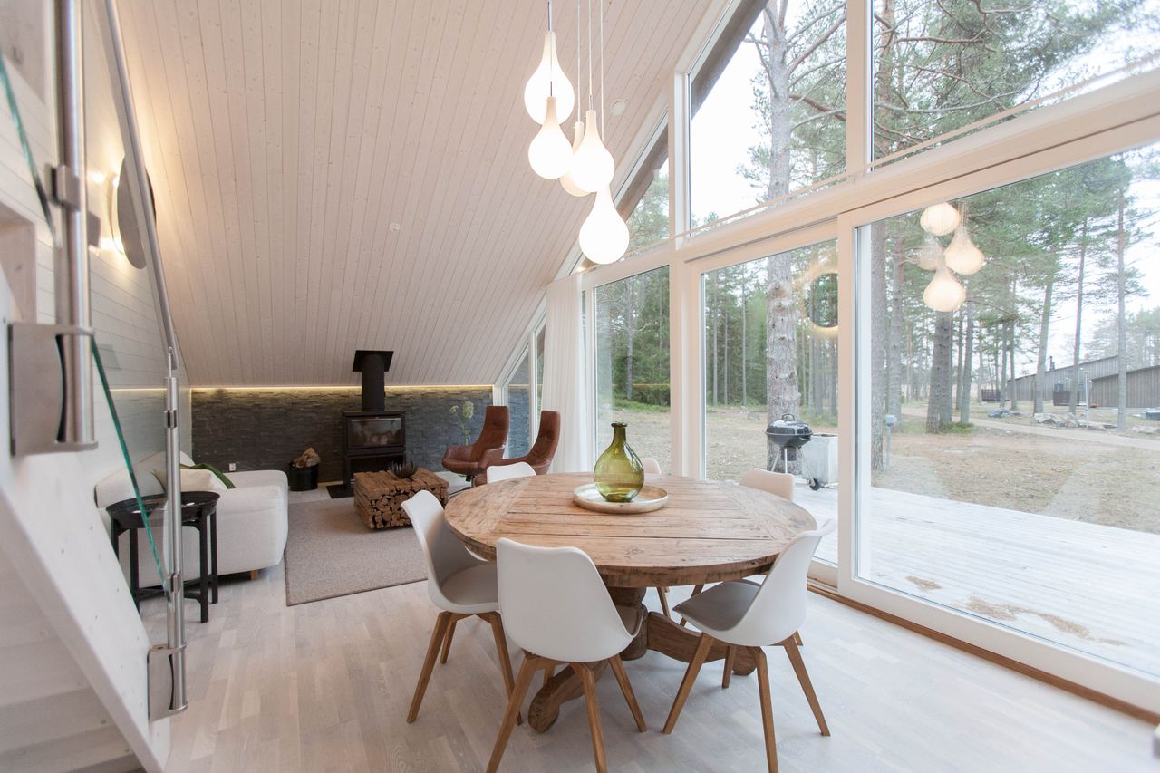 Nestled in the wilderness of Hölick Havsresort, Sweden, Chalet Lagunen offers a picturesque view over the Scandinavian landscape and a relaxing ambience to match. The three-bedroom chalet designed by Mats Edlund and Henrietta Palmer is available to rent via Paradizo Private Collection, it can accommodate up to eight guests in its modernly rustic interior. The sloping roof, oblique angles, and light wooden ceiling contrast the fully-glazed façade, striking a perfect balance of coziness and openness. Simple, but elegant accents such as the teardrop pendant lamps and sheer white curtains make the holiday home ethereal and heavenly among earthy hints from the tall stove fireplace and shaggy green rug. For a complete package, Chalet Lagunen’s two terraces and outdoor sauna allow a comprehensive experience of utter luxury and enjoyment of nature’s majesty.