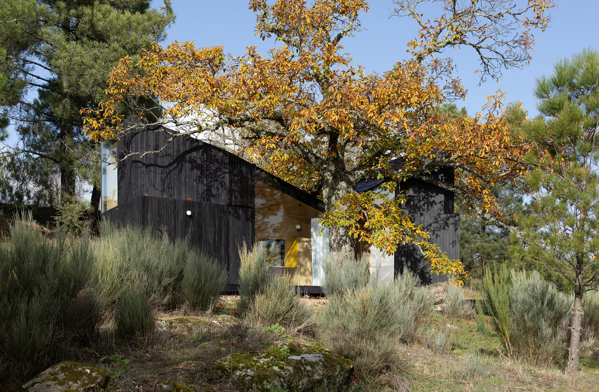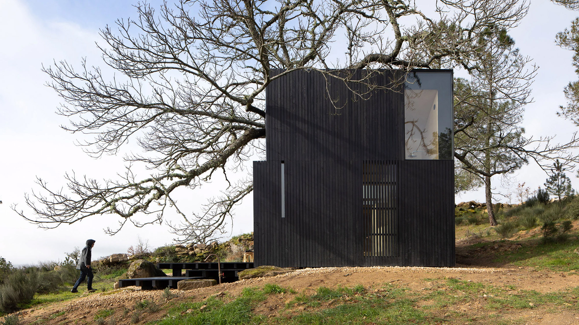 Built around a mature chestnut tree, this house has a creative design; one that takes inspiration from the beauty of the surrounding nature and from the features of the site. Named Chestnut House, this cabin is located in a tranquil area of the village of Vale Flor, Portugal. Architect João Mendes Ribeiro designed the house with an asymmetric geometry that both respects the integrity of the site and reinforces the connection between the living spaces and nature. The cabin boasts black cladding and a distinctive silhouette with slanted walls that follow the angle of the tree’s crown. The building is compact and has a minimal impact on the landscape, but provides comfortable living spaces.