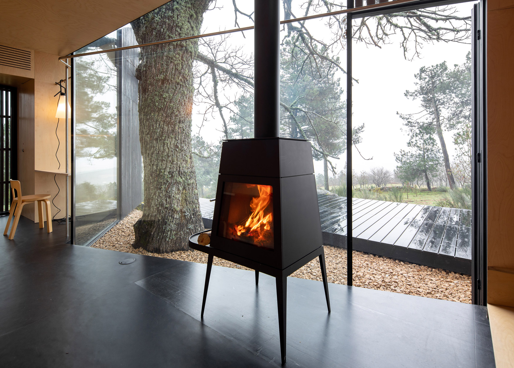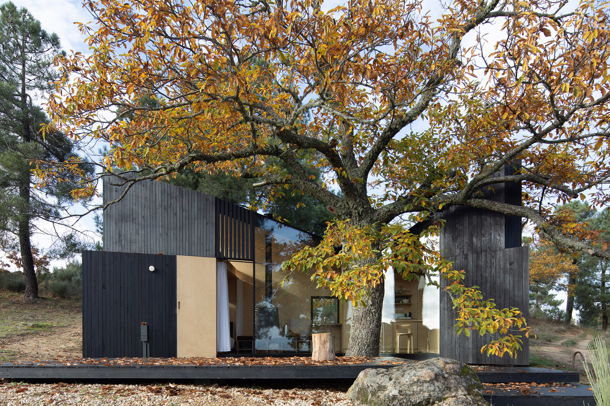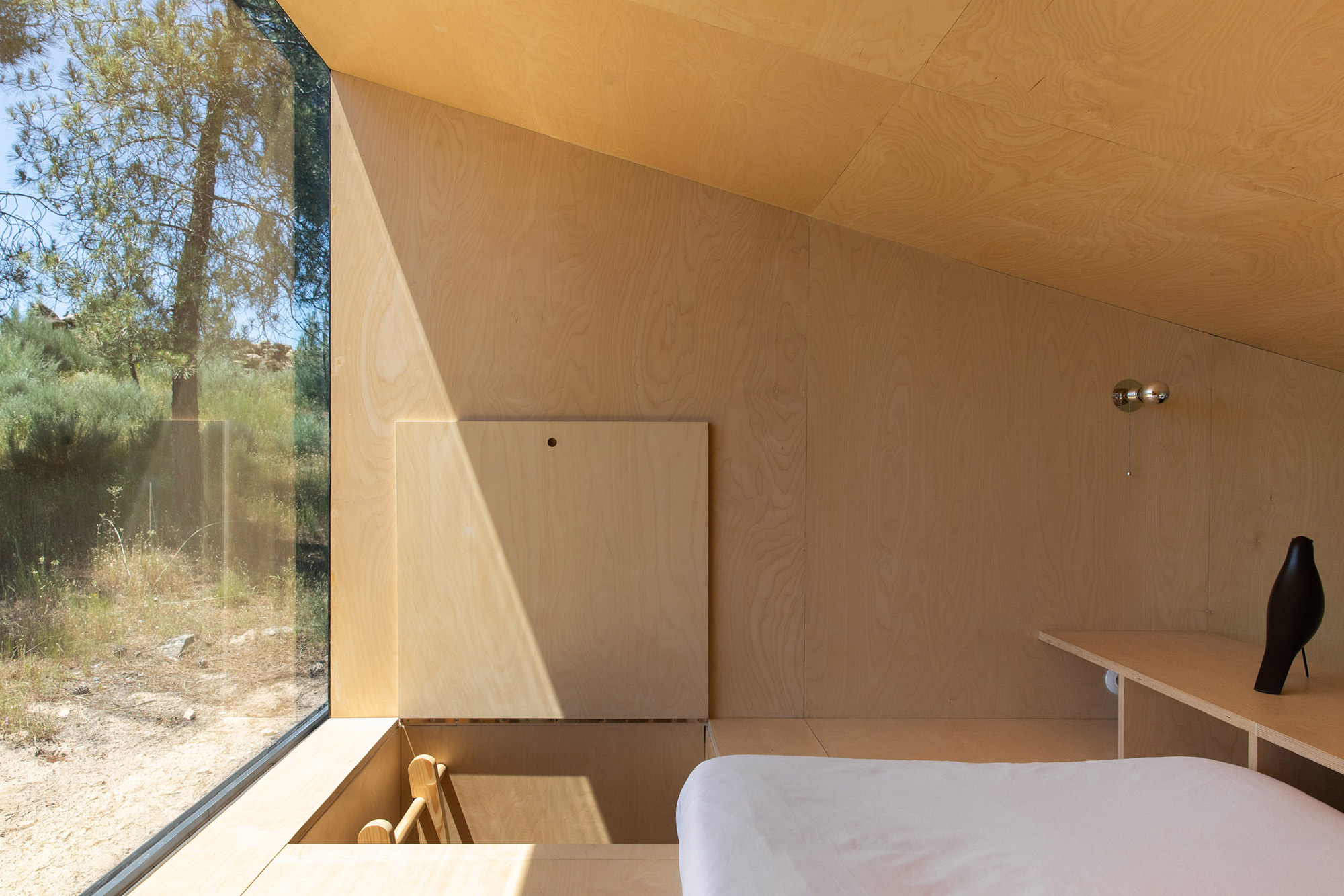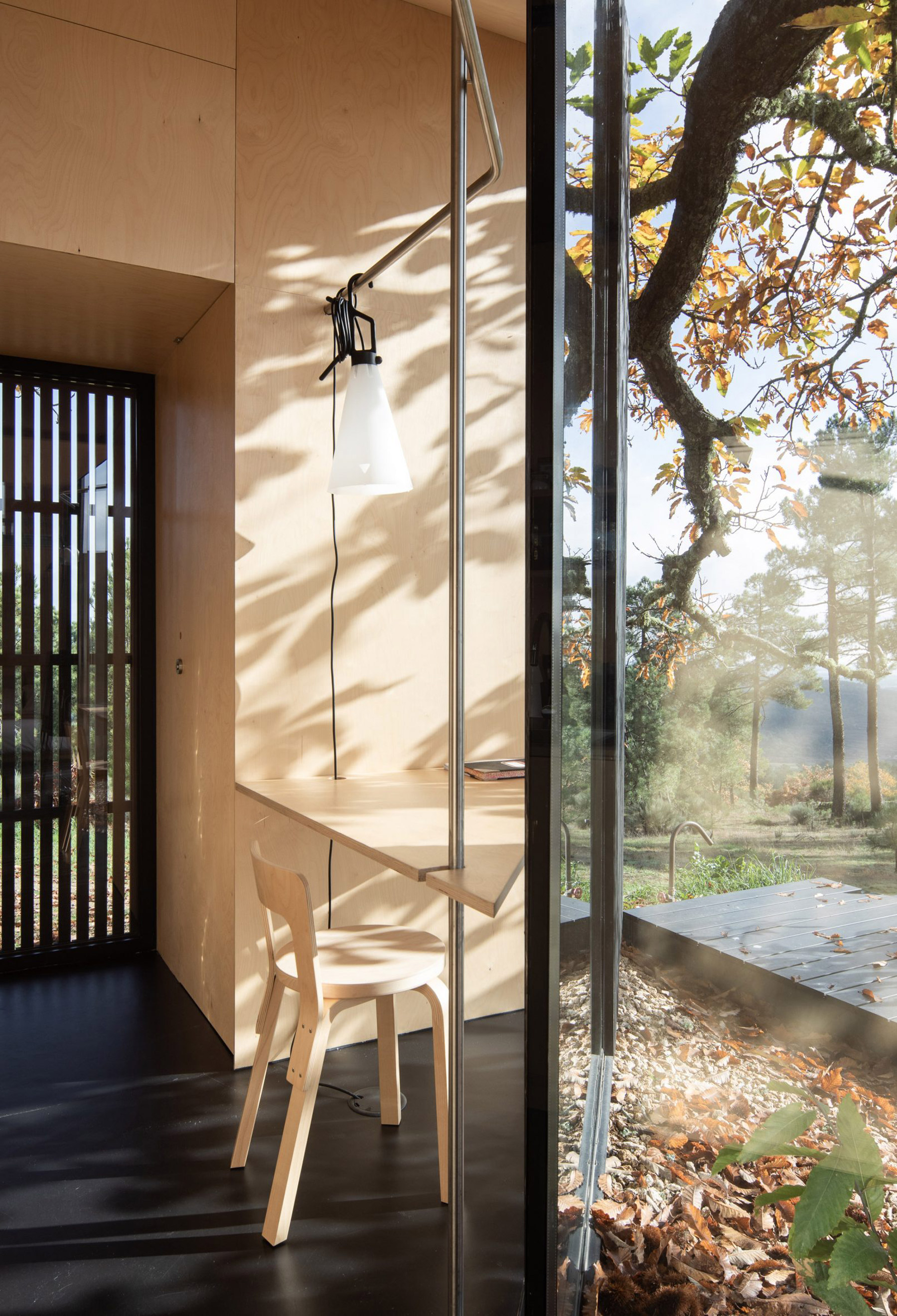 Occupying 25-square-meters, the cabin contains a kitchen and lounge area as well as a bedroom, bathroom, and a mezzanine sleeping space. A central fireplace provides warmth during the colder months. Likewise, the light plywood panels that cover the walls and ceilings enhance the feeling of warmth and comfort. Floor-to-ceiling glazing opens the interior to views of the chestnut tree and the surrounding nature. Angled to accommodate the branches of the tree, the glazed panels maximize access to views and the amount of natural light reaching the heart of the cabin. The large windows also allow the residents to admire the landscape as it changes with the seasons. Outside, there’s a wooden deck that provides room for lounge chairs and a table or sun loungers. The architect designed the house with a wooden build, sustainable cork insulation, plywood-lined interiors and a butterfly-style roof. Photography © José Campos.