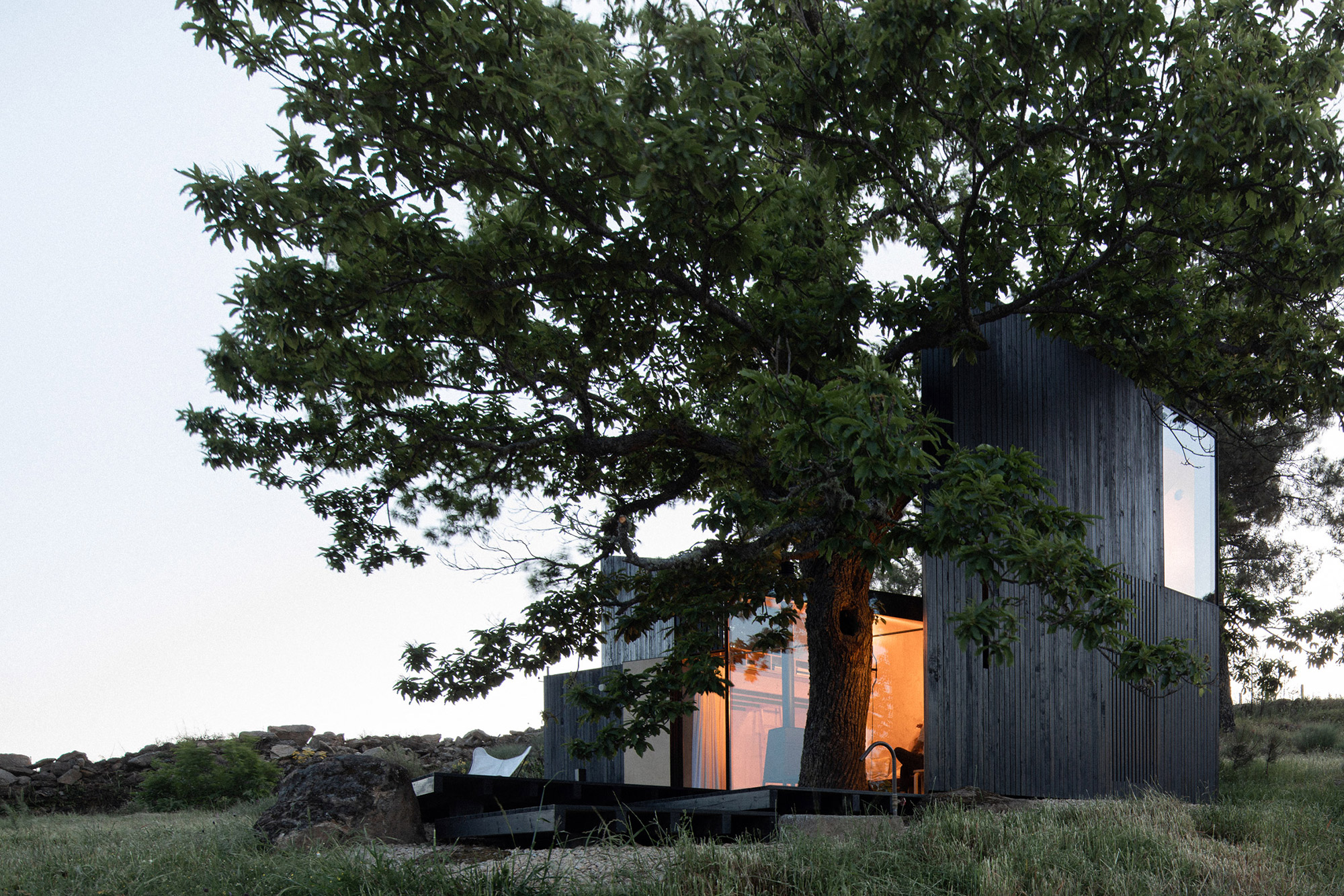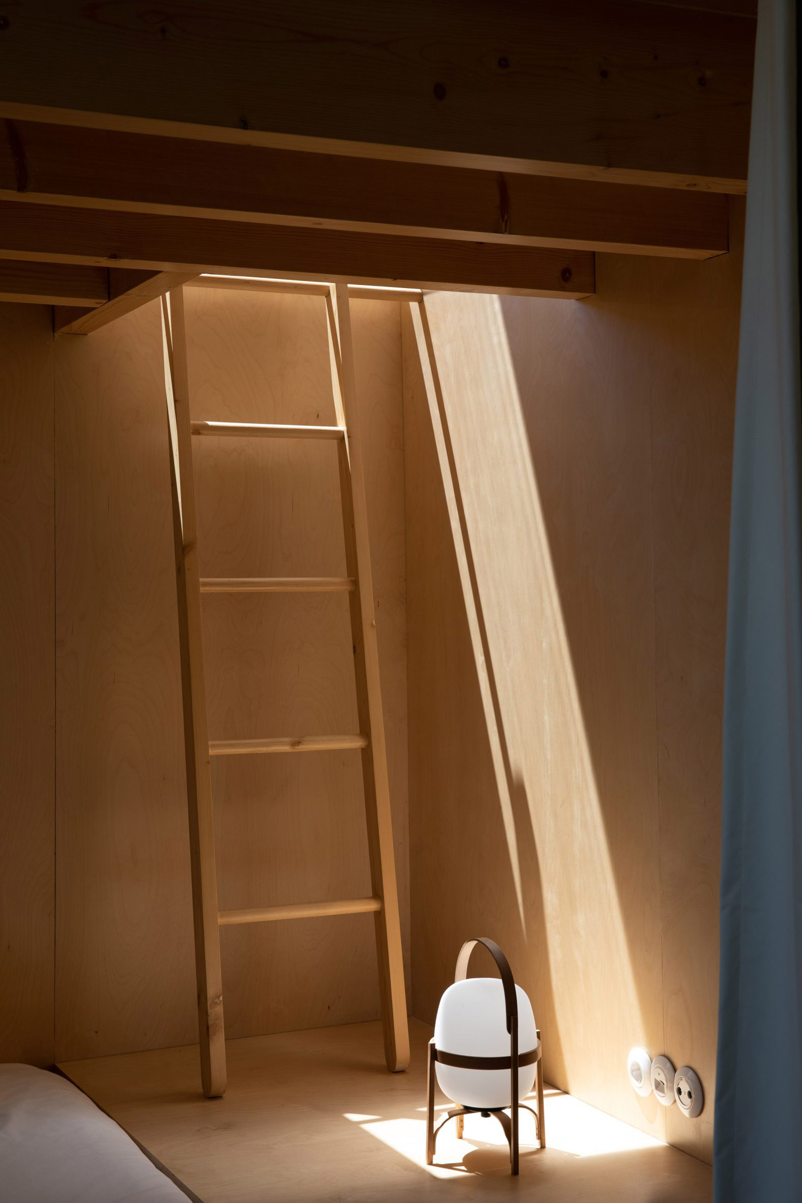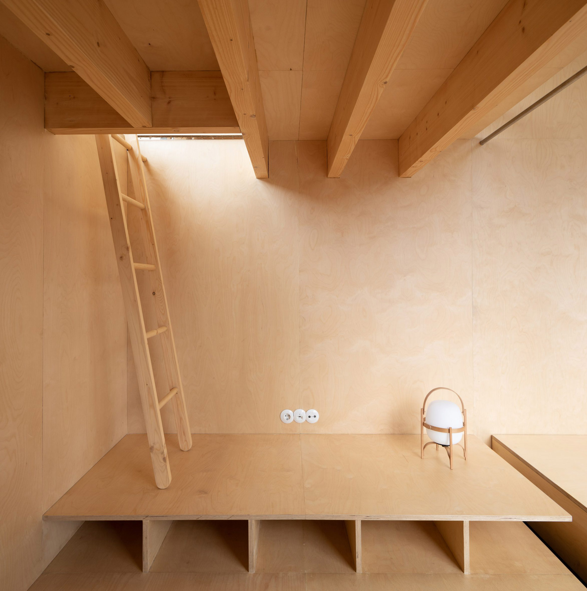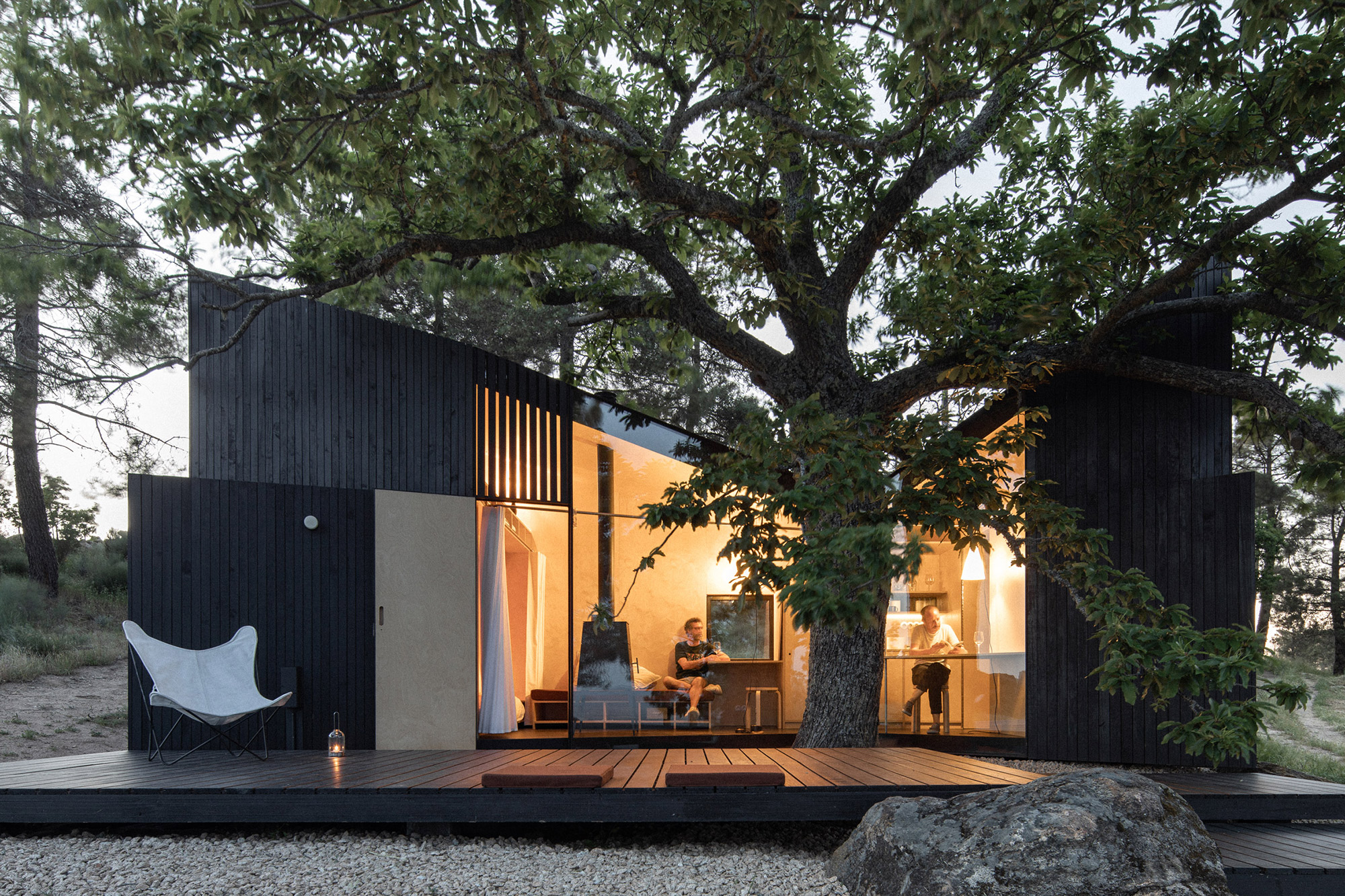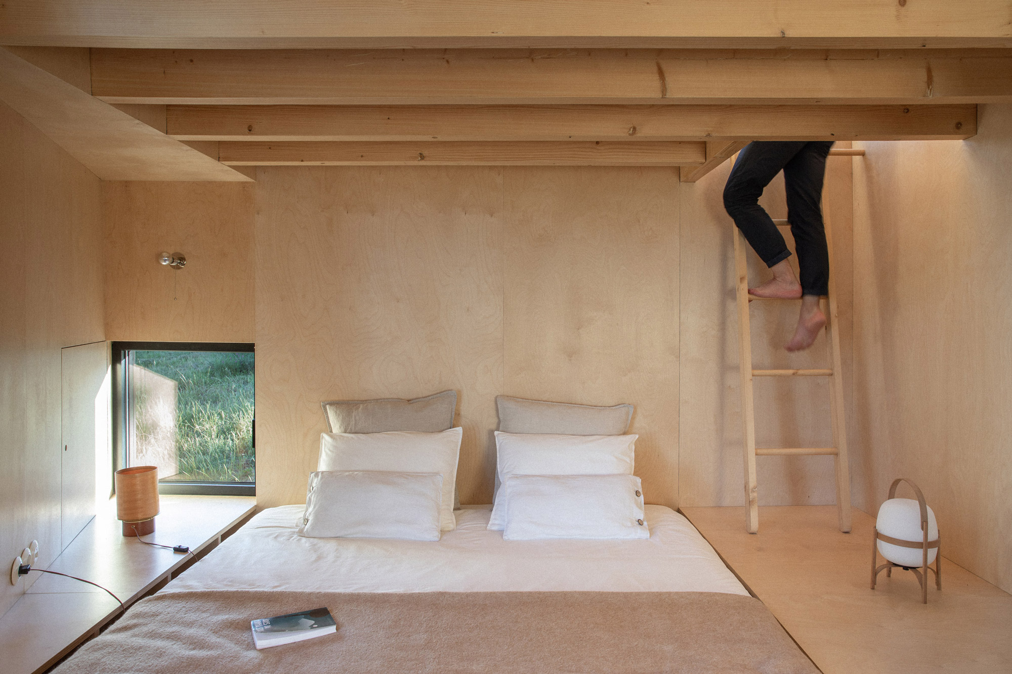 Occupying 25-square-meters, the cabin contains a kitchen and lounge area as well as a bedroom, bathroom, and a mezzanine sleeping space. A central fireplace provides warmth during the colder months. Likewise, the light plywood panels that cover the walls and ceilings enhance the feeling of warmth and comfort. Floor-to-ceiling glazing opens the interior to views of the chestnut tree and the surrounding nature. Angled to accommodate the branches of the tree, the glazed panels maximize access to views and the amount of natural light reaching the heart of the cabin. The large windows also allow the residents to admire the landscape as it changes with the seasons. Outside, there’s a wooden deck that provides room for lounge chairs and a table or sun loungers. The architect designed the house with a wooden build, sustainable cork insulation, plywood-lined interiors and a butterfly-style roof. Photography © José Campos.