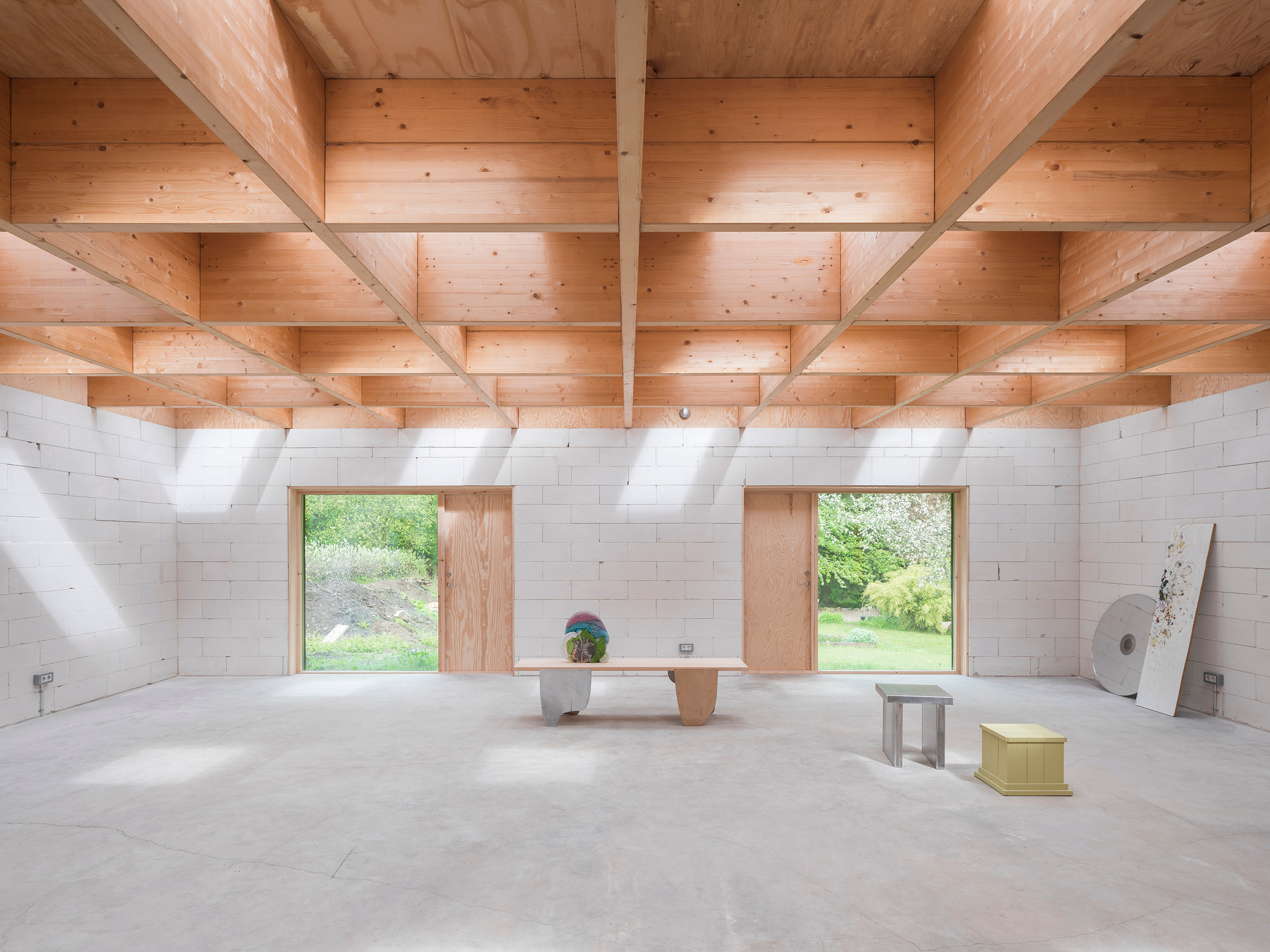 Designed by Cambridge-based architecture firm WOJR, House of the Woodland in the Berkshires, Massachusetts, takes inspiration from the surrounding nature. The architectural concept focuses on fostering an awareness of the passage of time. Made with cinderblock walls that remain exposed both on the exterior and interior, the house boasts a rich materiality. Four plywood trusses provide support to a pyramidal roof which also features a series of skylights. A concrete floor, generous glazing, and an eclectic décor complete this retreat.