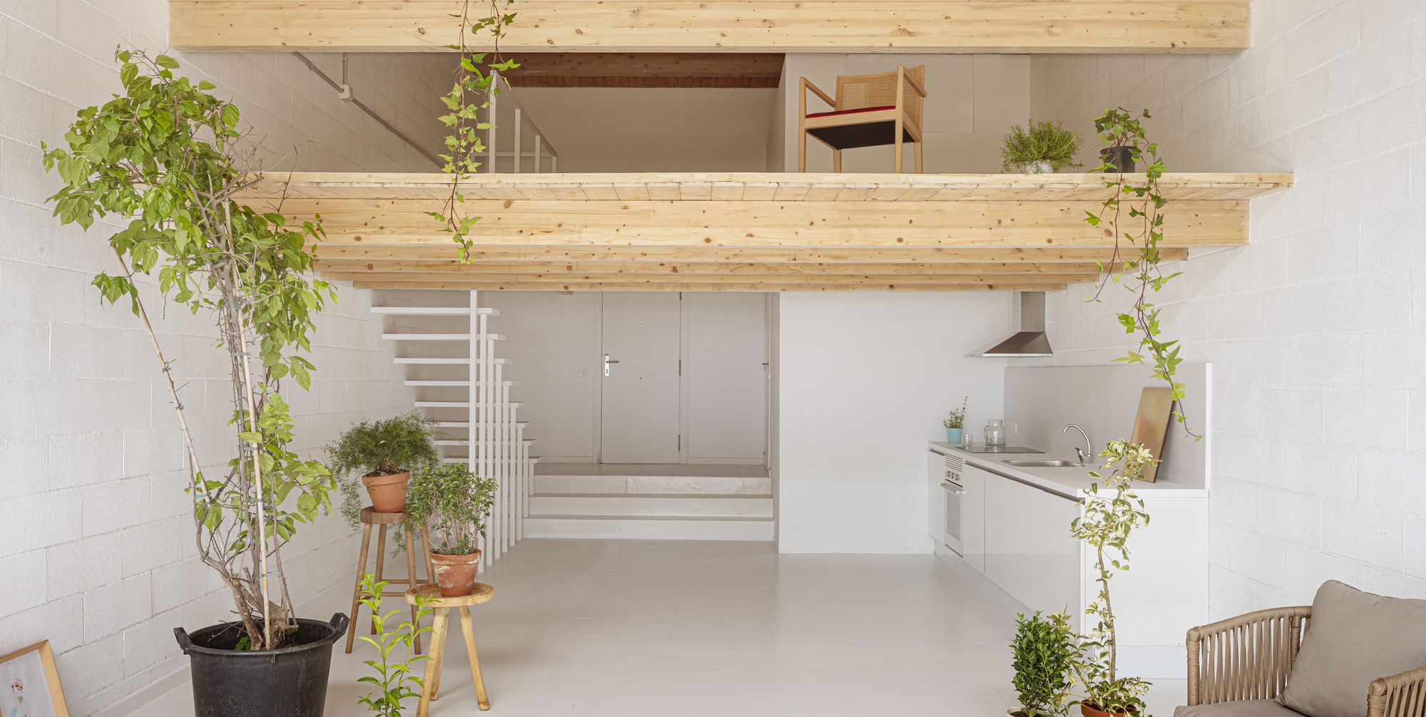 A former office, this building was converted by Roman Izquierdo into an airy house. The site provides access to gorgeous views of the surrounding pine trees and the Gavà Mar beach in Spain. To create a bright interior, the team painted the cinderblock walls white, along with the floor. Cross-laminated fir beams and the tongue-and-groove ceiling boards add warmth to the space. Designed with an open-plan layout, this house features a sculptural staircase that links the double-height ground floor to the mezzanine. The living room boasts a high ceiling and doubles as an indoor garden that opens to a small balcony with sea views.