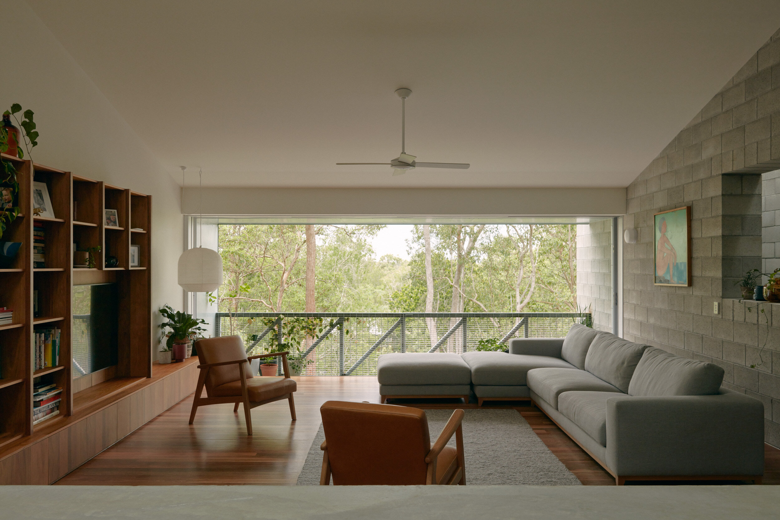 Named Mt Coot-Tha House, this residence on the outskirts of Brisbane, Australia, was designed by architecture practice Nielsen Jenkins for a family member of one of the studio’s co-founders. The site’s distinctive features, from the steep slope of the plot to the bushfire exposure, informed the design and the material palette of the house. Built with cinderblock walls, the home is protected from the elements and the threat of bushfires. Openings connect the interiors to the eucalyptus forest, while a semi-enclosed courtyard with lush greenery brings nature right into the heart of the house. The studio used wood floors and furniture to create a cozy, warm atmosphere within the concrete walls.