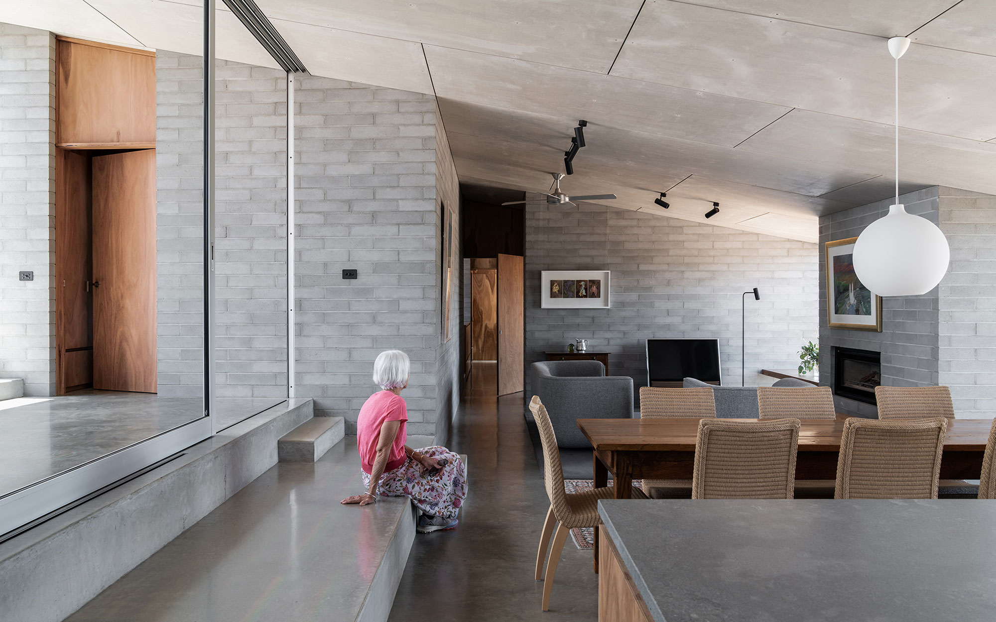Kerstin Thompson Architects (KTA) designed this house in Albury, Australia, with a compact footprint and a robust material palette. Built on a sloping site, the residence features living spaces that follow the topography of the land. Both the northern and the southern sides feature terraces that help to keep the house cool in summer and warm during winter. Cinderblock walls, concrete slabs, and cement sheets make the dwelling both durable and low-maintenance. The stepped interiors feature plywood finishes and furniture as well as windows that frame views of the Huon Hill in the distance. Perforated cement sheet screens, louvers, and sliding glass walls allow the residents to adapt the living spaces to the changing seasons.