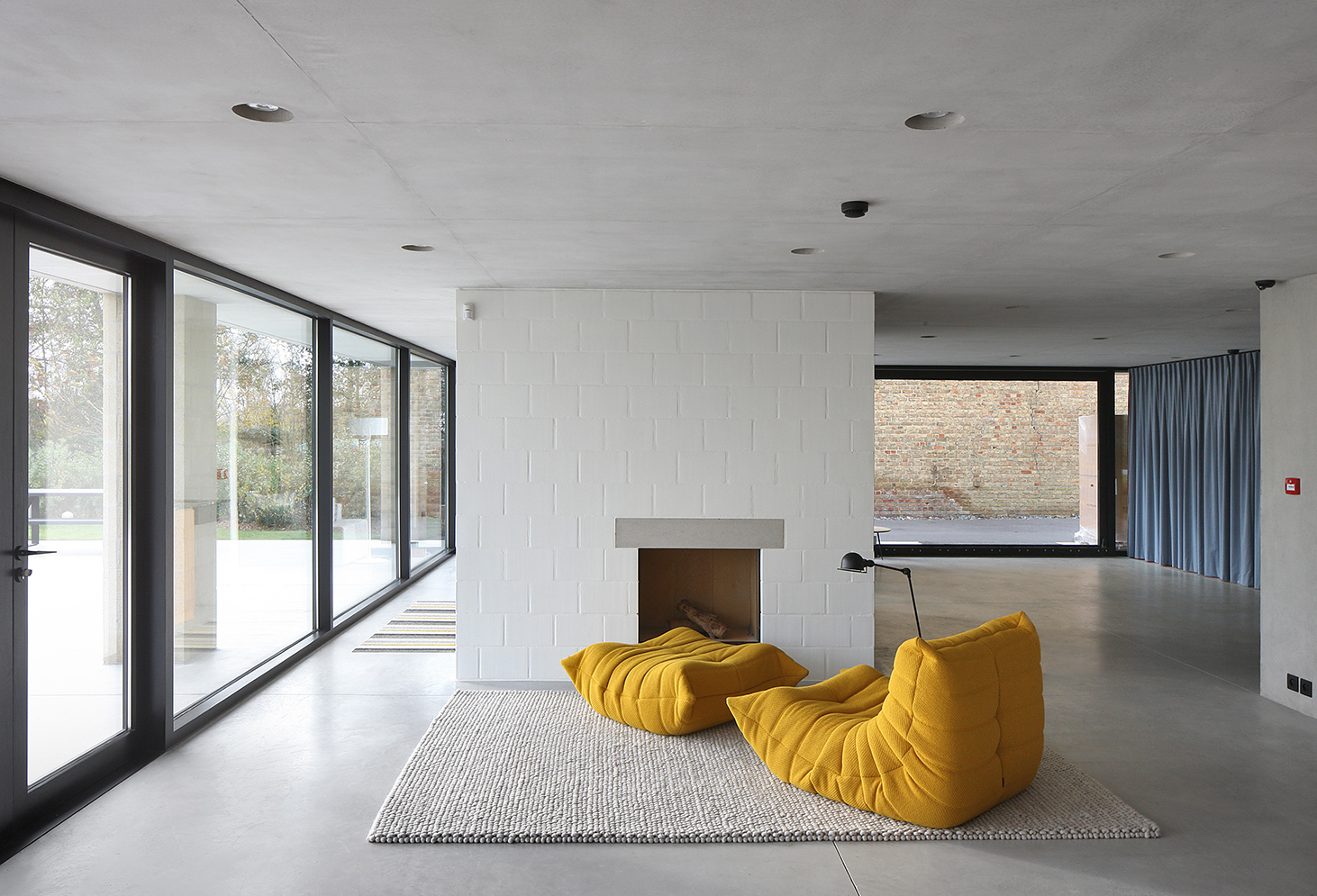 Graux & Baeyens Architecten completed the renovation and complete redesign of a 1960s bungalow in De Haan, on the northern coast of Belgium. Stripping the interiors to their skeleton revealed a square floor plan which the architects used as a source of inspiration for the design. The redesigned house features a series of three square wings, each with a white concrete cross that provides structural support and also becomes a centerpiece in each room. A new wall built on the outlines of the original building creates a patio. The living room features a glass wall that opens to the terrace. The fireplace features concrete elements that provide room for sitting or playing.