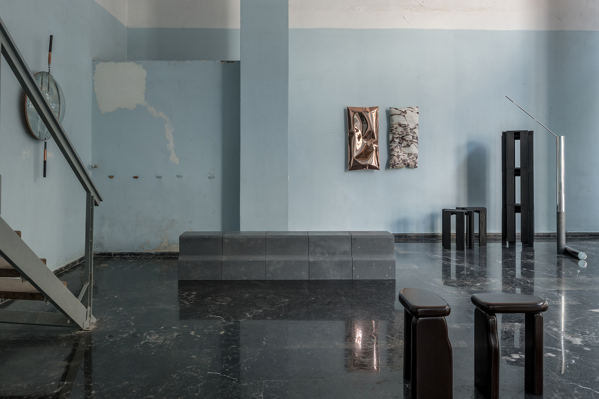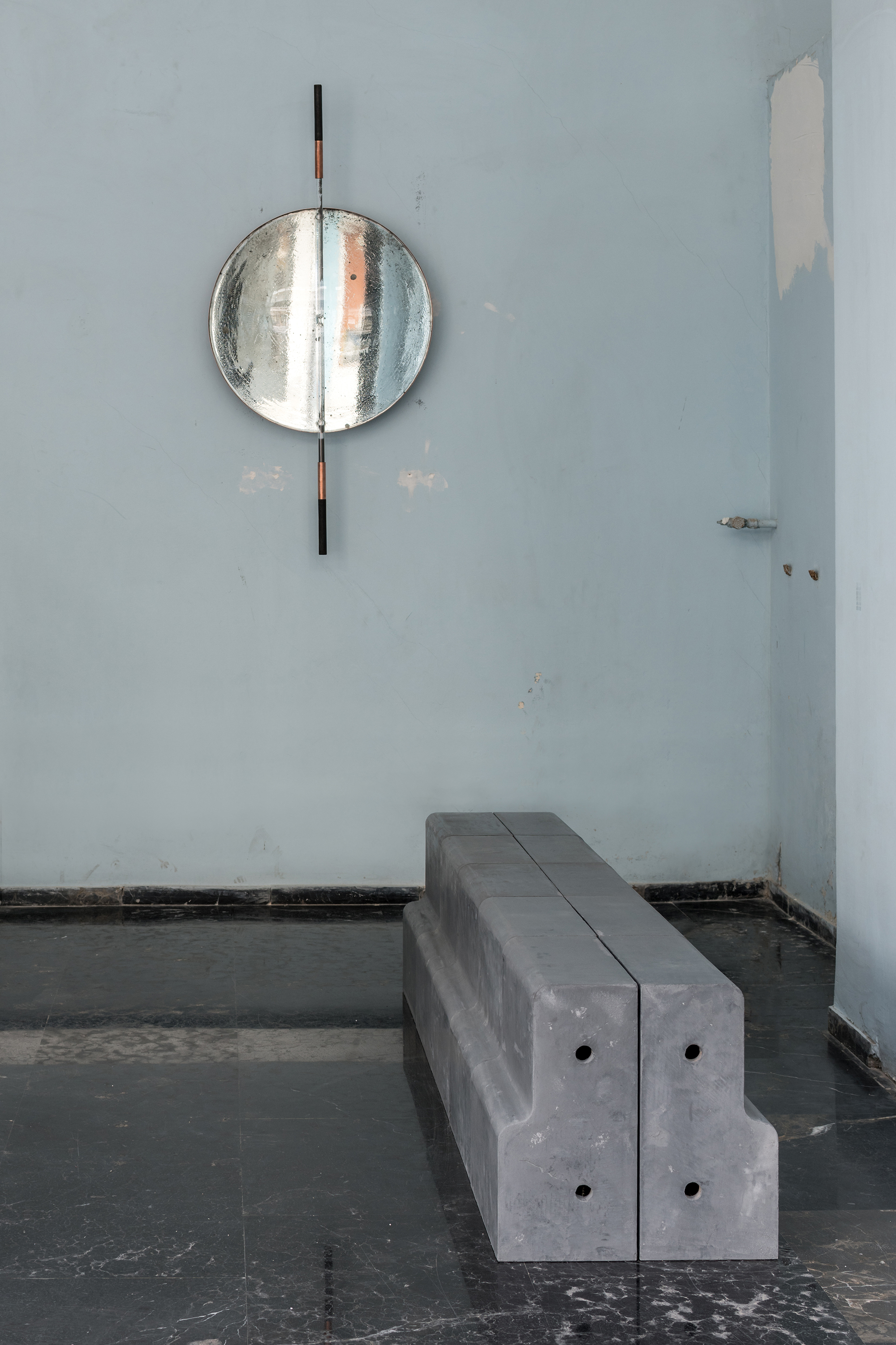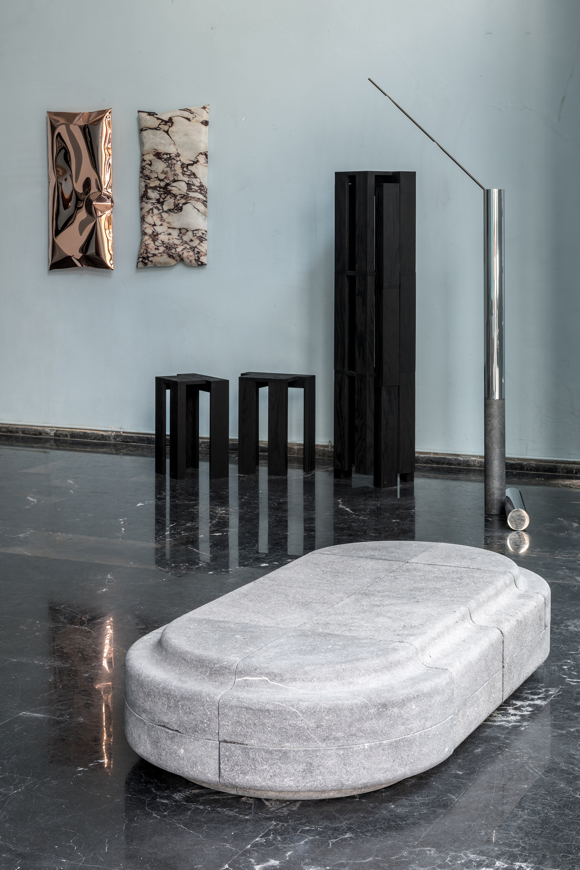 Designed to serve more than just a functional purpose, the installation offers a sensory experience. The show also investigates archetypal forms in contemporary cityscapes. The designs are raw yet at the same time refined. Simple shapes and duplicated shapes complement asymmetrical designs and organic surfaces. Materials like concrete and steel appear alongside marble and wood. The installation features a fresh take on street furniture; stools and a bench, lighting, a mirror, and modular shelving highlight the parallel between public and private spaces. Together, they create an urban setting that explores materiality and form as well as the relationship between the individual and the collective. The City Remnants exhibition runs from February 24 to April 9, 2022, at the Carwan Annex gallery in Athens, Greece. Photography© Giorgos Sfakianakis, Alexander Popelier.