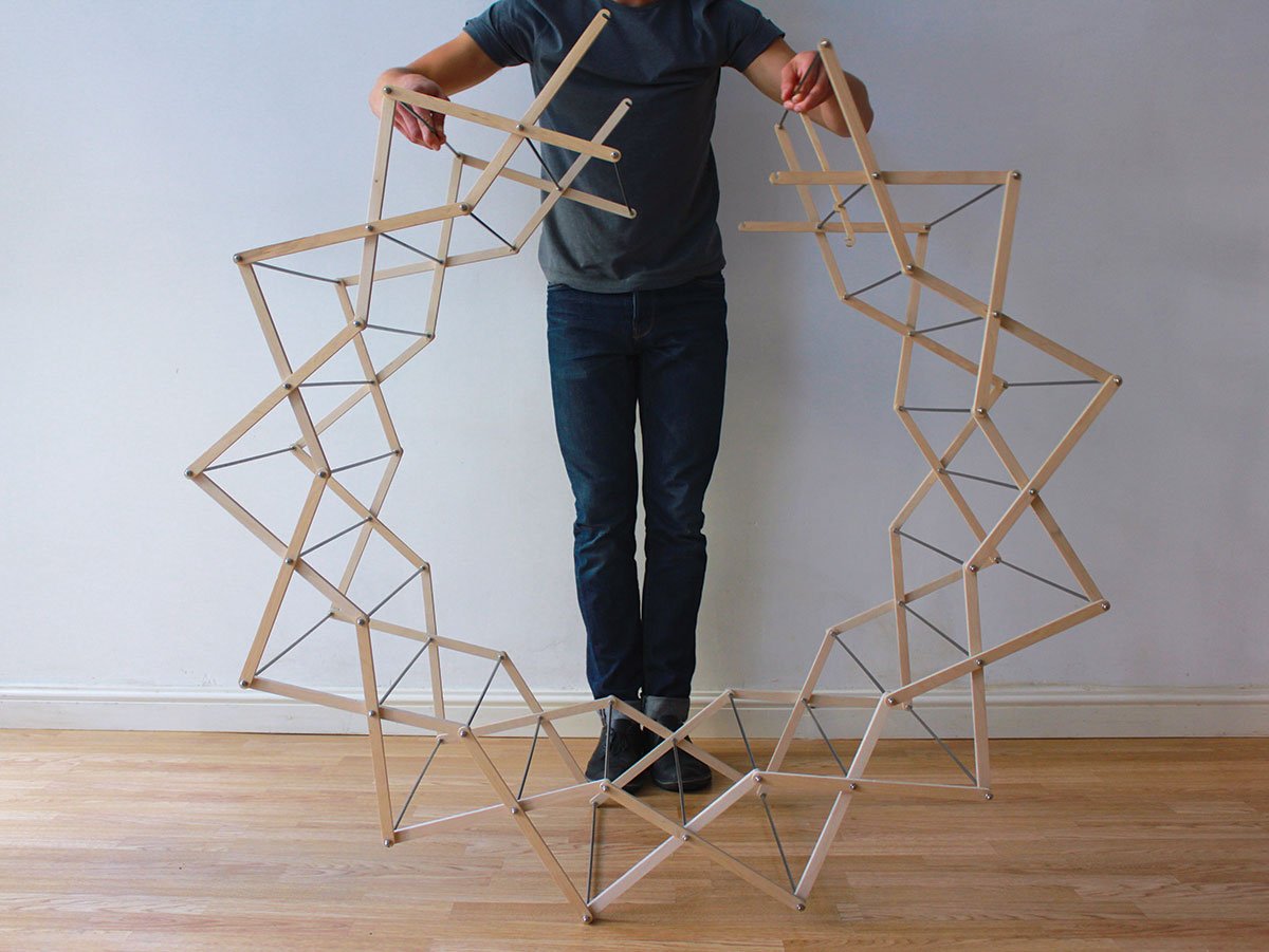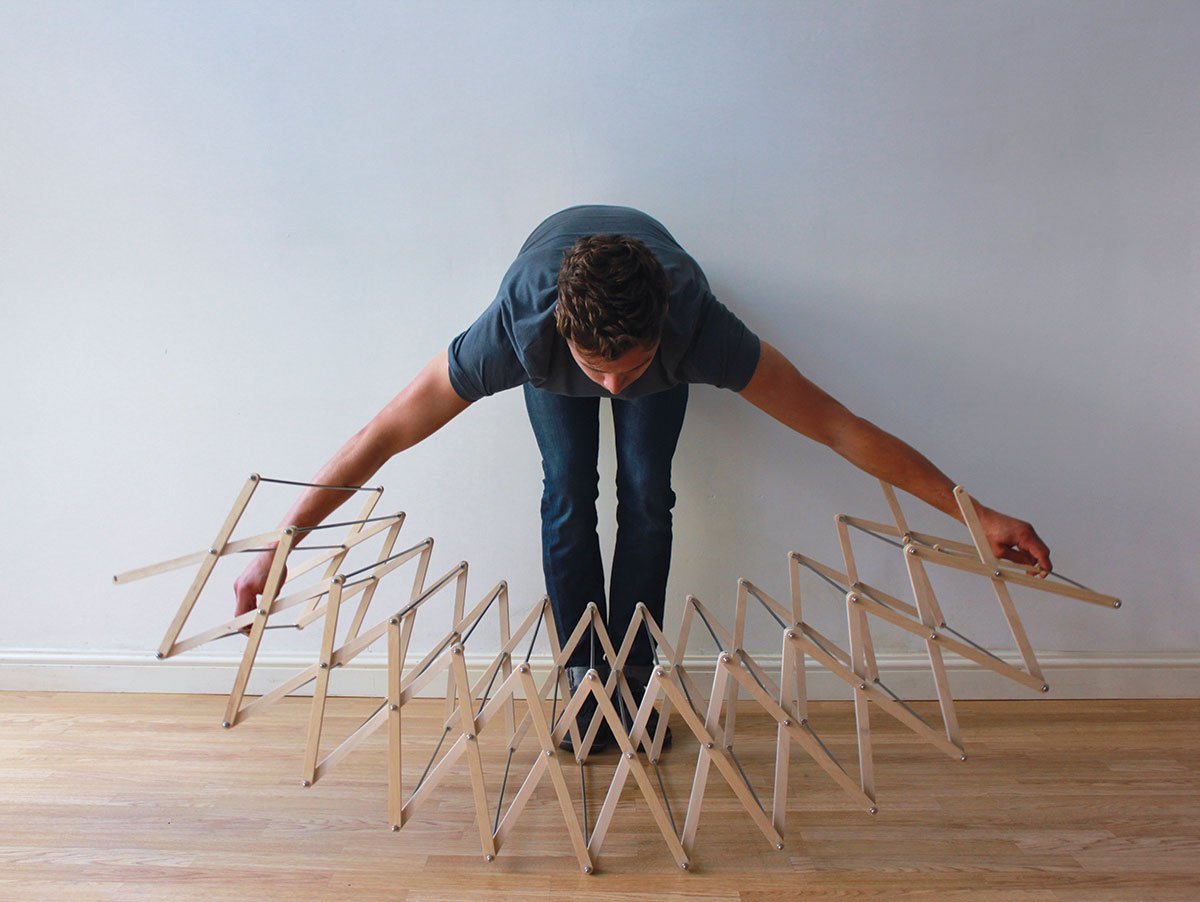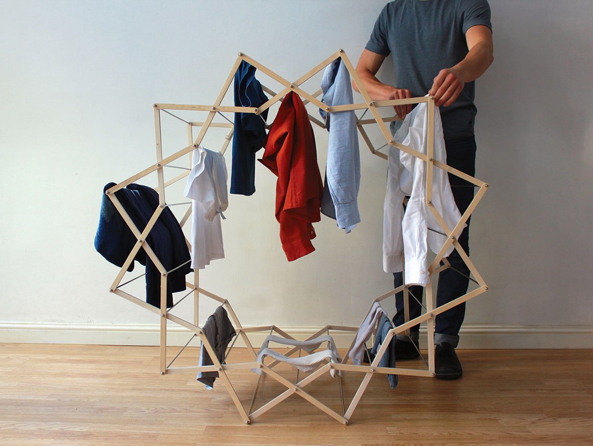 The starburst design of the Clothes Horse by Aaron Dunkerton twists and turns the old country varieties we have seen into a more modern model that doesn’t look too shabby while in use.  Even though wet clothes are draped all around the pegs, it’s different, fun, and it suits your apartment like a sculpture.  Made of beach plywood with brushed aluminum rods, it also collapses at its hinges into a perfectly uniform rectangle for easy storage. It hosts 36 available arms for drying. The artist explains the dynamics, “The shape of my clothes horse when erect allows for good air circulation around the clothes, which will help them to dry faster.”