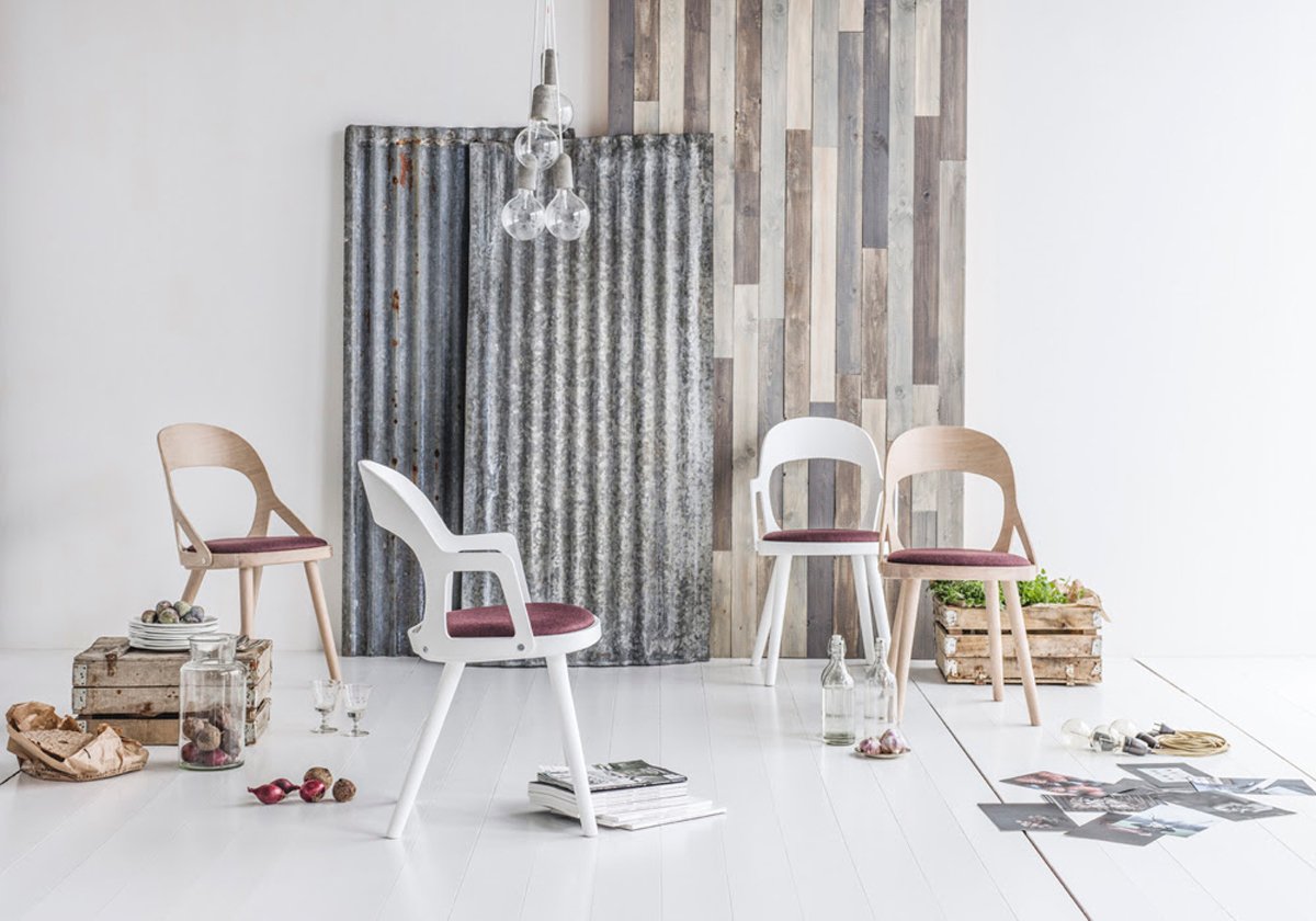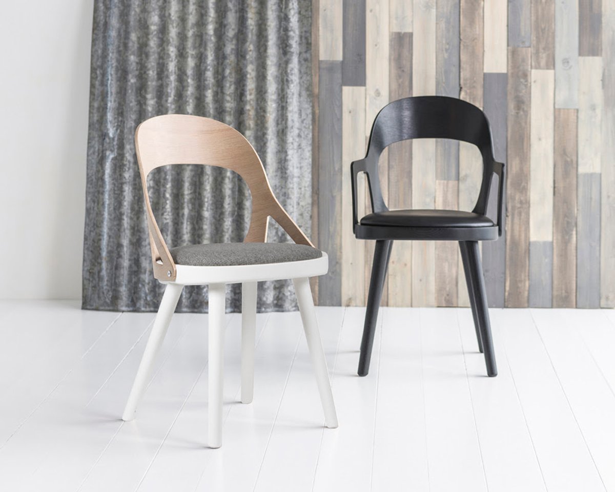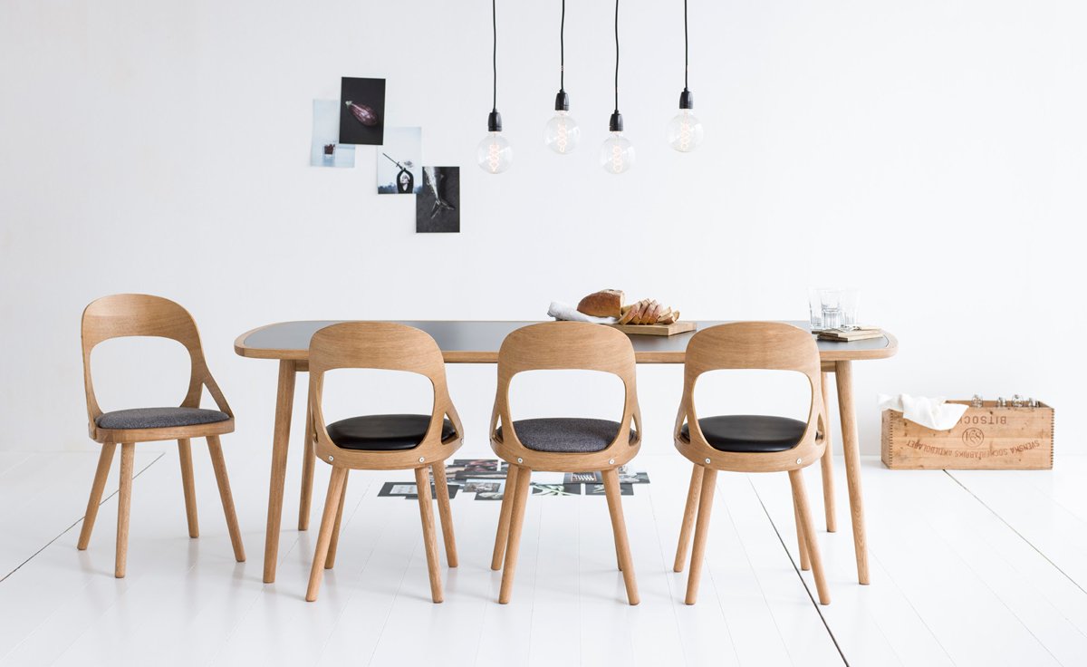 Designed by Markus Johansson for Hans K., the Colibri chairs update the classic stickback shape with modern flair. The tubular chairs can be customized with the buyer’s choice of different backs, bases, and seats. The backs, which come with or without armrests, and the bases are available in oiled natural or blonde oak as well as painted white birch and dyed black elm. The seats are upholstered in heather, ash, or plum knits or in bonded black leather. The various options can be matched for a striking monochrome look or mixed and matched for a more complex neutral palette.