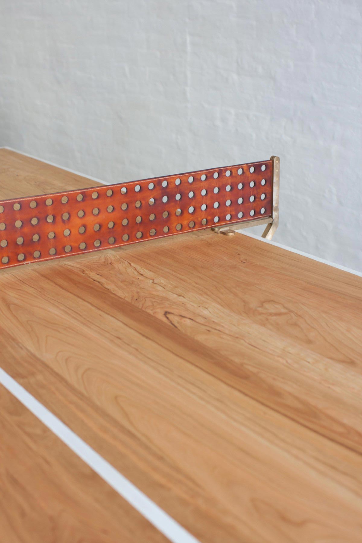 The furnishing is made of locally sourced hardwood and leather. Specifically, the tabletop is cherry, the legs are maple, and the detachable net is leather with a chestnut patina. Handcrafted in Philadelphia, the piece is valued at $13,500, not including customizations and add-ons such as the paddle set and leather sleeves. The furniture is available for purchase at the BDDW showroom in New York.