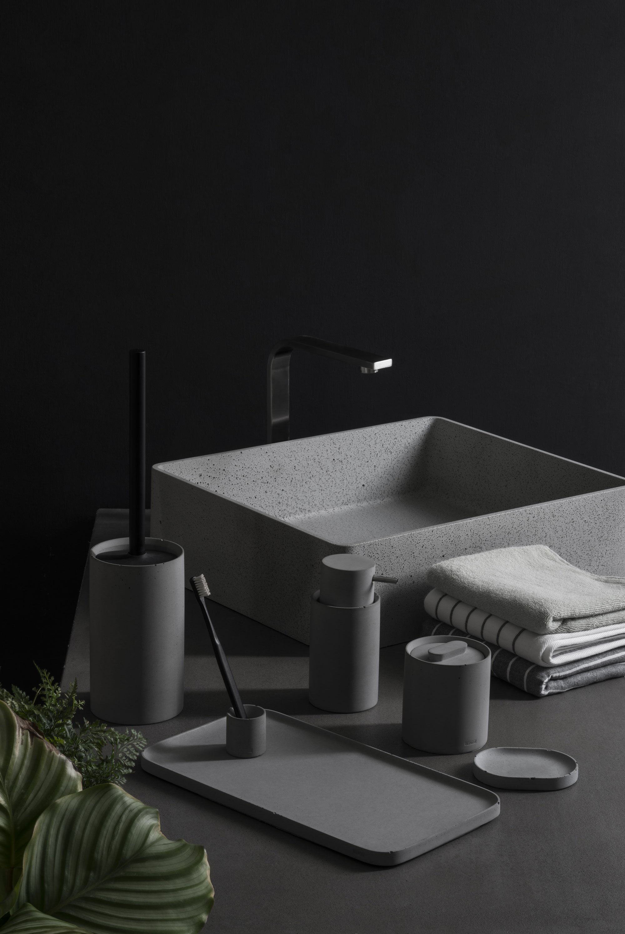 Thanks to their clean, understated design, all of these concrete bathroom accessories work well together or on their own. The user can mix-and-match products as needed and use Hui in any bathroom decor. An elegant solution to organize essentials while enhancing the look of a bathroom. Photographs© Bentu.