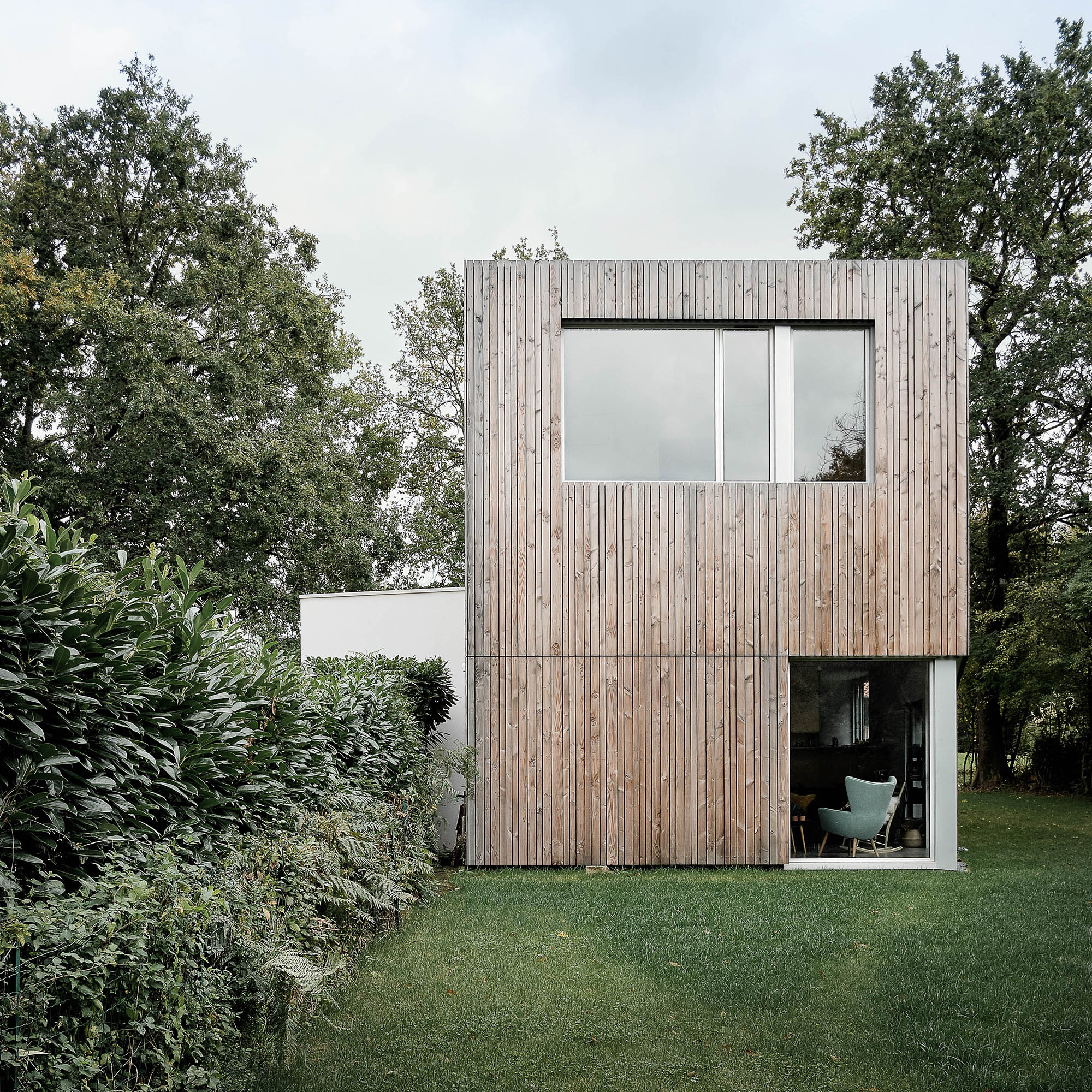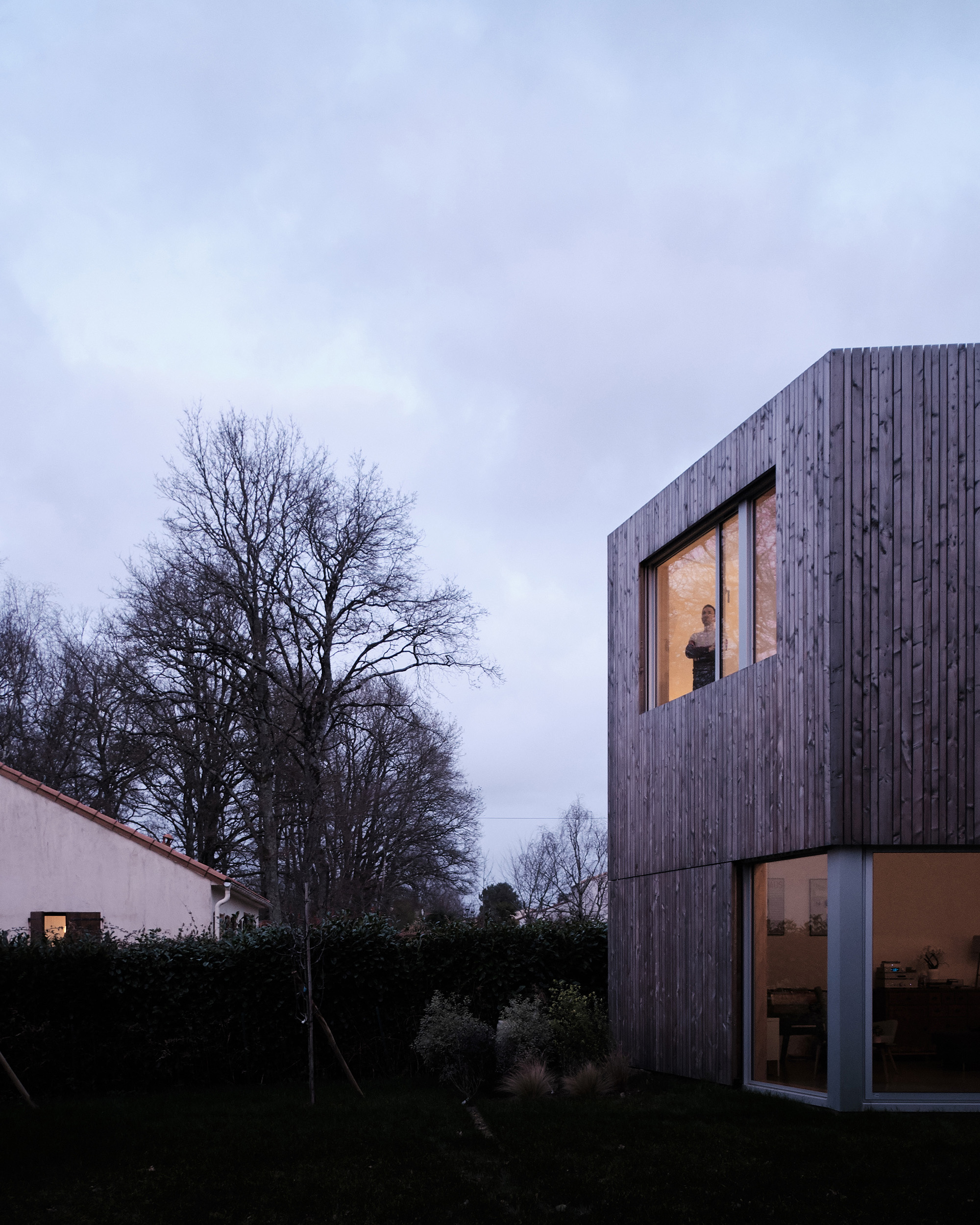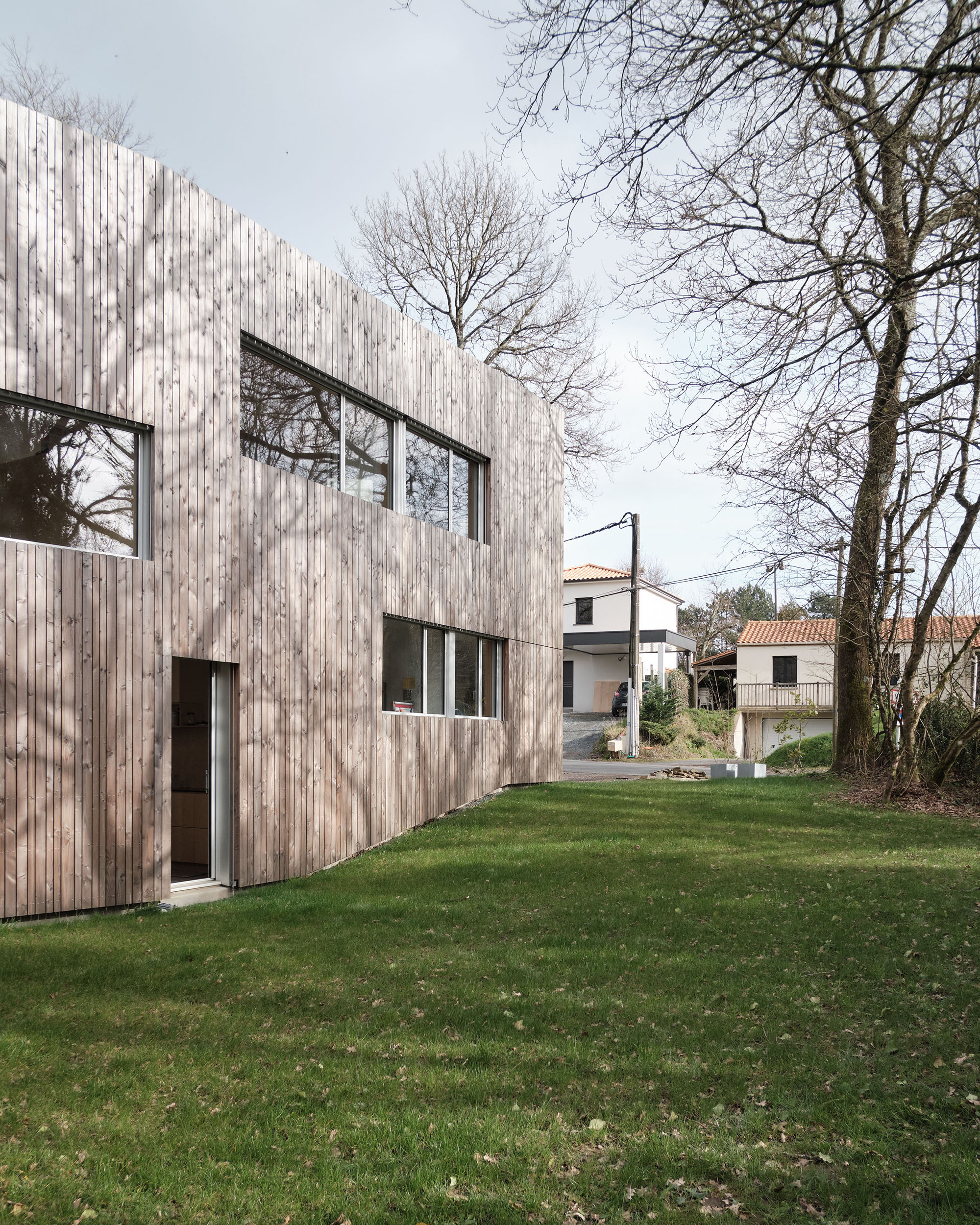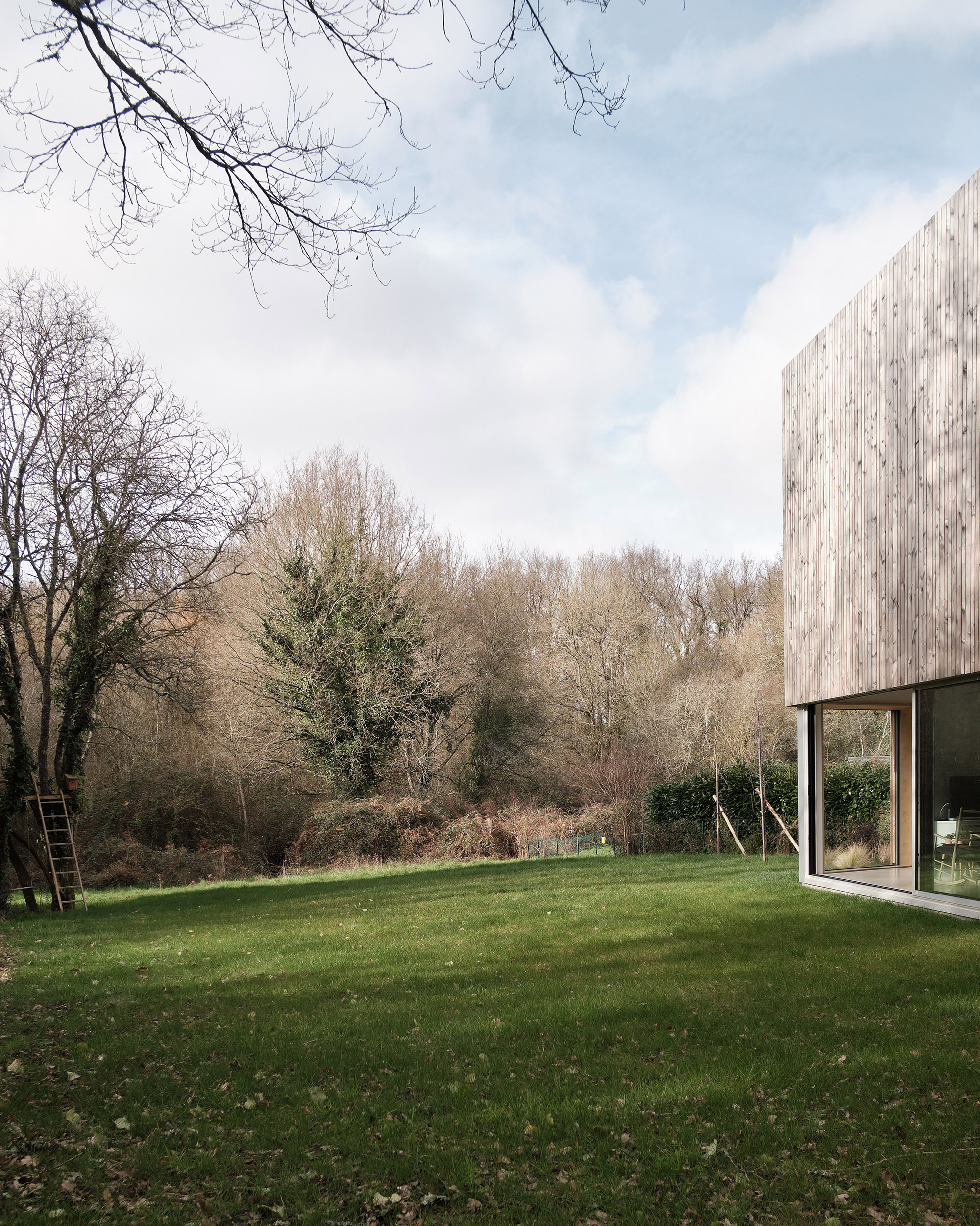 Built in a rural setting in Vertou, western France, C&T.B House is contemporary but easily blends into the landscape thanks to its minimalist design. Architecture firm Atelier Mima designed the house with a wooden exterior and a simple geometry that also incorporates some asymmetrical elements. The house stands at the edge of a cluster of homes. It acts both as a boundary to the suburban plot and a link to nature. Towards the road, the volume boasts an almost closed facade and a simple form, while on the other side it features many openings arranged to optimize the views. The use of wood for the cladding also aims to provide a natural backdrop for the surrounding greenery.