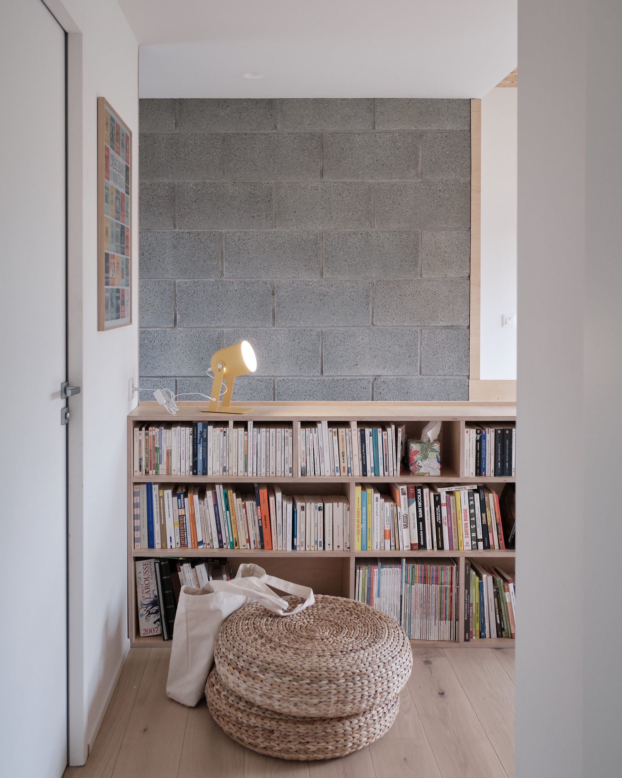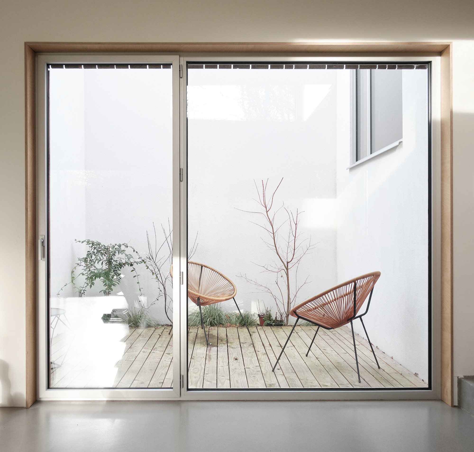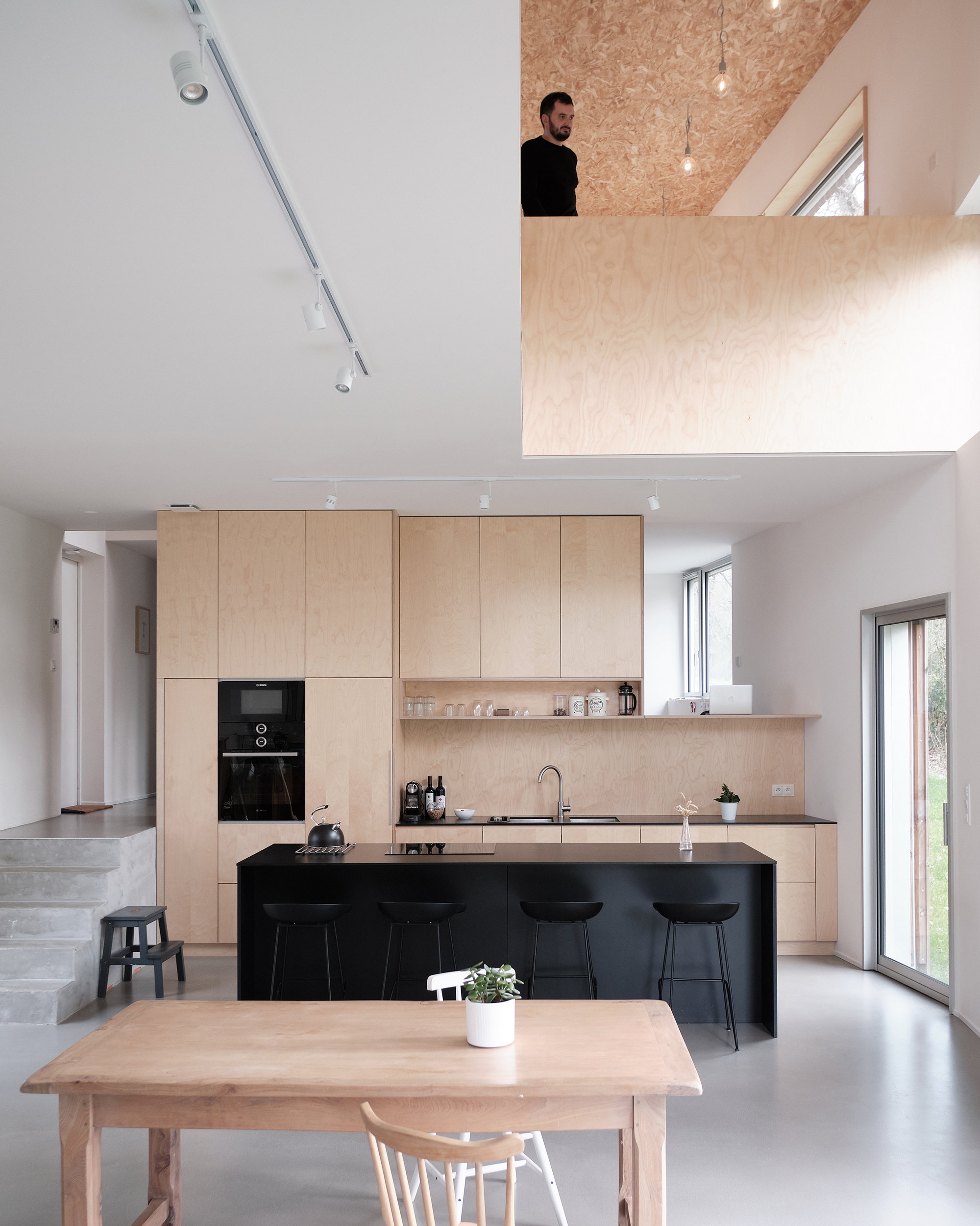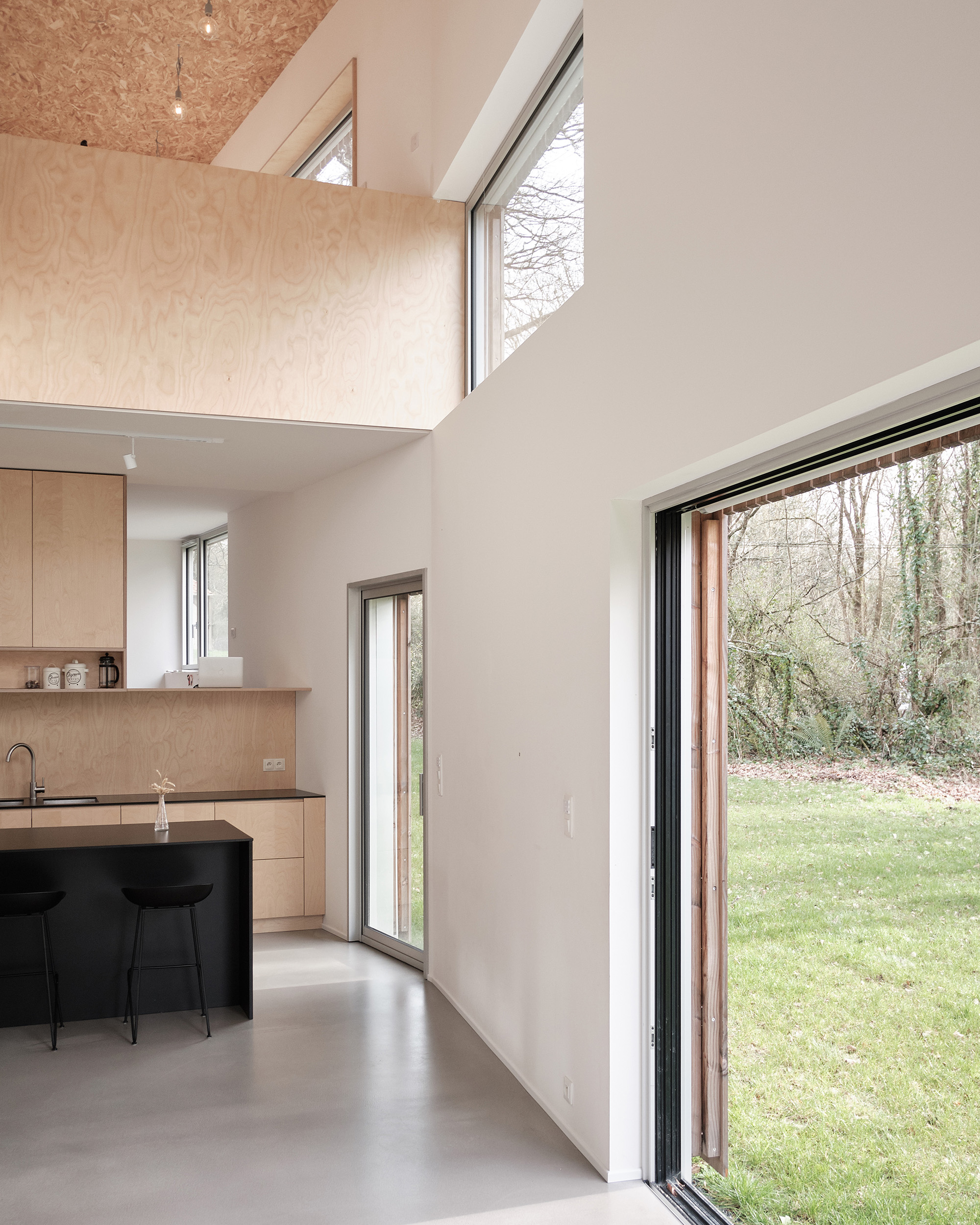 Inside the house, the studio designed airy spaces that flow into one another. The minimal material palette and pale colors allow the landscape to have a stronger presence in the interior. Polished concrete and wood flooring appear alongside plasterboard, wooden furniture, and white walls. Large windows amplify the relationship between the living spaces and the bucolic setting. A double-height ceiling links the ground floor with the upper level. Downstairs, there’s a kitchen, dining room, and a living room, while the upper level houses the bedrooms. The mezzanine area contains a quiet office and a cozy reading space. An outdoor area with lounge chairs and decking provides a comfortable space to relax and admire the pastoral setting. Photographs© Atelier Mima.