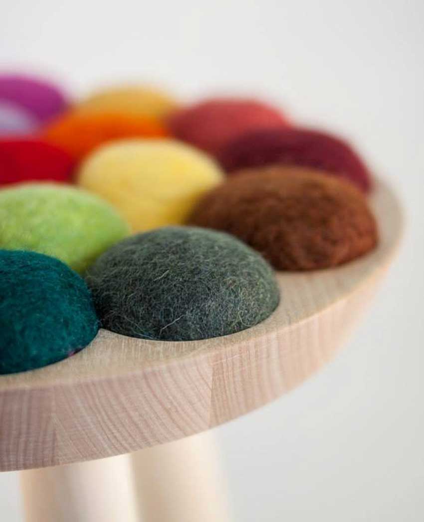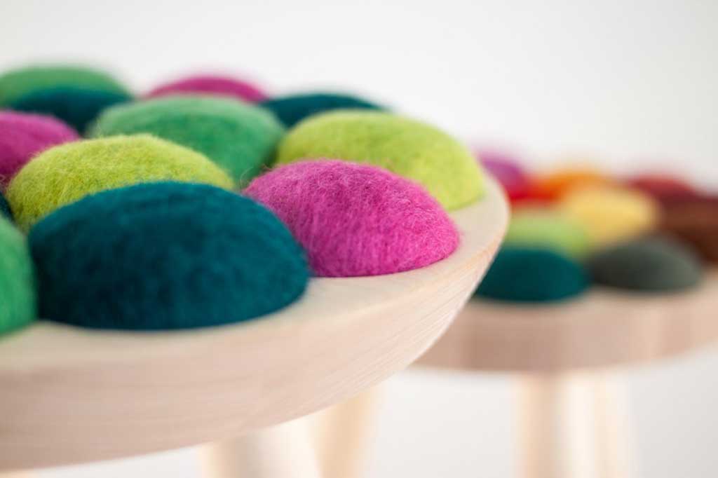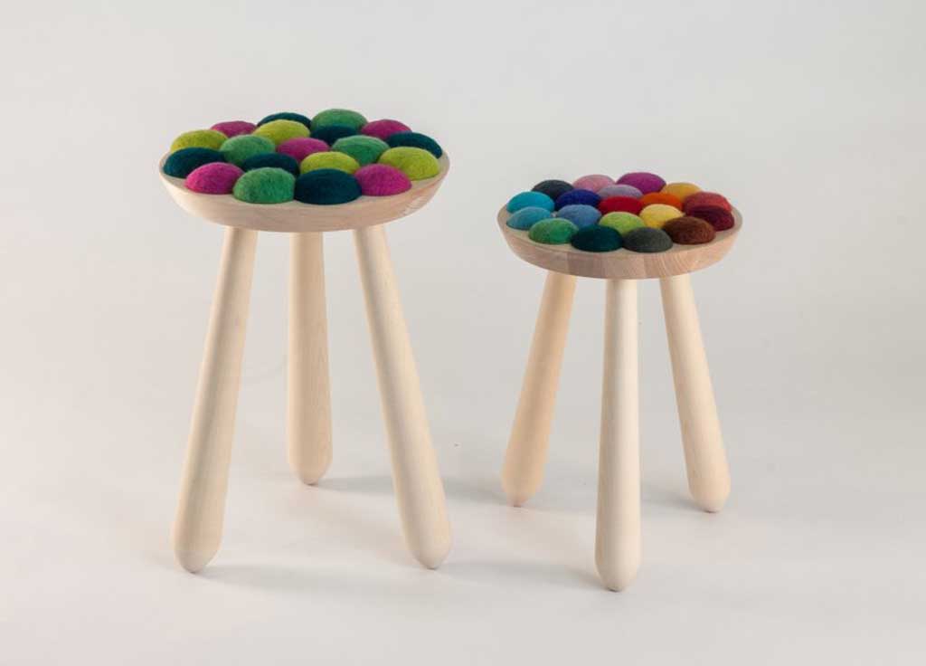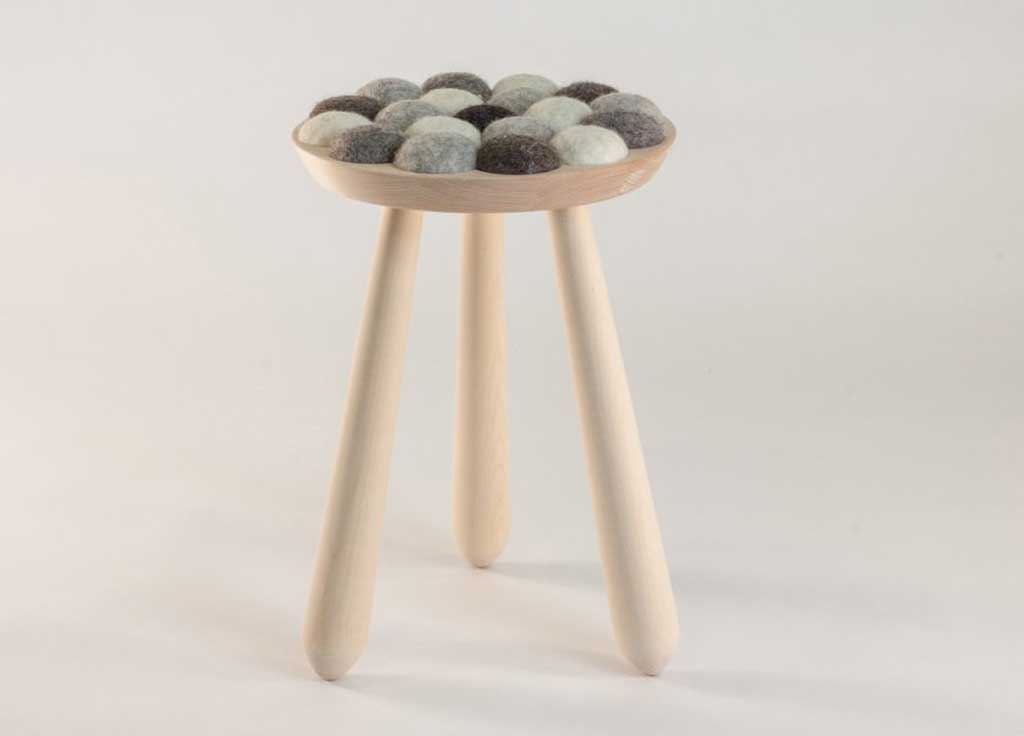 Cool with Wool is a whimsical stool by Norwegian designer Aud Julie Befring. The seat is made of birch wood and cushioned with rounds of felted wool, which come in a variety of colors and can easily be exchanged for handmade options as well.
