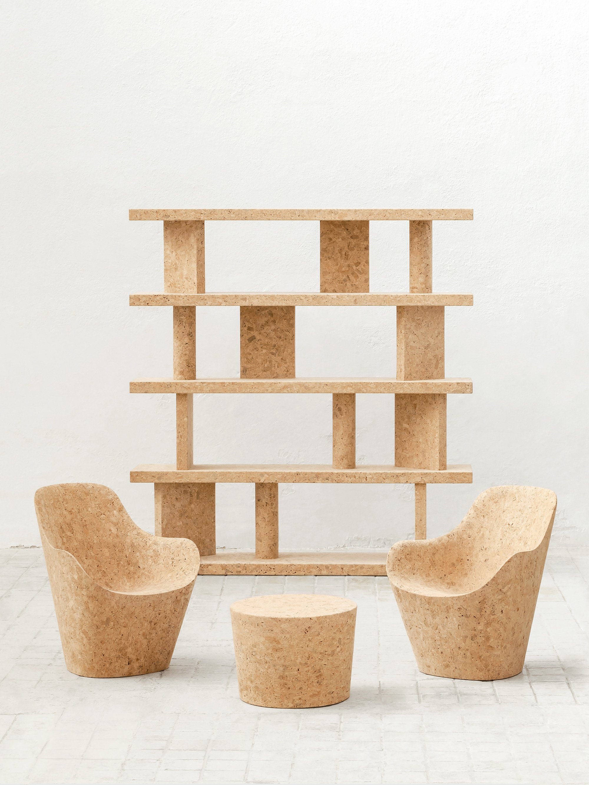 Crafted from wine bottle stoppers left over from cork stopper production, the Corks series is beautifully textured and eco-friendly at the same time. Cork doesn’t require the cutting of the tree, only the harvesting of the bark which then regrows. This limited edition collection includes a fireplace surround and dining table, chairs and a chaise lounge as well as bookshelves and stools that double as side tables.