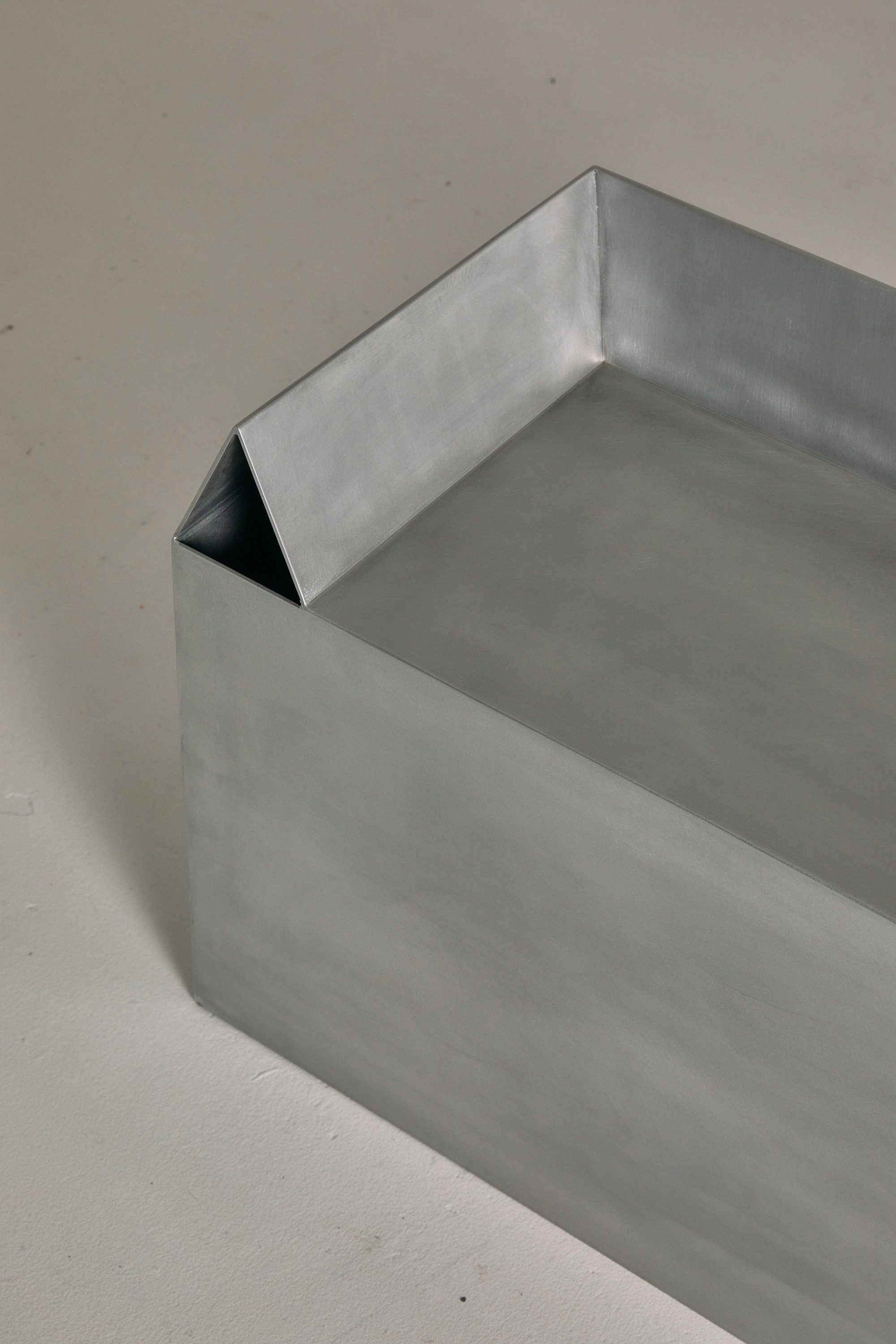 The bench provides seating spaces for more people and features the line’s signature gable roof-like backrest. Completed in an L-shaped form, it allows the user to extend the bench with a stool. Wider and with a taller backrest, the lounge seat offers a comfortable solution to take a break with a cup of coffee or a good book by a window. All three pieces of furniture come in different versions. Apart from brushed aluminum, the studio also produces the Corner collection in raw steel, patinated steel, or solid wood. Other materials and finishes are also available upon request. Photographs © another bureau of design.