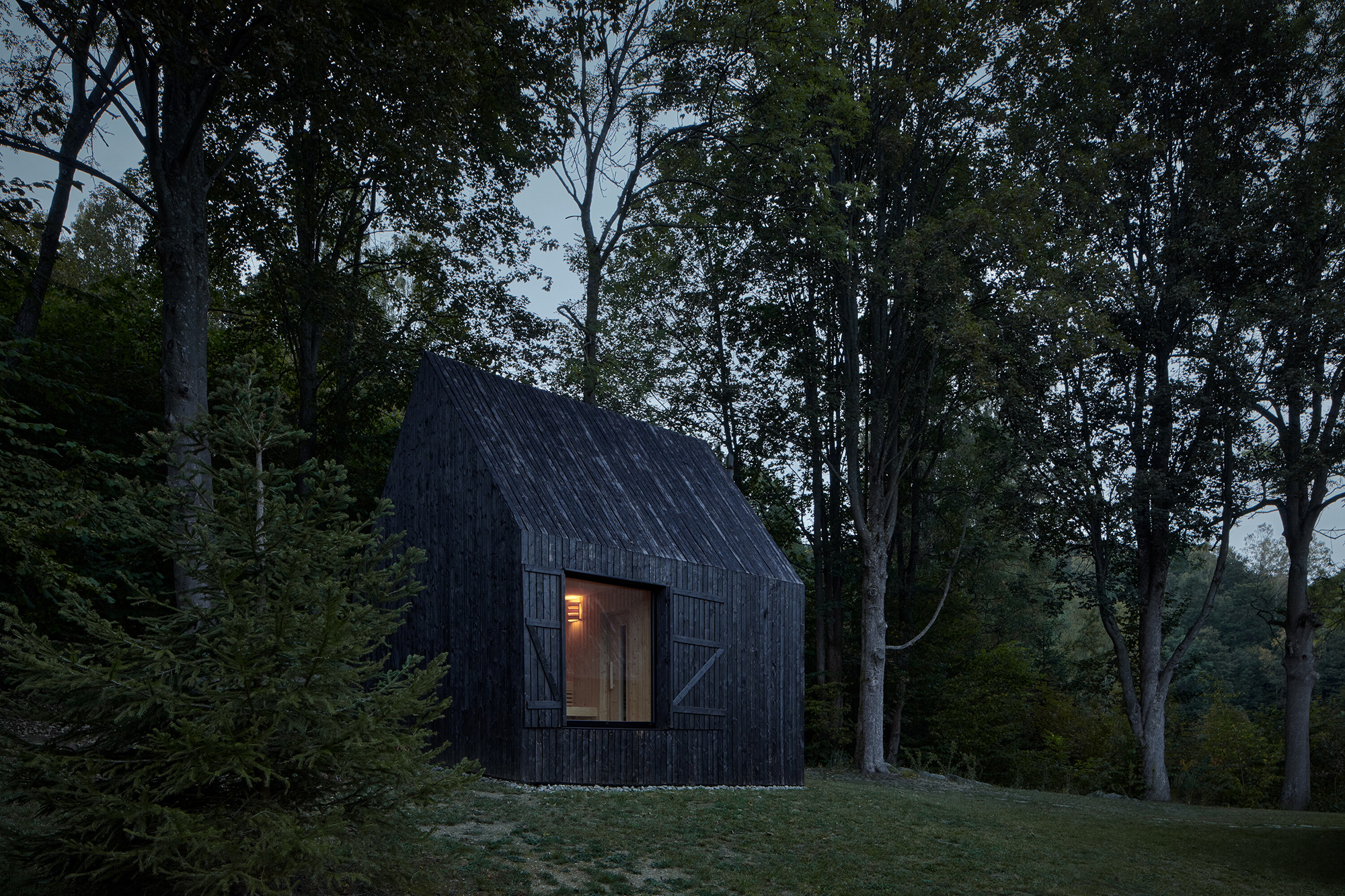 A cottage designed with dark cladding that covers the walls, roof, and chimney.