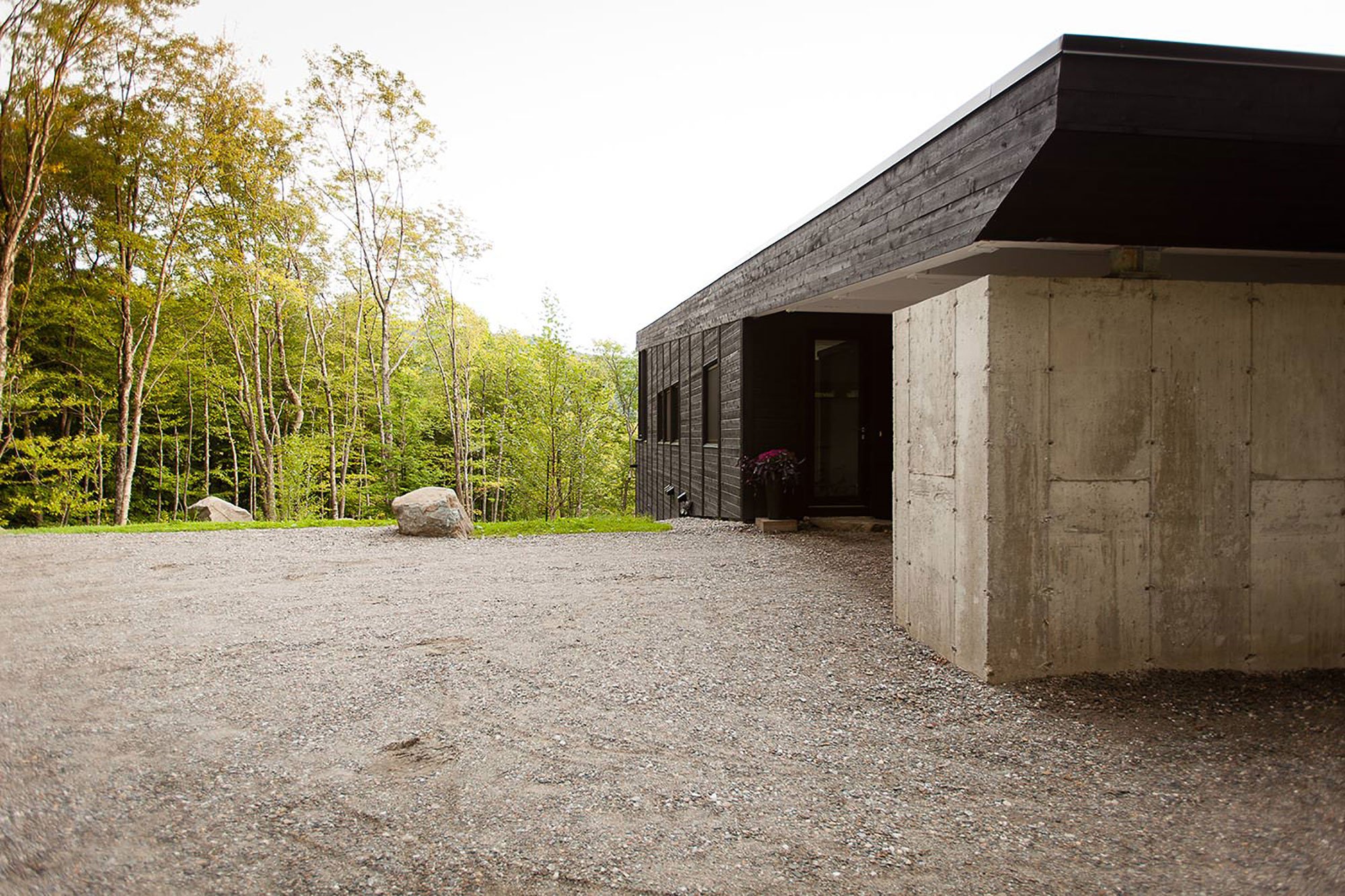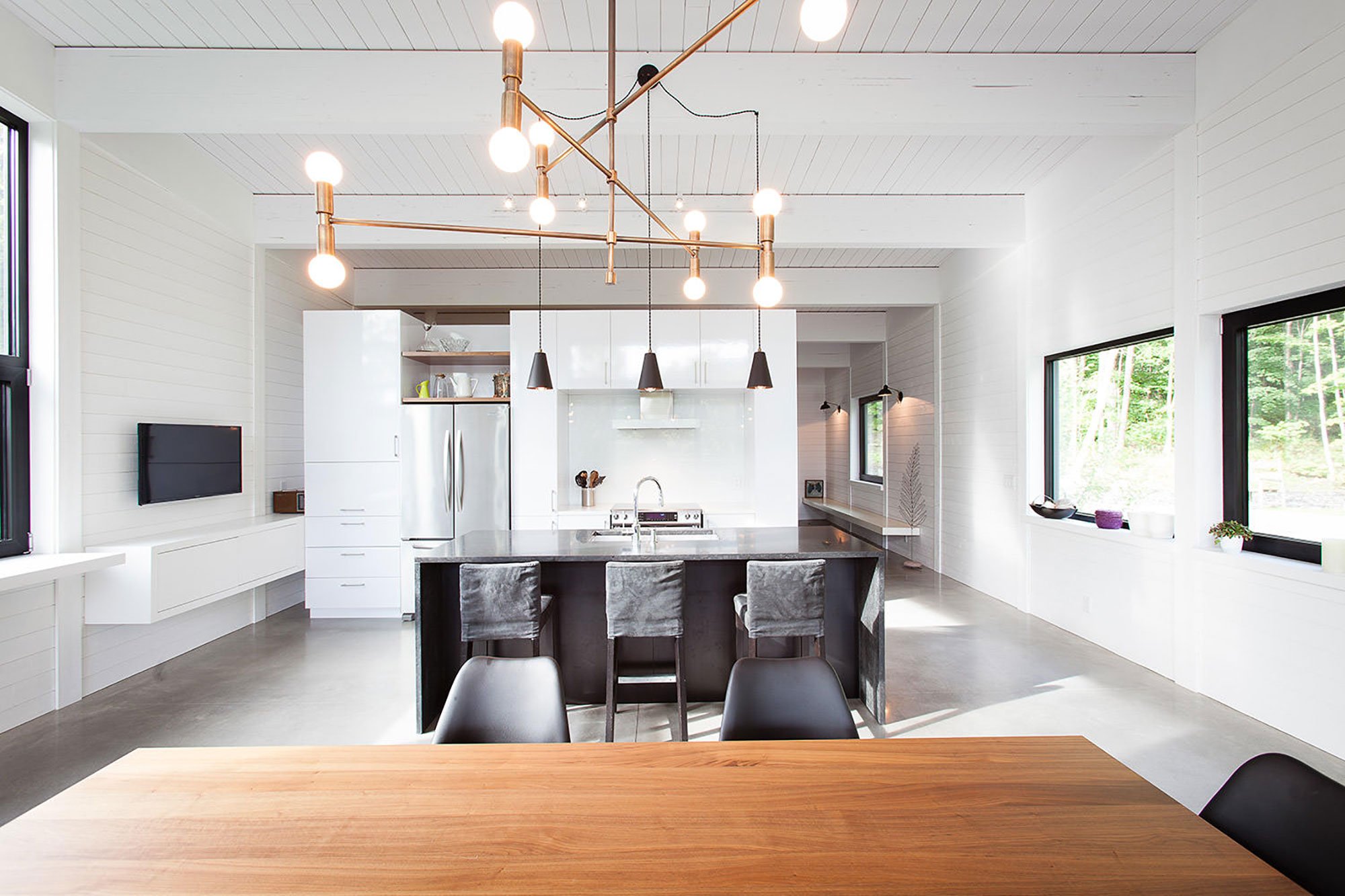 The house’s axis points towards the south. Using the steep slope of the terrain, the architects created two levels on the southern end of the house. Large windows overlook the forest and Mount Sutton beyond, linking the living spaces to the gorgeous panorama. The kitchen, dining room, and lounge open towards a covered terrace that offers uninterrupted views over the landscape. Photographs© Claude Dagenais.
