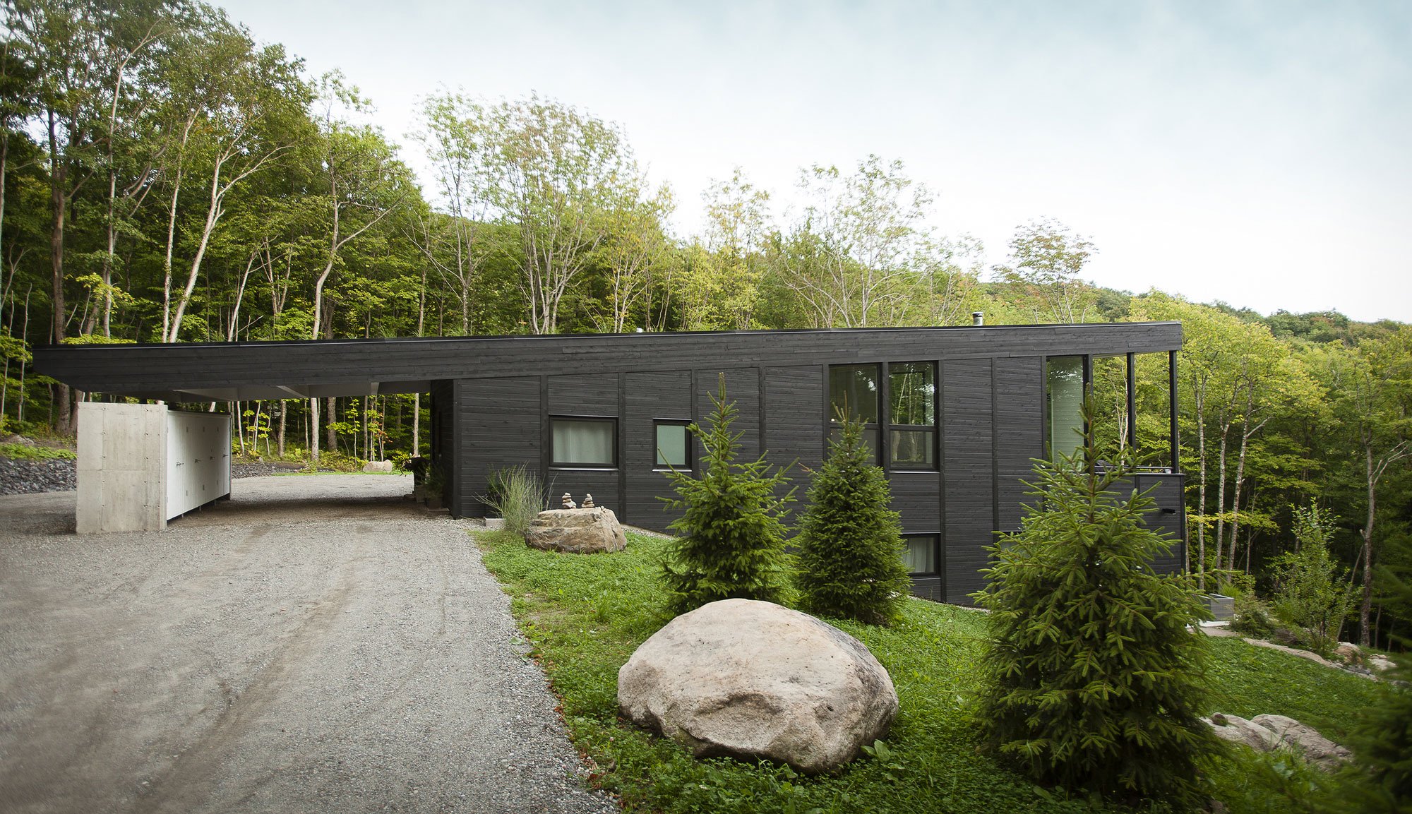 Built on a steep slope in the small town of Sutton, Quebec, this mountain cottage makes the most of the setting with an ingenious design. At the same time, the cabin blends into the landscape thanks to clever features. The Paul Bernier Architecte studio designed the weekend home as a ski retreat for a family with two children. The slope’s angle heavily influenced the house’s shape and character as well as the distribution of the living spaces. Inverted to the topography, the roof offers protection from the nearby road on the northern side while also blending the structure into nature. During the summer months, passers-by see only a green roof above the concrete garage. Throughout winter, the snow makes Cottage in Sutton almost invisible.