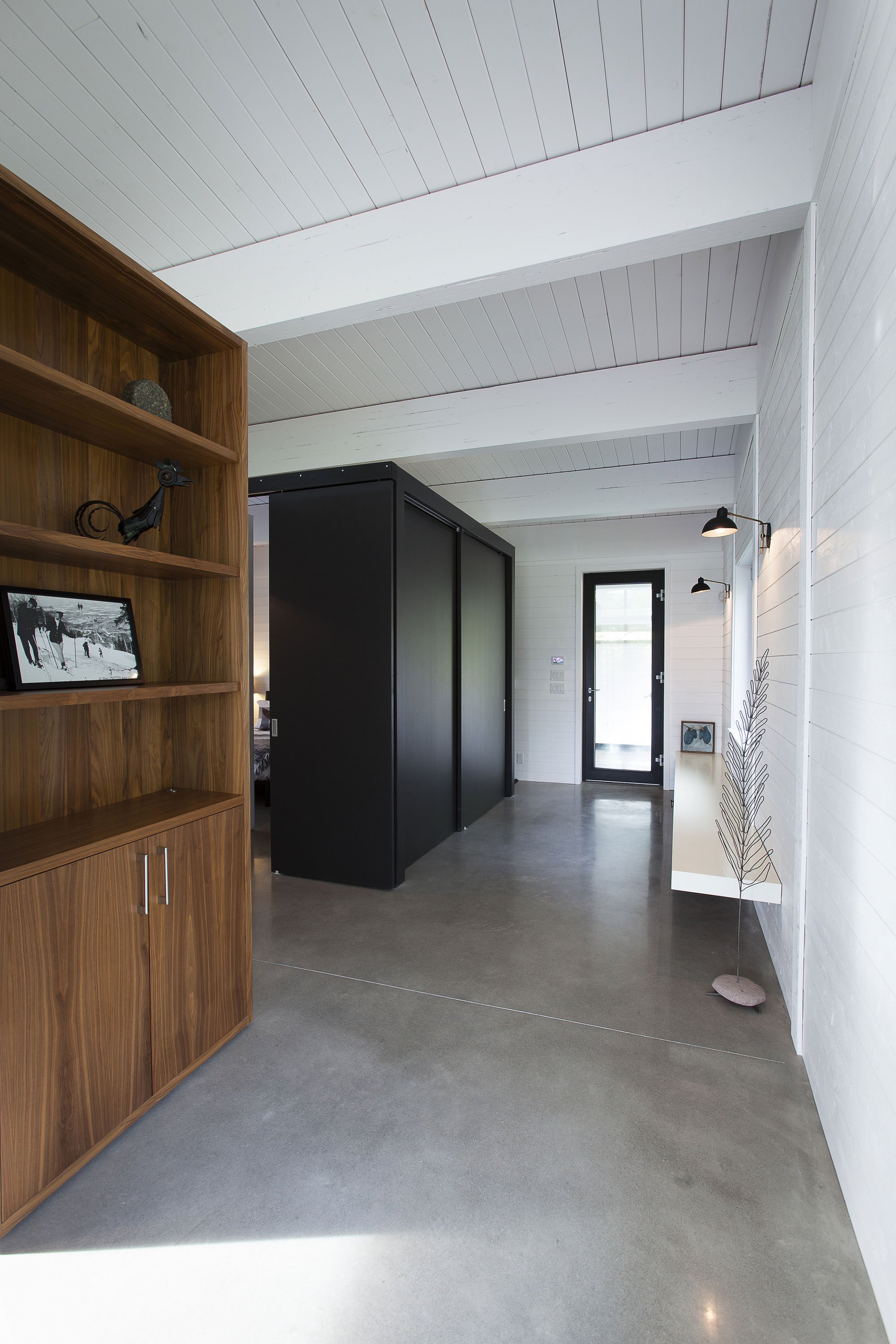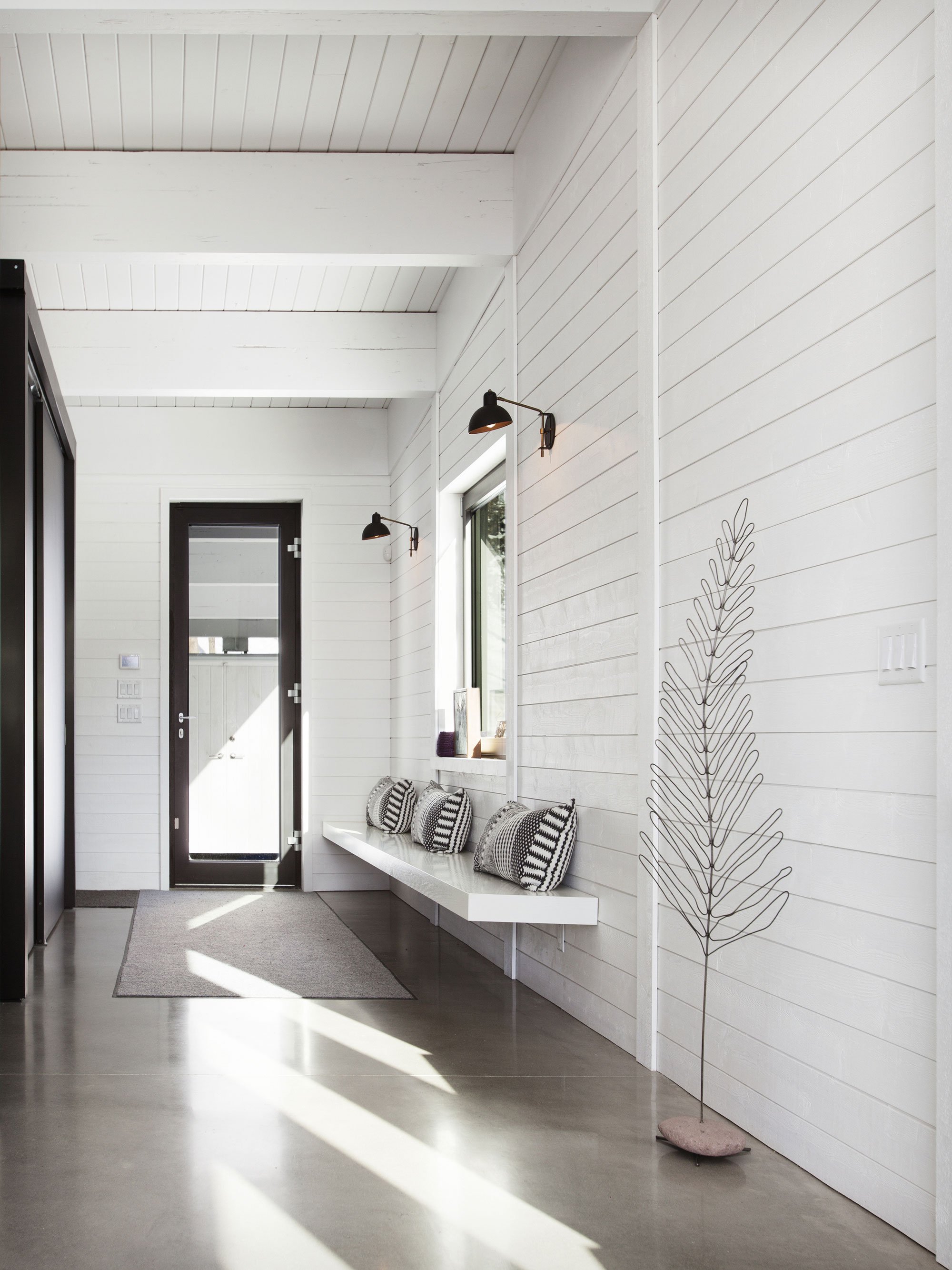 Apart from offering shelter for cars, the concrete wall on the north side also protects the structure from water rushing down the mountain during the snow melting season. Black cedar planks cover the cabin’s outer walls in a classic horizontal pattern. At regular intervals, vertical planks mark the position of the structural columns, a design decision that creates a distinct rhythm both outside and inside the cottage. In contrast to the dark exterior, the interior features white wooden walls and ceilings. Here, the vertical columns support the roof beams. In a nod to industrial design, black steel frames the windows and polished concrete covers the floors. The eclectic decor and furniture brighten the interior while wooden surfaces bring more warmth.