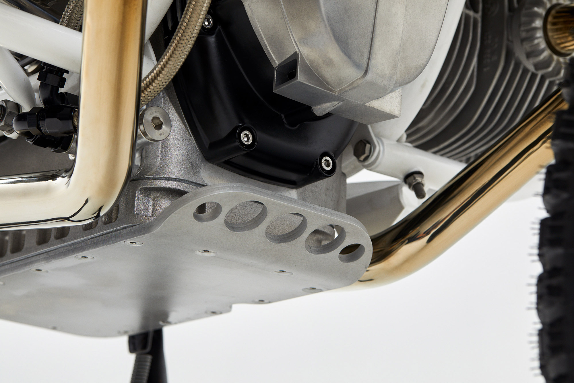 The custom bike now features a more powerful engine as well as better torque. While the engine originally had a capacity of 797cc, it now has 1001cc and a horsepower output of 72 hp. Strengthened with a series of reinforcing parts, the chassis can now handle the demands of journeys of thousands of miles. Re-balanced to work better with the more powerful engine, the crankshaft, flywheel, rods, and pistons ensure a smooth throttle response. A Siebenrock GS2 exhaust, an open rally air filter, and Bings carbs enhance the engine’s efficiency.