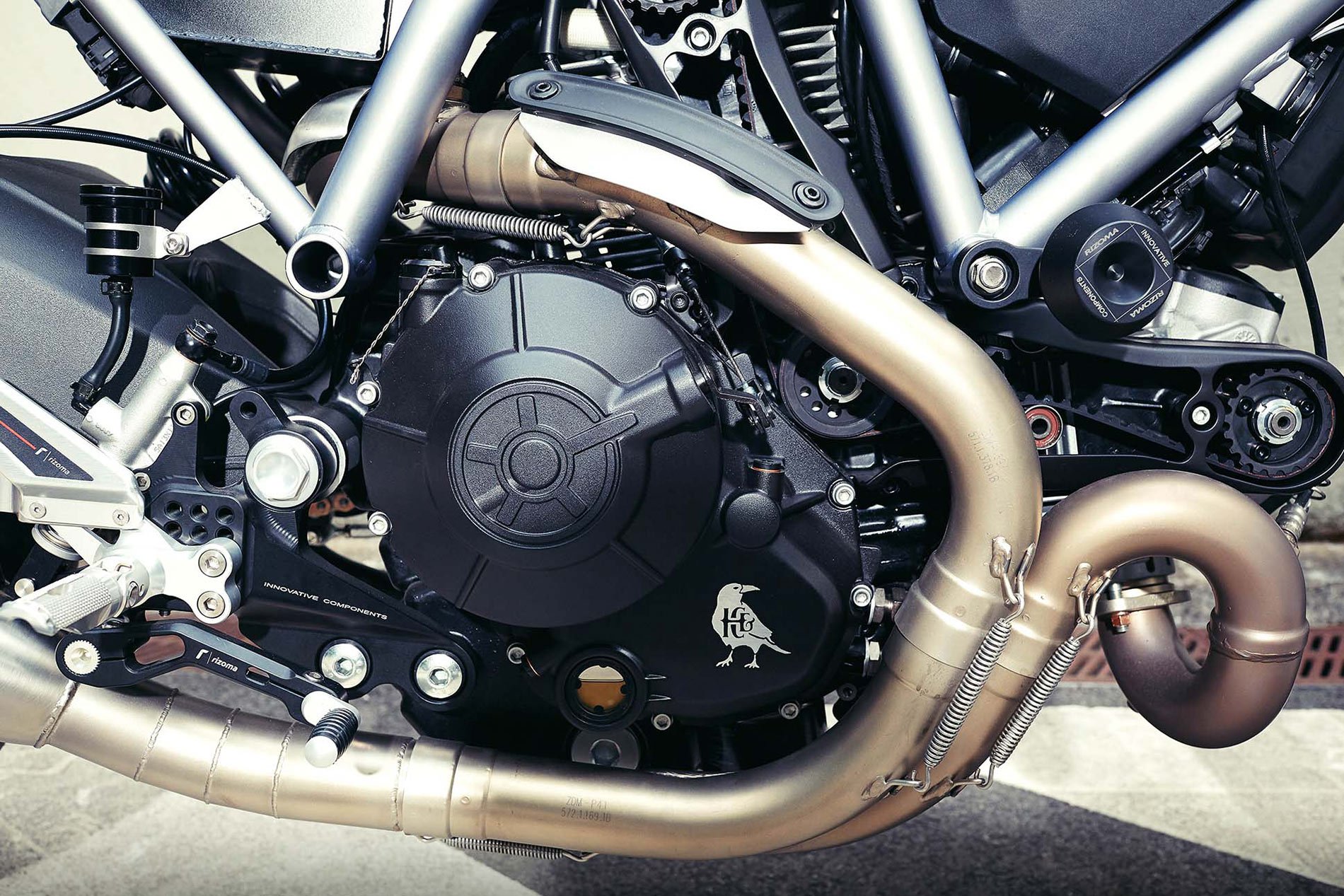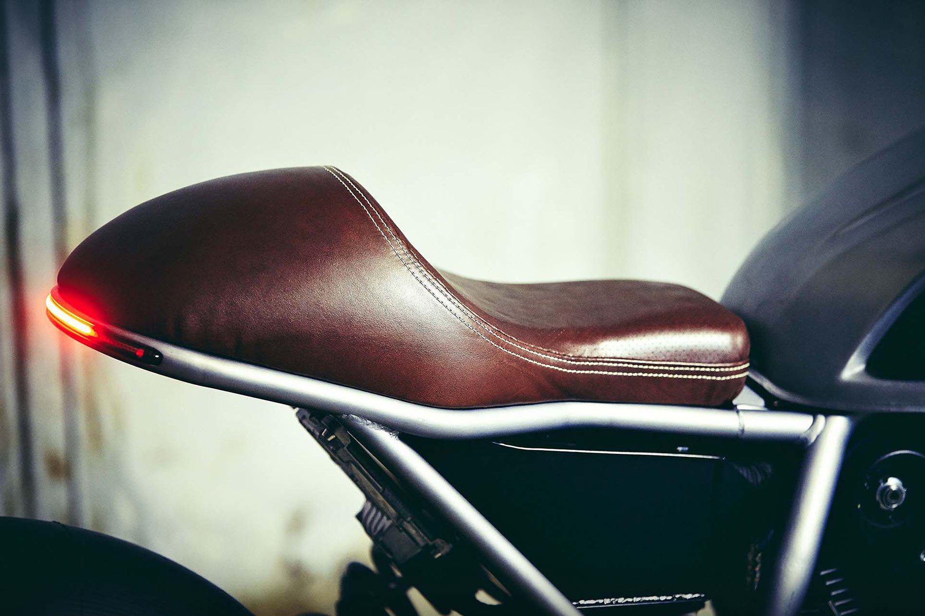 Working with this in mind, the team didn’t want to invest in parts and labor that would end up being ruined by the nature of riding a Scrambler, and instead put their efforts towards making the bike faster and cleaner. The plan was then to keep the bike lightweight and powerful through the inclusion of high performance parts, LEDs, fuel injection, and more advanced suspensions and brakes. Besides simply giving the bike a makeover, the team felt they were filling the café racer niche that today’s market no longer finds room for. Their mod worked to keep the bike’s weight as light as possible, achieving a 145Kgs dry weight (around 320 lbs), so that it could perform more efficiently especially when taking a tight corner. Holographic Hammer then collaborated with a string of experts to upgrade the chassis, rims and other parts that would have been impractical to try and do all in-house. This kind of teamwork is important, as it builds partnerships among specialties, and in the future will lead to designs as sleek as the Scrambler Hero. With custom milled parts (including a subframe made in-house), carbon fiber rims, a brand new seat (also made in-house), a modified exhaust to fit a new silencer, and a stylish black and bronze color scheme, the bike offers all the beauty of a café racer with the rugged durability of an off-roader.