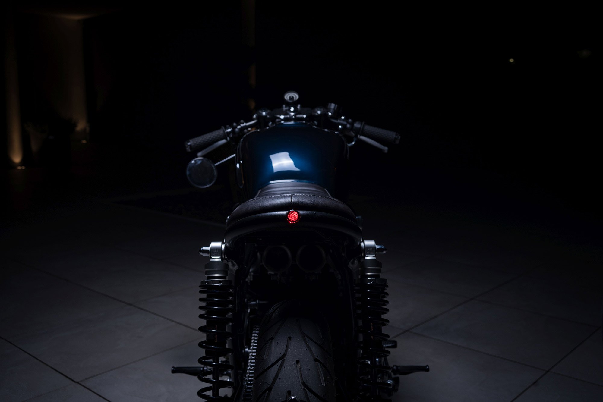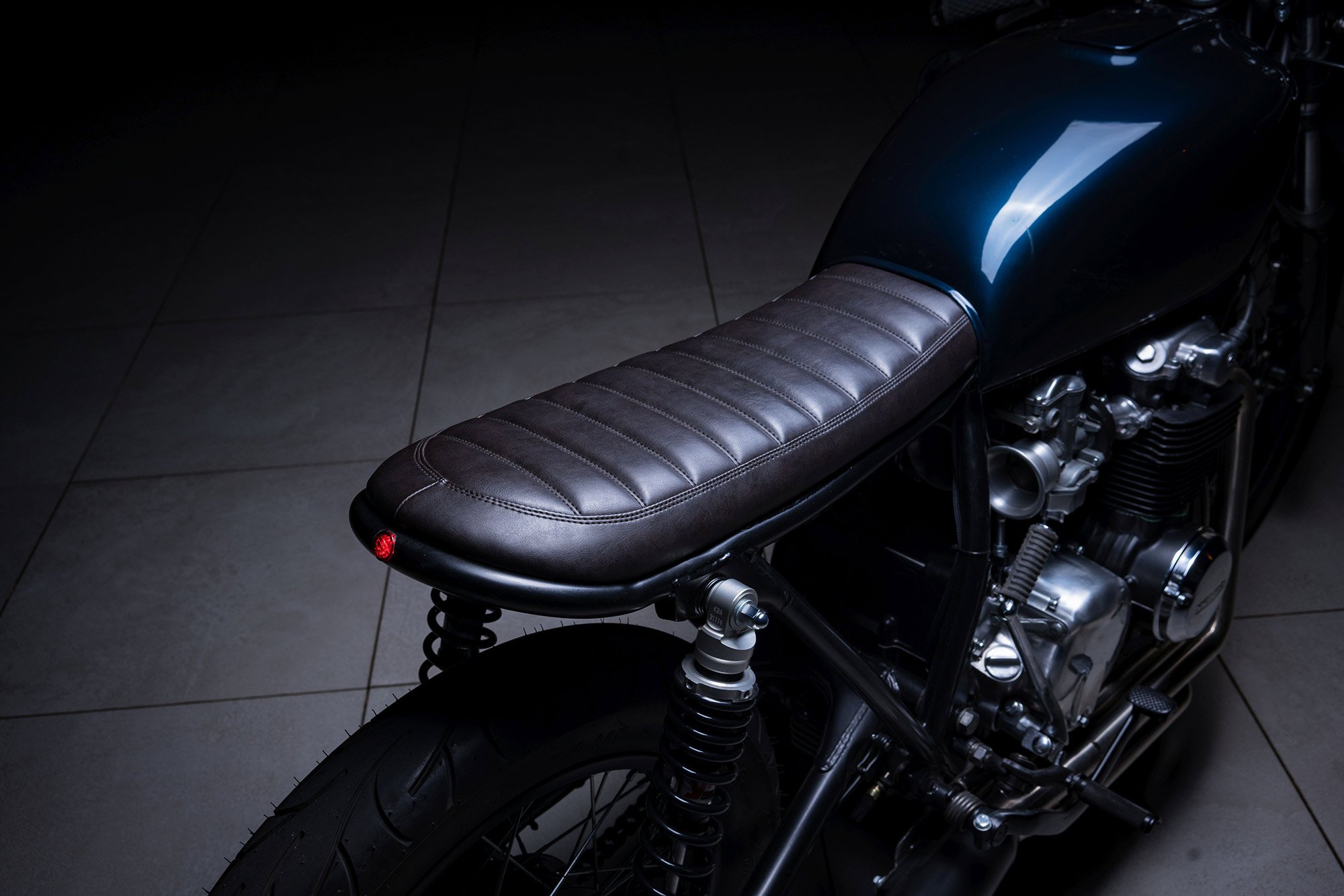 At the front, fork tubes ordered from Japan sit alongside new fork springs from Wilbers. Other changes include LED lights, a round headlamp, and an analog MST Speedster gauge. Built from scratch, the seat features dark brown leather and an aluminum base plate. The deep blue color of the tank adds the perfect finishing touch to this custom Honda CB cafe racer. Photographs© Christian Motzek, Elemental Custom Cycles.