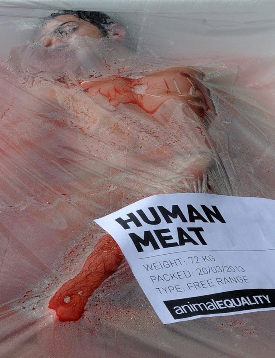 Grotesque and shocking, Animal Equality presents human meat, fresh packaged from the butcher. They are a group that strive to, “achieve equal consideration and respect for animals, and the abolition of animal slavery.” On the “Day Without Meat” in Barcelona, Spain this international non-profit animal defender dressed models in nude undergarments covering them with fake blood and a plastic wrapping.  Their purpose was to raise awareness encouraging people to stop eating meat.  Certainly an eyebrow raising event, and I think most of us can agree “point taken”.