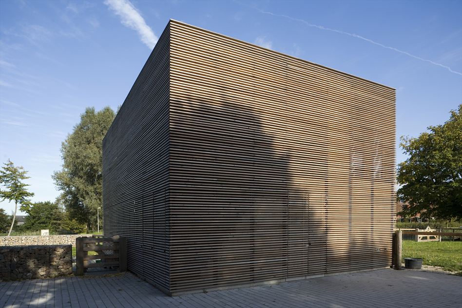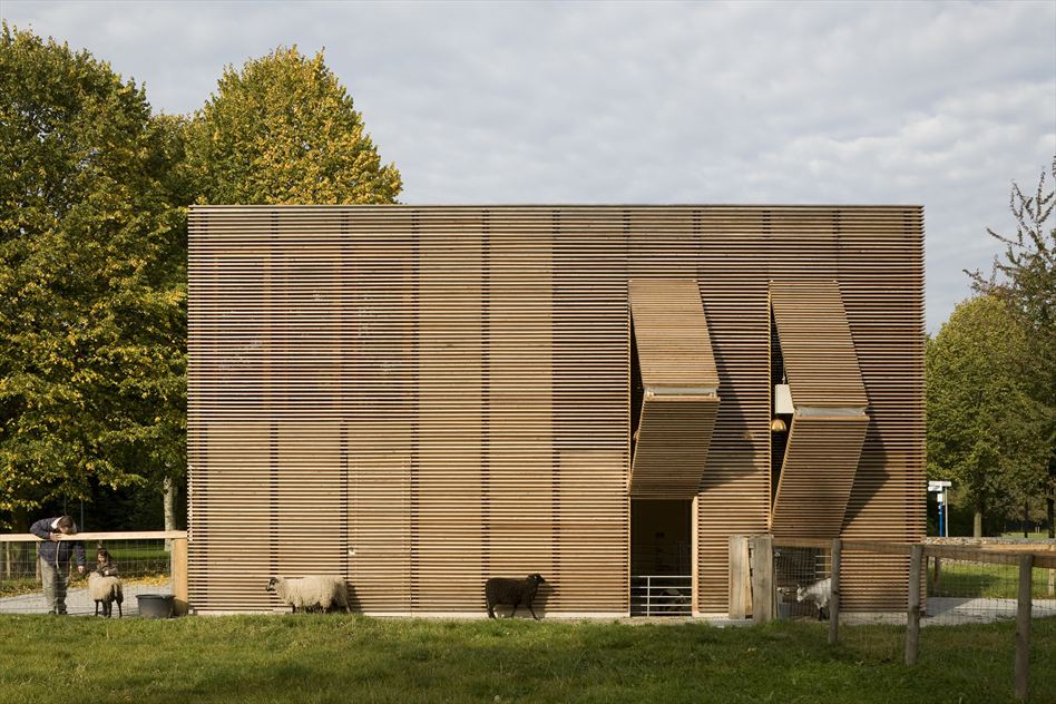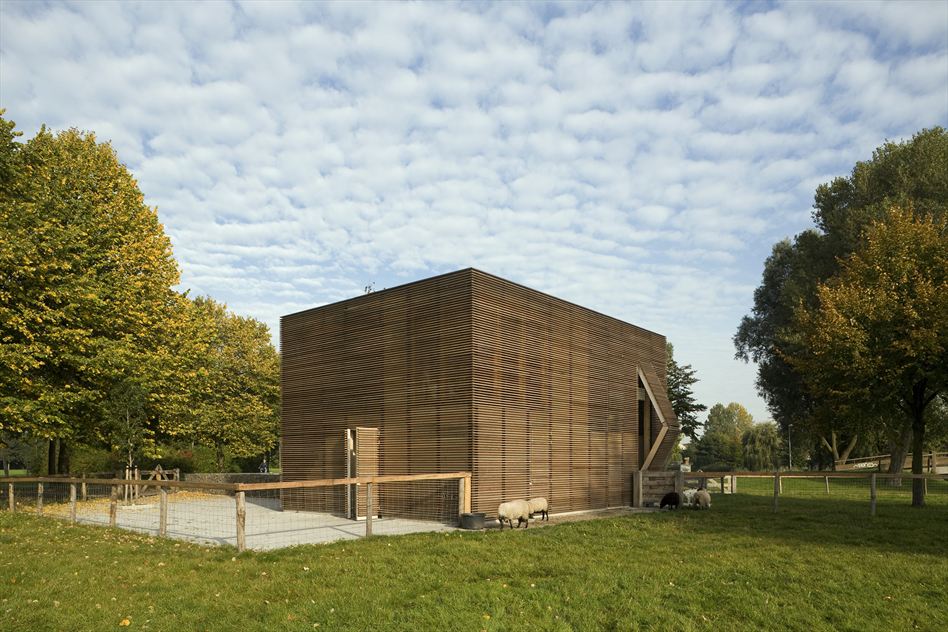 After dedicating our space to the unique architecture built for human beings across the globe, we thought it was fair to give some appreciation to our animal pals. Hey, our furry little friends need their comfort too! In Almere, England resides a delightful little home for farm animals. Designed by 70F Architecture, the structure is composed of a wooden box with an open façade that allows wind to easily ventilate the entire farm. Half of the petting farm is a stable while the other half includes storage, toilets and an office and more storage on the second floor. This Den Uyl park petting zoo is exposed to the environment with no doors and six shutters on different sides of the building. They open manually or automatically in the morning as a reaction to the morning sun and close by themselves when the sun goes down. At night, the animals learn easily when its time to be inside again.