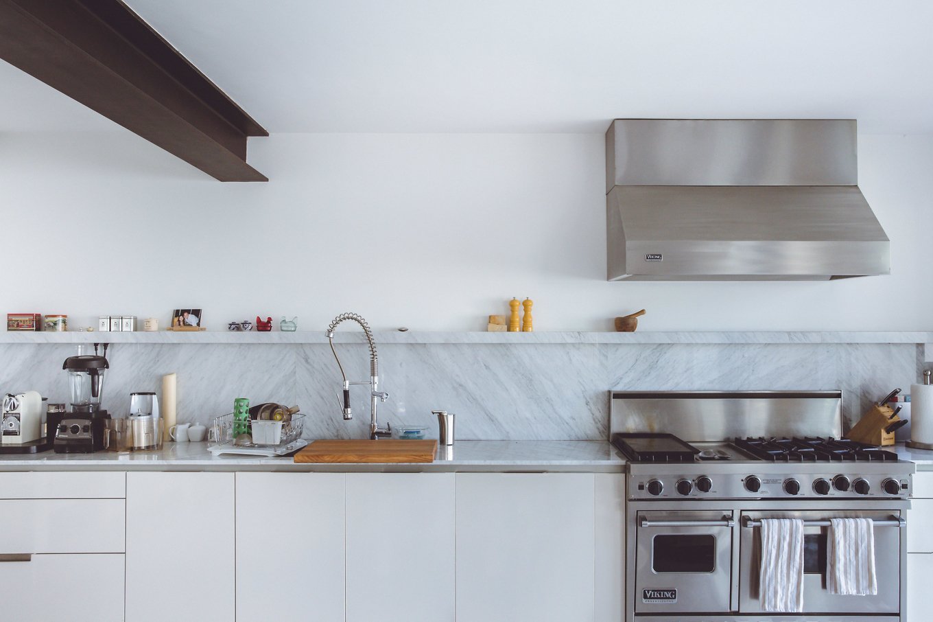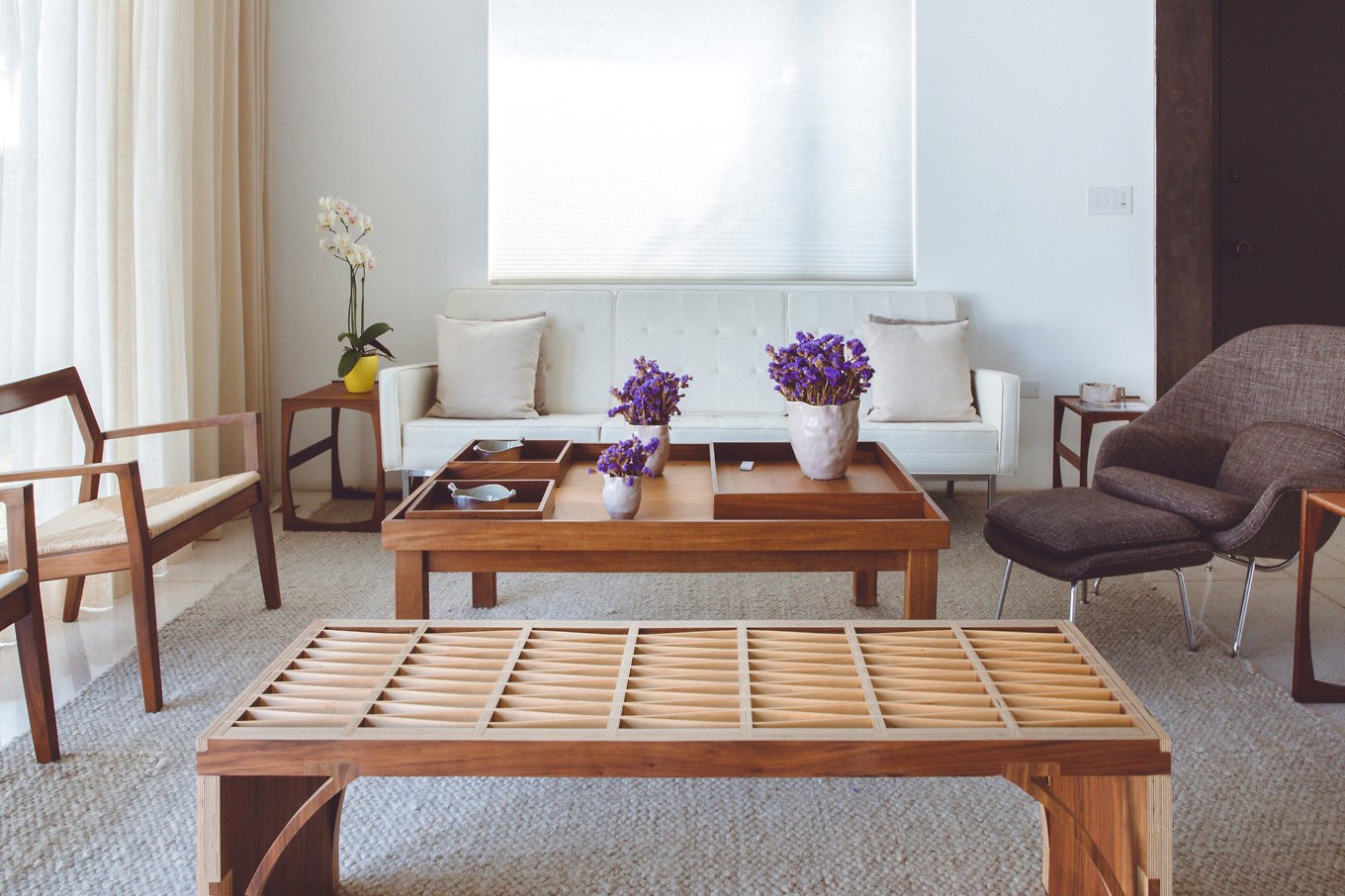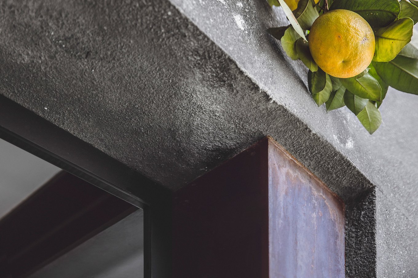 Stepping inside, visitors find bright and cozy living spaces that contrast the austere exterior. On the ground floor, there’s a kitchen, living room and service room, while the upper floor houses the bedroom, bathroom and studio. Throughout the home, white plaster walls, wooden furniture as well as pale, neutral colors create an airy ambience. In the garden, citrus trees and neatly cut grass provide a relaxing outdoor space protected from street noise and neighboring houses. Photography by 1826 Proyectos Fotográficos.