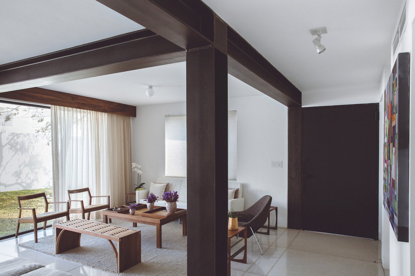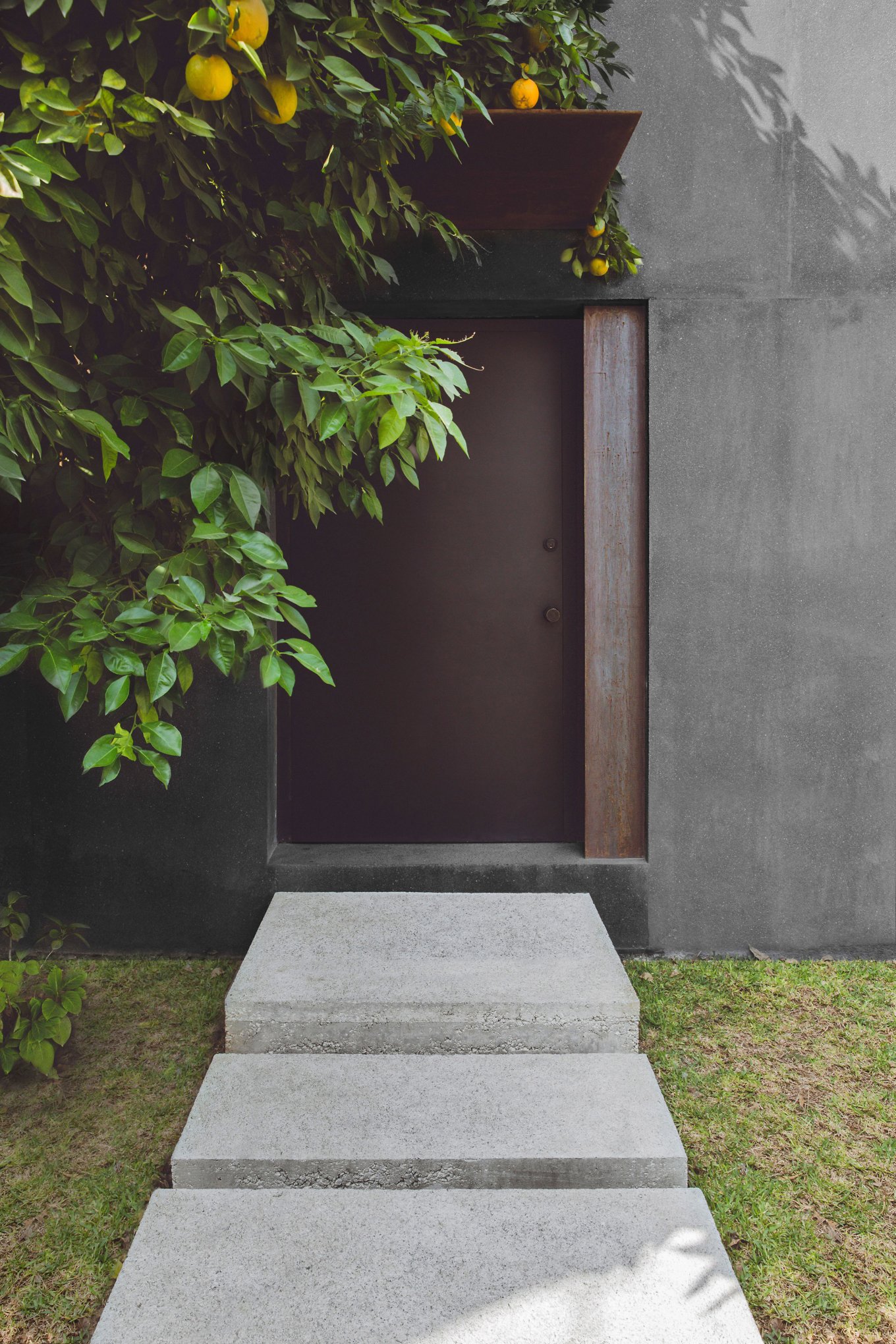 Located in Nuevo León, Mexico, the Doblado House designed by the Isauro Huízar Creative studio instantly stands out from behind the surrounding walls and the galvanized, perforated steel gate. The striking monolithic appearance, the textured and coarse surface of the black concrete and the large window openings give the house a distinctly modern and minimalist appearance. Based on an existing structure, the residence now features steel reinforcements to support an extra level, pedestrian and vehicle access, as well as a new garden.