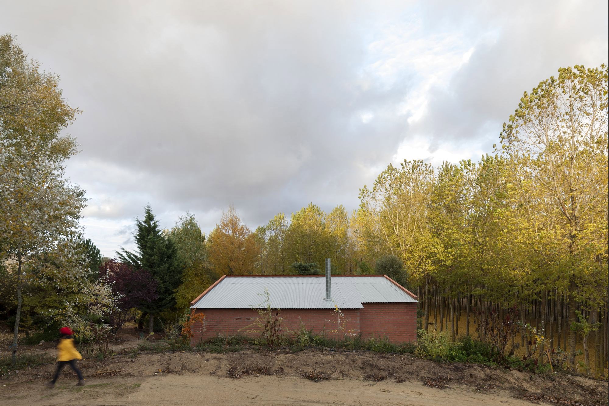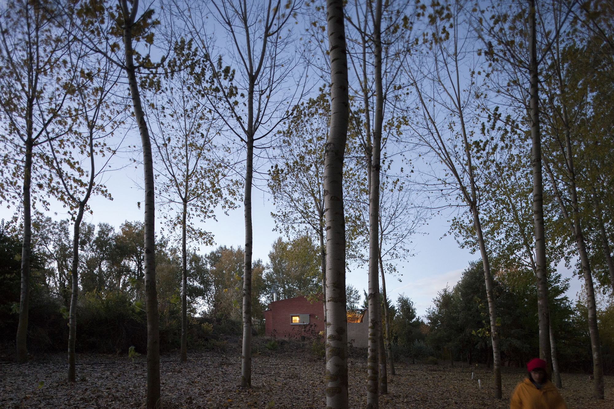 Fields of wheat and barley surround the plot, but the house stands in an area used to grow poplars. As a result, it offers a quiet retreat space in a verdant ecosystem. The team kept the double hollow brick walls of the building, but used straw bale to provide better insulation. The house also features concrete flooring and a metal roof. A collapsed section of the roof has created an inner courtyard, which the team preserved in order to create a vegetable garden.