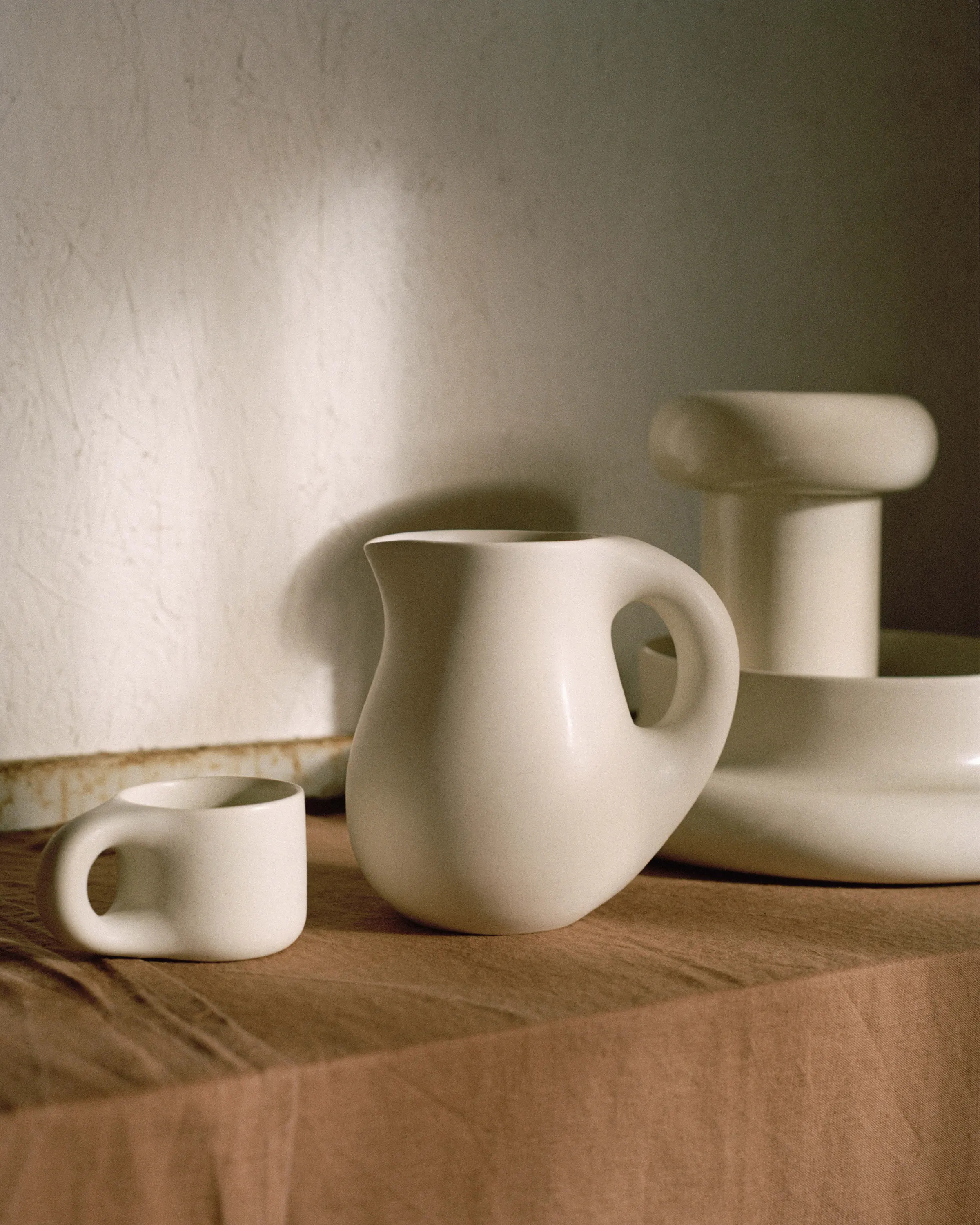 The Dough stoneware collection is no exception. All the models are hand-shaped in Toogood studio in East London and glazed by artisans in Portugal in two matte glazes: cream and charcoal. The collection comprises four essential pieces: a mug, a water jug, a bowl, and a platter, with two additional decorative pieces – a vase and a centerpiece – to complement the line. With their simple and strikingly rounded forms, subtle contours, and natural colors, the pieces celebrate the raw qualities of traditional ceramics evoking feelings of warmth and comfort, and the approachability of minimalist modern aesthetics. The soft, tactile, and comfortable sensibility of the collection paired with neutral tones is a continuation of an idea introduced with Toogood’s Puffy Lounge Chair in 2020. The latest line is a thoughtful and tasteful marriage of contemporary functionality and traditional craftsmanship, which offers a unique sensory experience and a homely feeling to the consumer. It is a true feel-good collection meant to bring joy to everyone’s home.