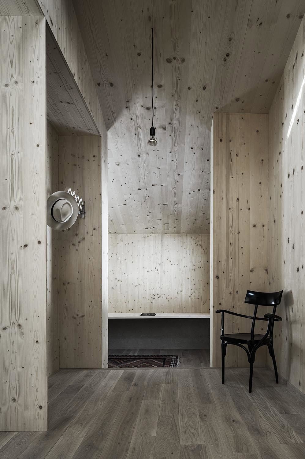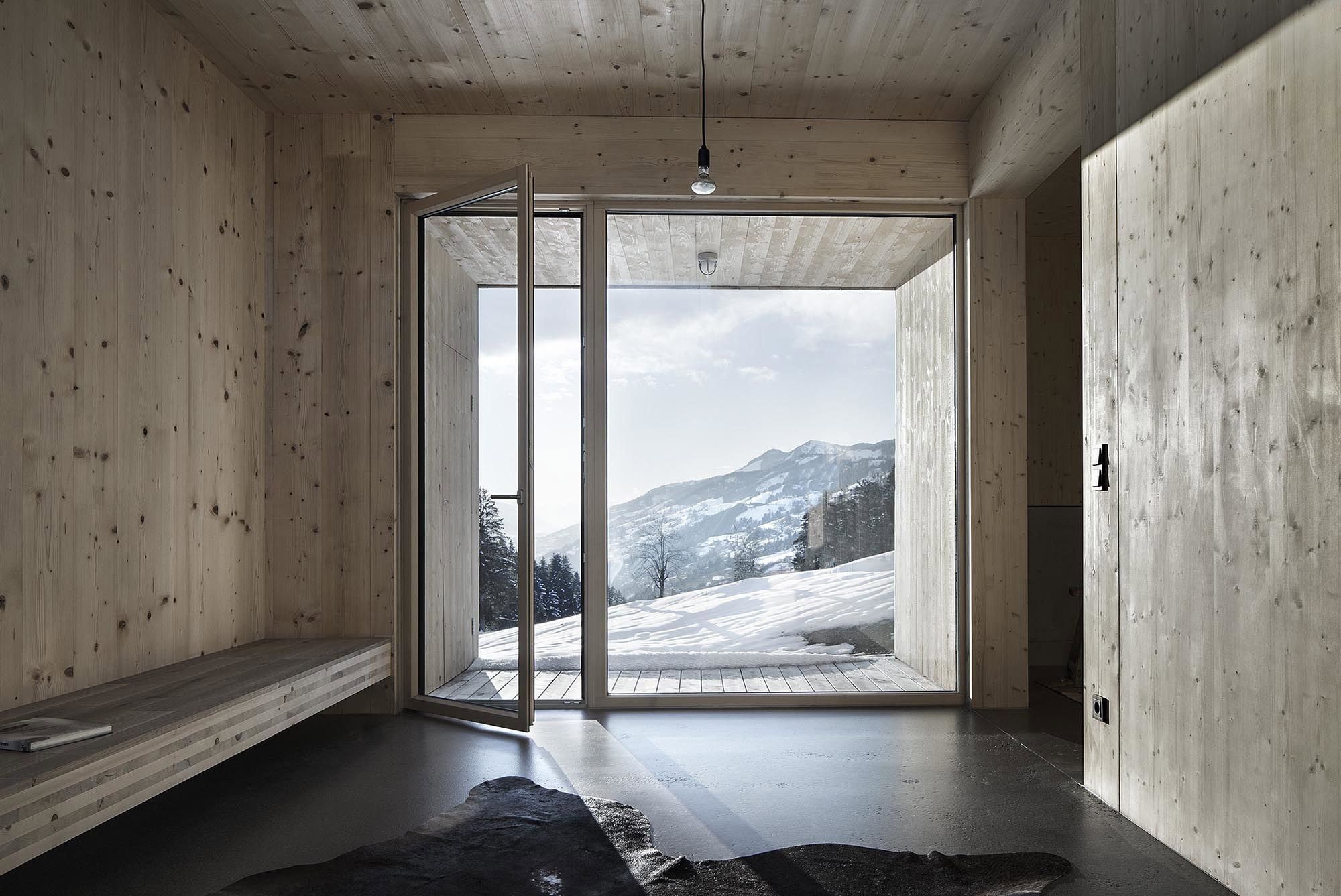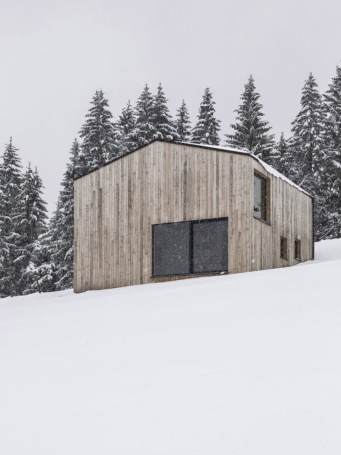 Located in the charming Embach mountain village in Austria, EFH Hochleitner by LP Architektur offers its owners a quiet retreat from the demands of city life. The minimalist design is inspired by rural architecture and blends in the breathtaking natural landscape. The minimalist cabin is built on a slope, providing a great view towards the village and the mountains, while a pine forest rises at the back of the structure. Rough sawn wood cladding and a simple fenestration create a clean design that perfectly combines the warmth and rustic appeal of vernacular architecture with the refined features of a modern home. The windows are made in different sizes to optimize both the amount of natural light reaching the interior and the views. Divided on different levels, all the living spaces are connected via a central staircase and a shelf unit that reaches the upper floor. The interior is made of wood and has a distinct ‘mountain cabin’ feel to it, while the minimal use of furniture and modern accents lend a touch of contemporary style and elegance to this beautifully simple retreat. Photography by Albrecht Imanuel Schnabel.